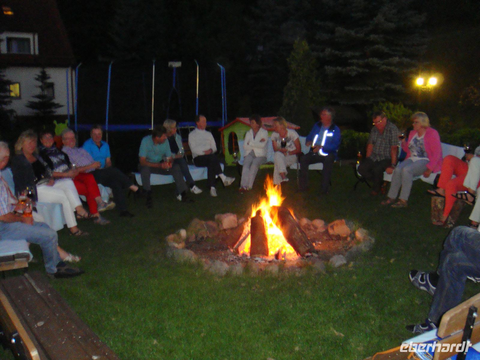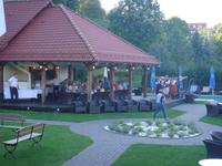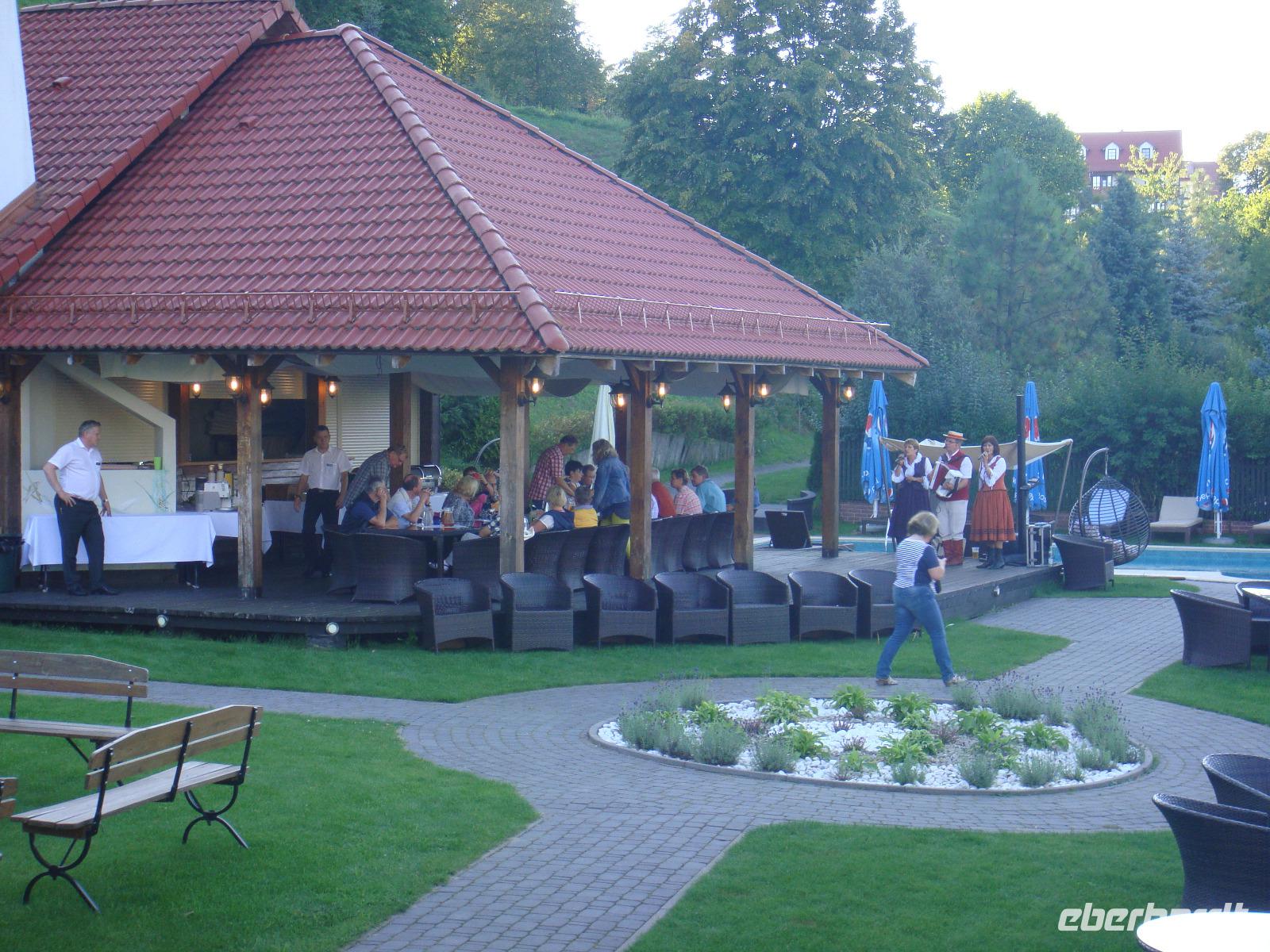 3 Musiker empfangen uns im Garten des Hotels. Dort ist schon der Grill gut belegt und wir lassen es uns schmecken. Ein toller Sommerabend bei gutem Essen, Musik und Tanz und natürlich fehlt auch ein Gläschen Krupnik nicht.
