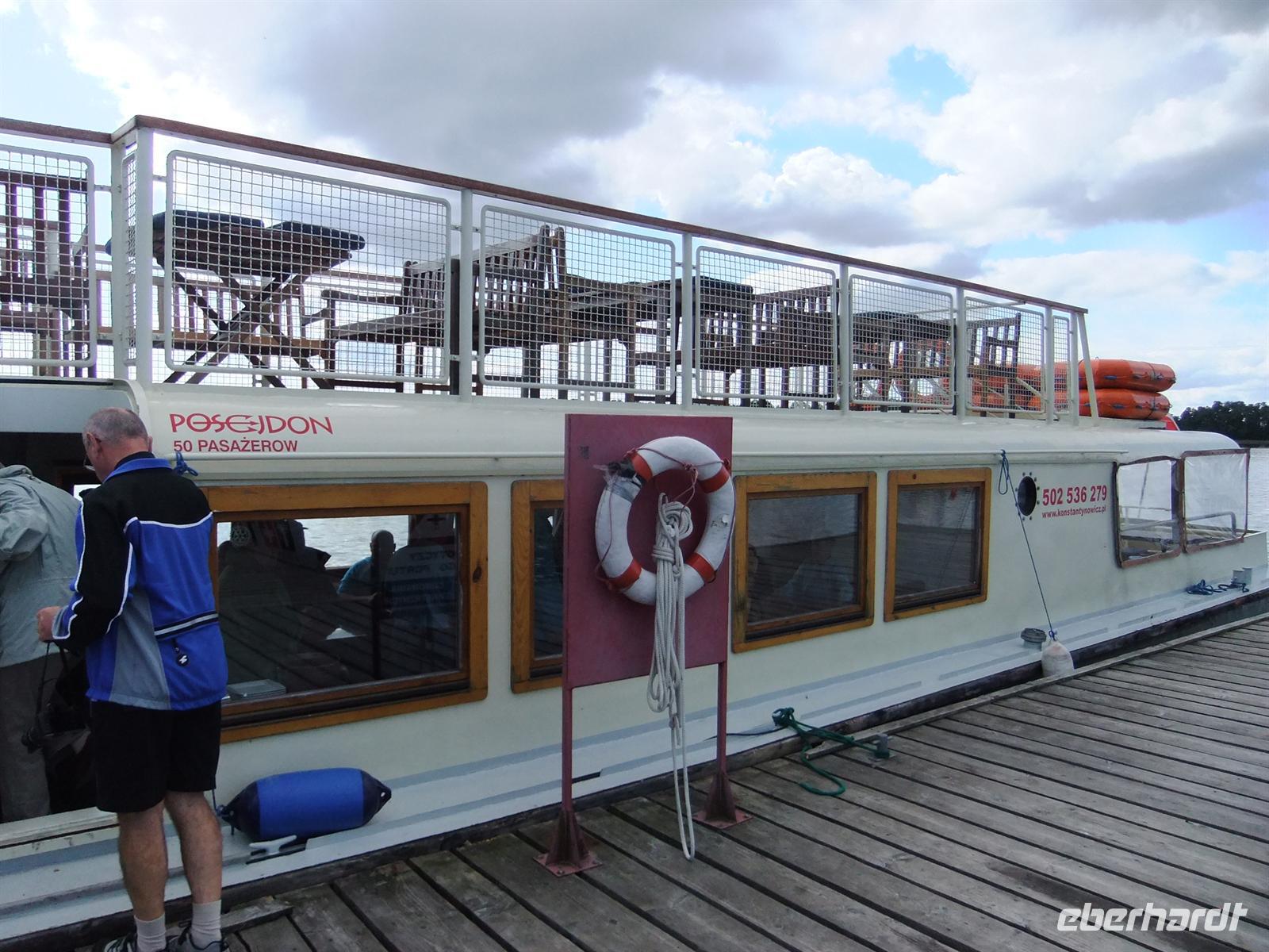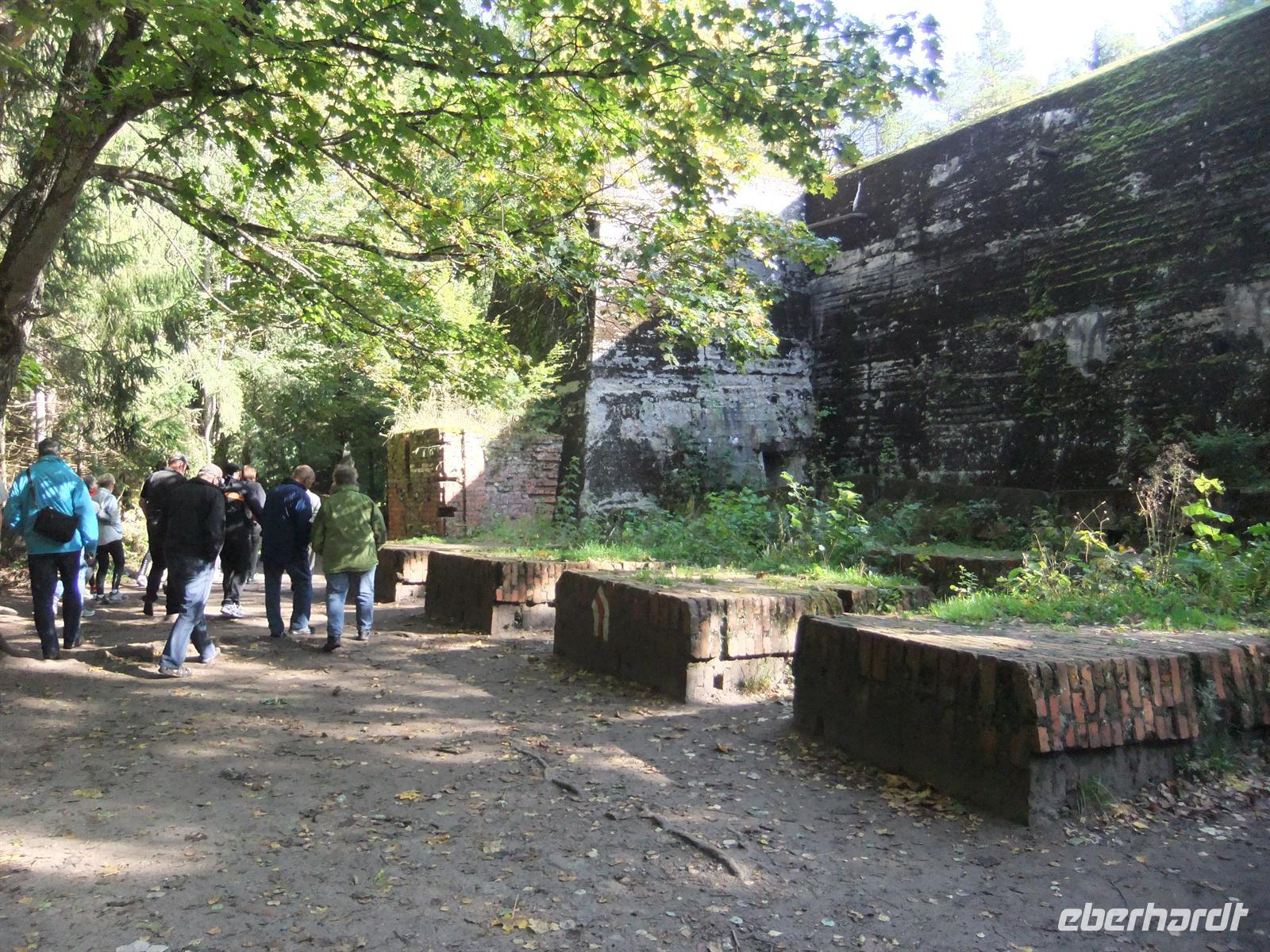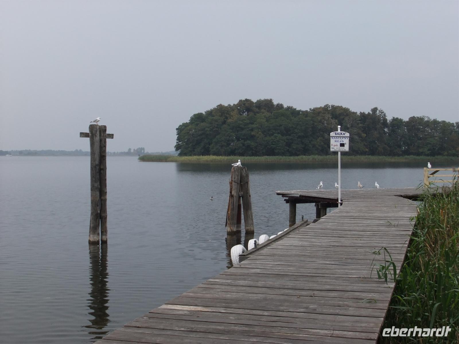 Am nächsten Tag fuhren wir mit dem Bus zunächst zur Wolfsschanze. Dort erwartete uns ein örtlicher Führer und erklärte uns alles Wissenswerte zum Hauptversteck Hitlers. Die angekündigten Mücken verkrochen sich vor lauter Kälte und so konnten wir ohne viel Geklatsche auf den Spuren geschichtsträchtiger Personen wandeln. Nach einer interessanten Führung starteten wir unsere heutige Etappe mit dem Rad. Wieder entlang von allerlei sandigen Wegen, aber auch Asphaltstraßen radelten wir heute ca. 21 km bis nach Steinort. Während Ingo (unser Busfahrer und ich) unsere Räder einluden, erläuterte Gosia zunächst den dortigen Herrensitz, bevor wir kurze Zeit später unser für heute gemietetes Boot/Schiff enterten. Wir schipperten dann ca. 2 Stunden auf dem Doben-See vorbei an der Komoraneninsel und genossen neben der herrlichen Sonne auch den leckeren Zander als Mittag. Gut gestärkt, unter anderem auch mit leckeren Kruppnik/Bärenfang, landeten wir in Lötzen. Unser Bus holte uns ab und chauffierte uns direkt in das Zentrum. Hier hatten wir noch ein wenig Freizeit zum Bummeln, bevor es zurück ins Hotel Anek nach Sensburg ging.