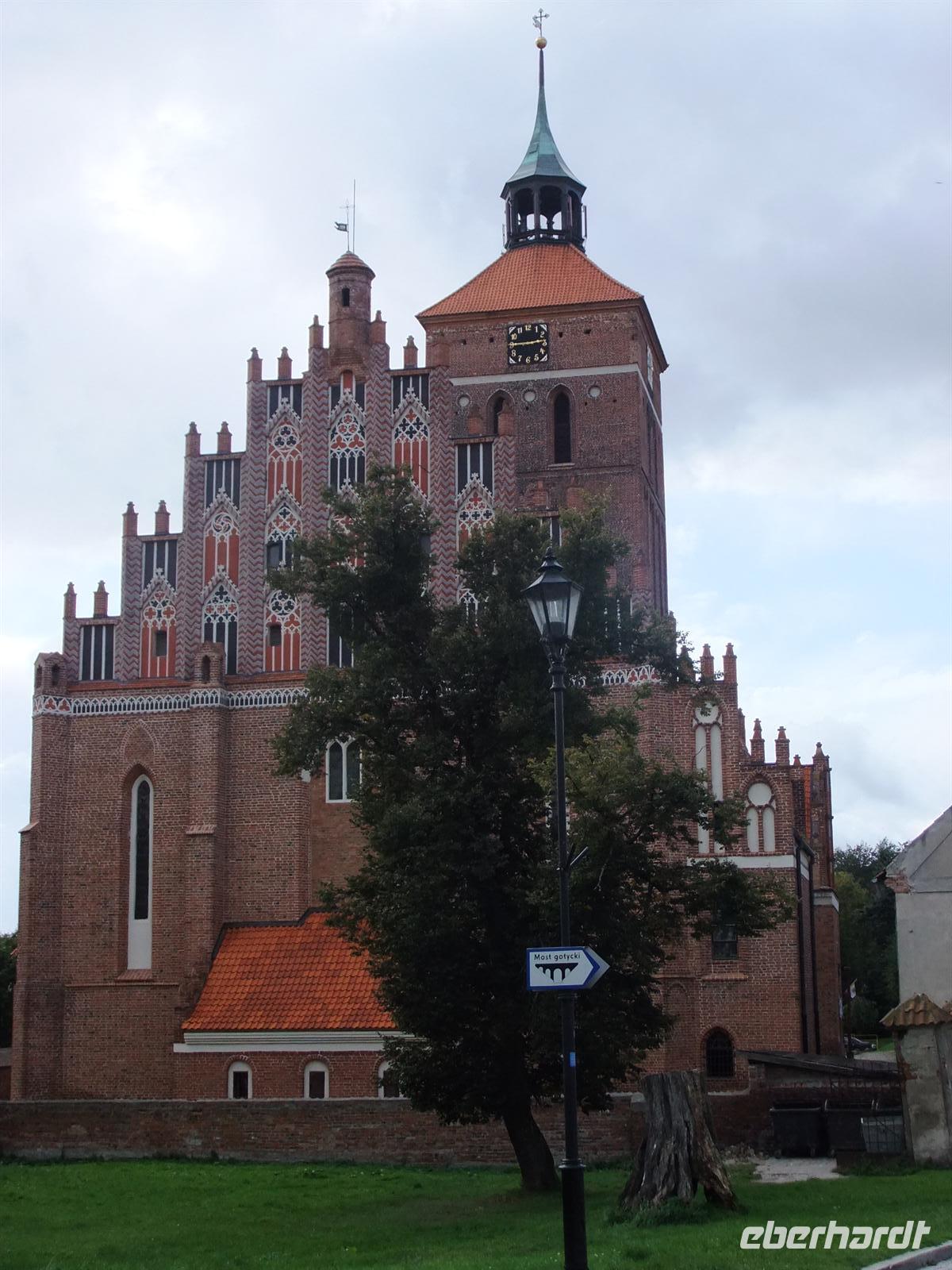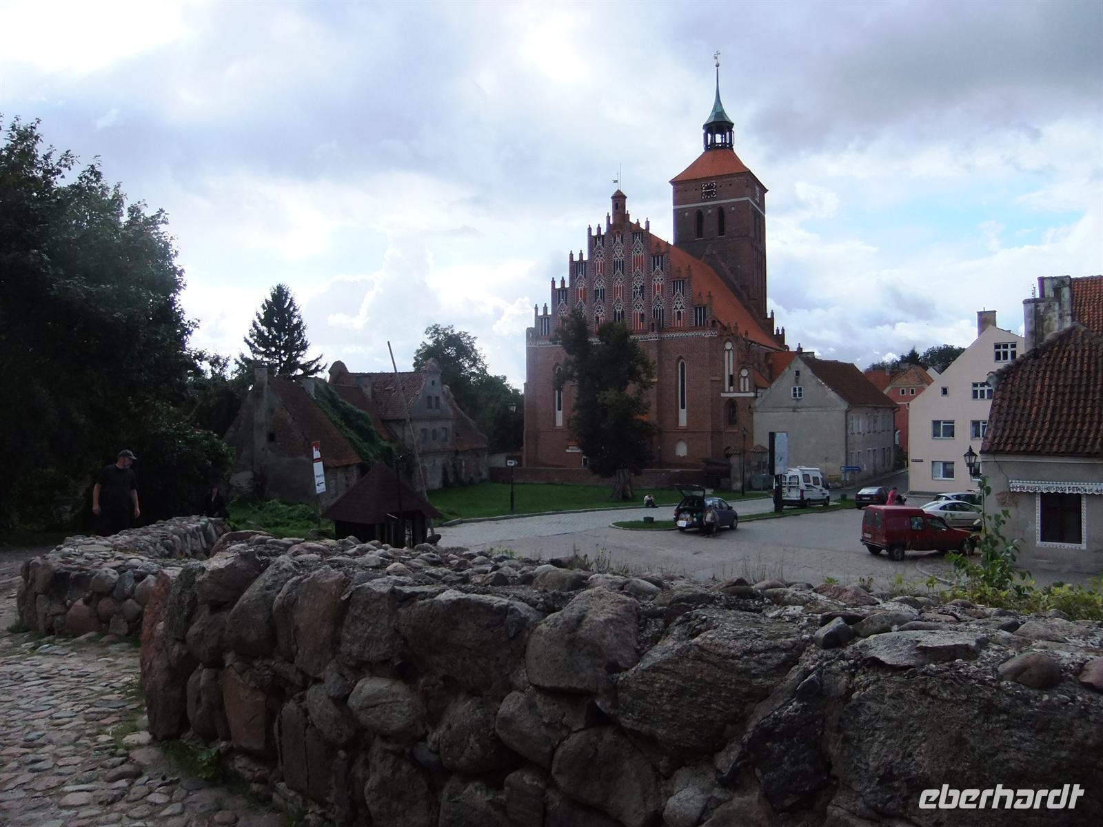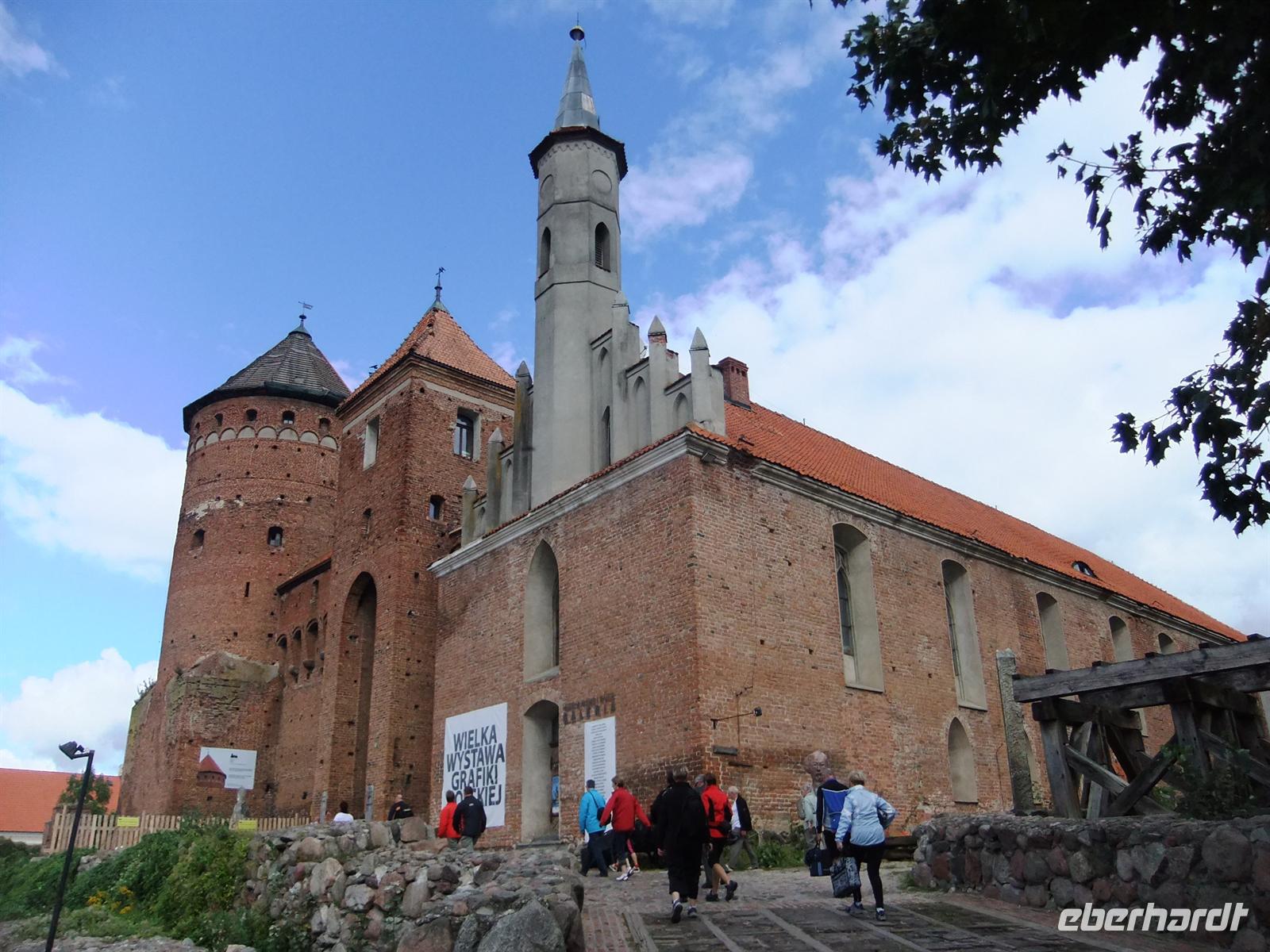 Der erste Radeltag führte uns nach Swita Lipka, wo uns ein Orgelkonzert erwartete. Der erste Tag hatte es in sich, denn hier wurden sich erst einige bewusst, dass die Masuren keine Mecklenburgische Seenplatte und somit sehr sandig und hügelig sind. Als Belohnung gab es dann die typisch polnischen und sehr leckeren Piroggen zum Mittagessen. Nach dieser Stärkung mussten noch 6 km geradelt werden und unser Tagesziel, Rössel, war erreicht. Hier besichtigten wir die Burg und ließen uns auch eventuell einen Kaffee schmecken. Nach nur 30 Tageskilometern war das unseren Sportlern noch zu wenig. Und so beschlossen wir (also 7 Gäste von 22, Gosia und ich) eine andere Strecke zurück zum Hotel zu fahren. Diese führte uns dann nur noch über Asphalt und nicht über Sandwege, beherbergte aber mehr Hügel. In einem rasanten Tempo strampelten wir noch einmal 35 km ab und erreichten unser Hotel noch rechtzeitig zum Abendessen. Geschafft aber zufrieden ließen wir uns das Abendessen schmecken.