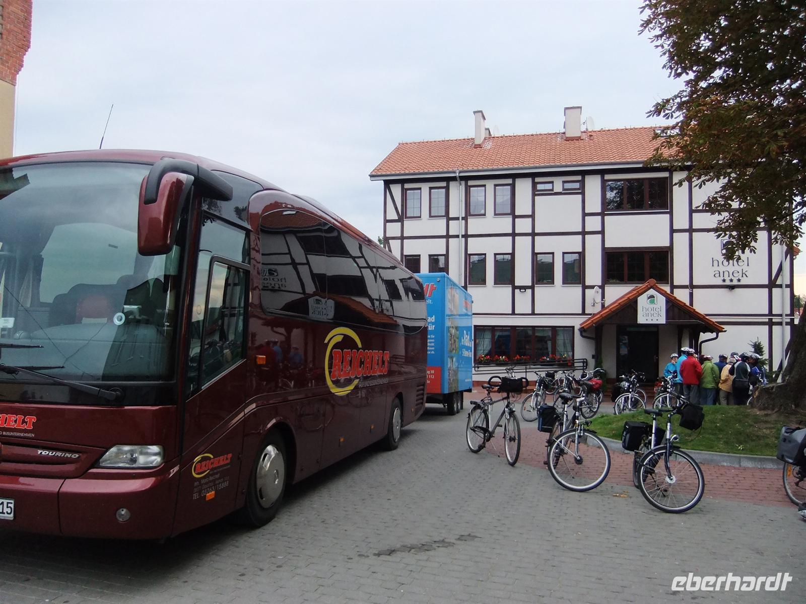 Noch am Vormittag starteten wir wieder mit unserem Bus und Radanhänger in Richtung Masuren. Unser heutiges Ziel: Mragowo/Sensburg. Wir erreichten das Hotel Anek, welches unser zu Hause für die nächsten 3 Nächte war, gegen 17:00 Uhr. Die einmalige Lage direkt am See machte die Hellhörigkeit der Zimmer wieder wett. Am Abend, zum gemeinsamen Abendessen begrüßte uns schließlich unsere örtliche Reiseleiterin Gosia.