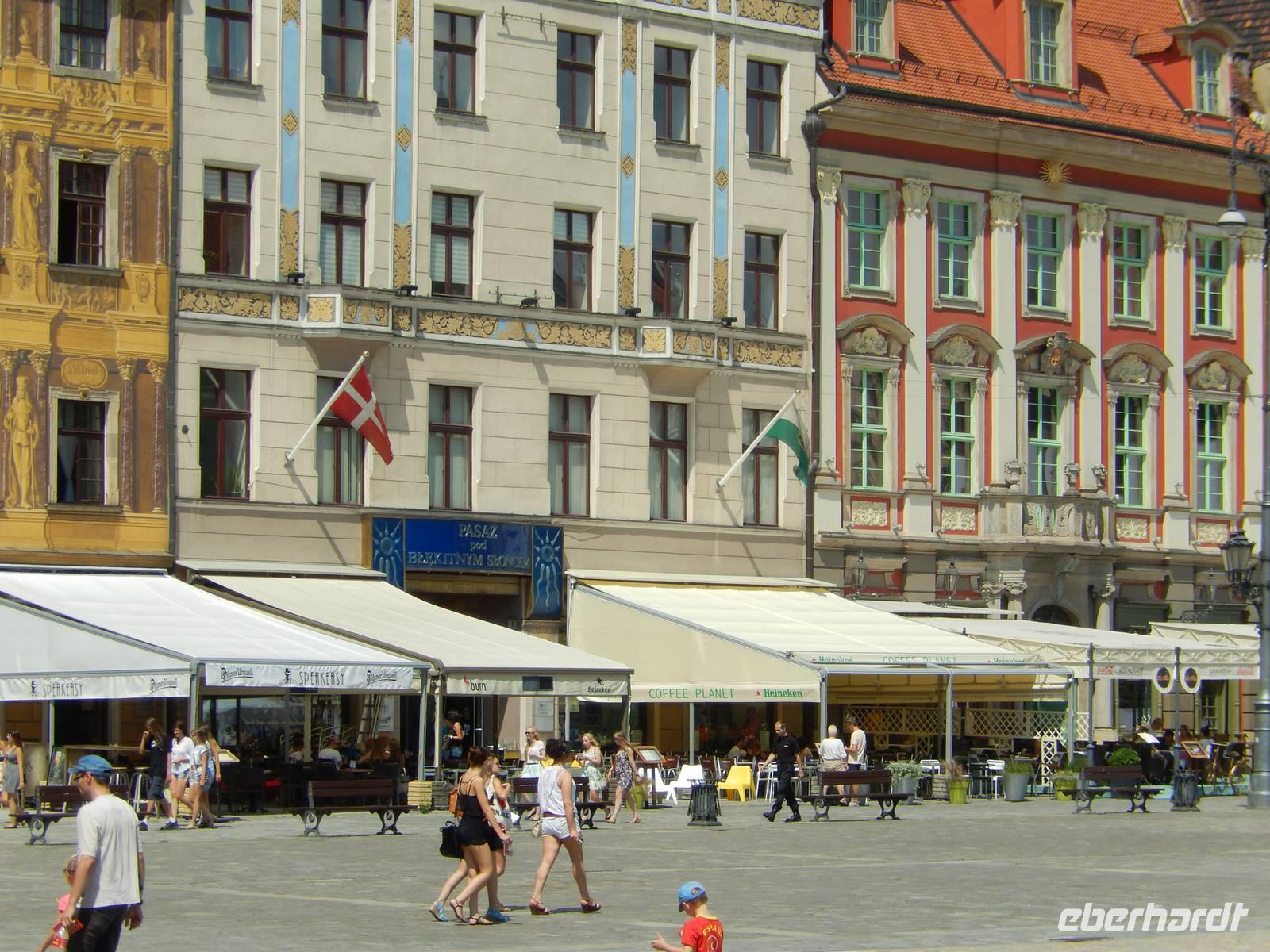 Nach der Ankunft im Hotel, der Begrüßung unserer mit em PKW angereisten Gäste und dem Bezug unserer Zimmer unternahmen wir individuell mit dem Schirm in der Hand einen ersten Ausflug in die Stadt. Nur rund 100 Meter waren zu gehen und schon standen wir mitten auf dem Rynek, dem Breslauer Markt.