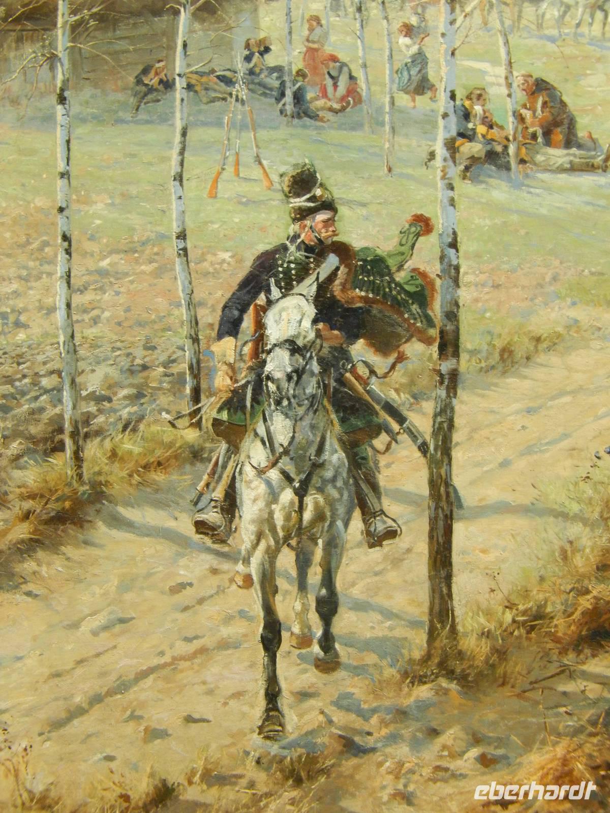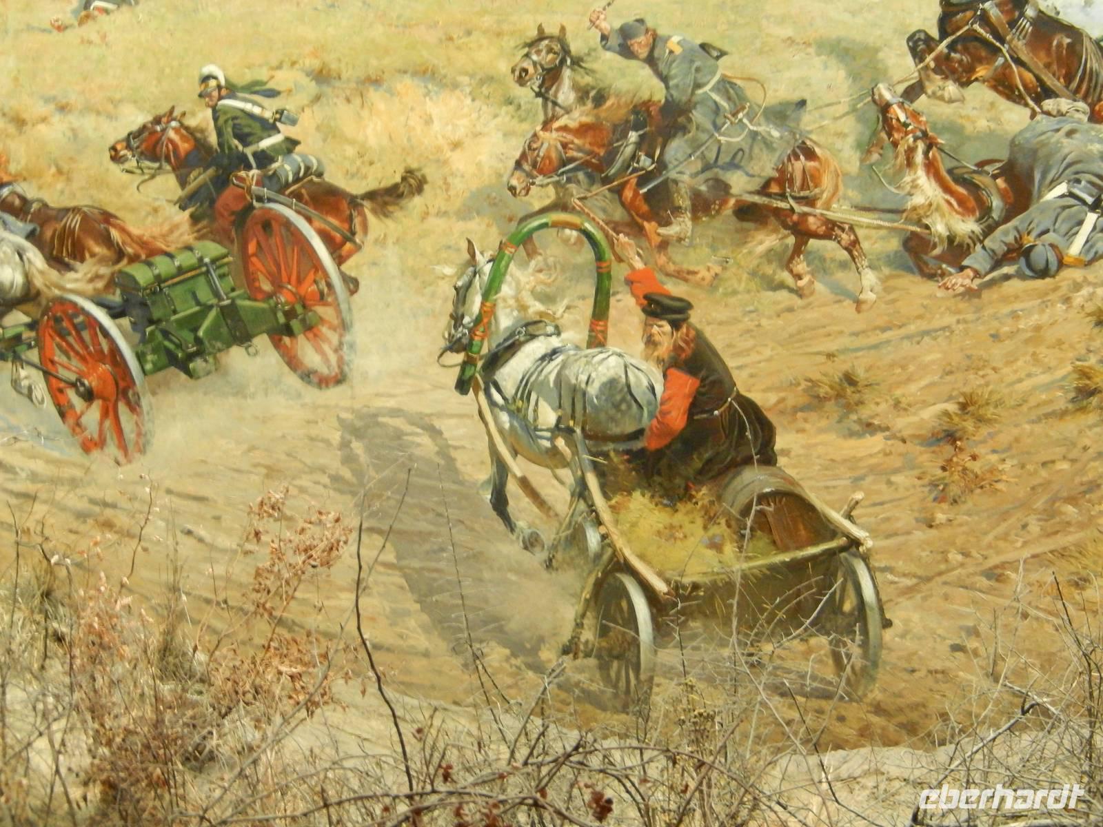 Gespannt folgten wir dort erst der Geschichte seiner Entstehung, der Rettung des gigantischen, über 140 Meter breiten und rund 14 Meter hohen Werkes, das heute jedoch nicht nur ein Bild und ein Symbol des Freiheitskampfes der Polen gegen die Russen ist, sondern ebenso mit echten Komponenten, Sanddünen, alten Wagen, Waffen, Gestrüpp ergänzt und damit noch viel realistischer wurde, als das ursprüngliche Panorama, ehe wir uns mit einem deutschsprachigen Audioguide die eigentlich dargestellte Geschichte der Schlacht zwischen Polen und Russen anschauten. Ja, dieses Panorama kann sich sehr wohl mit jenen eines Herrn Asisi oder Tübke messen und ist doch schon über 120 Jahre alt.