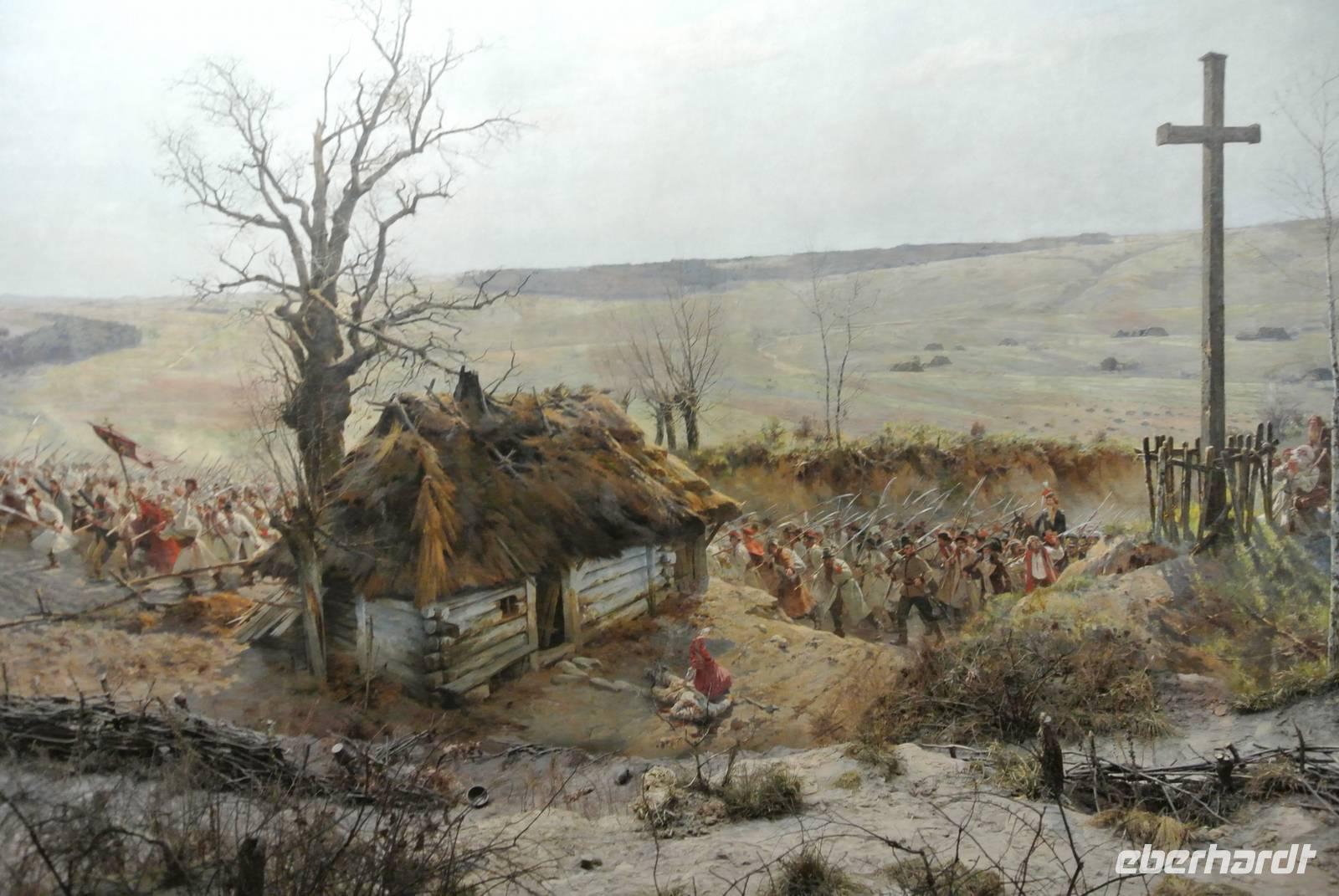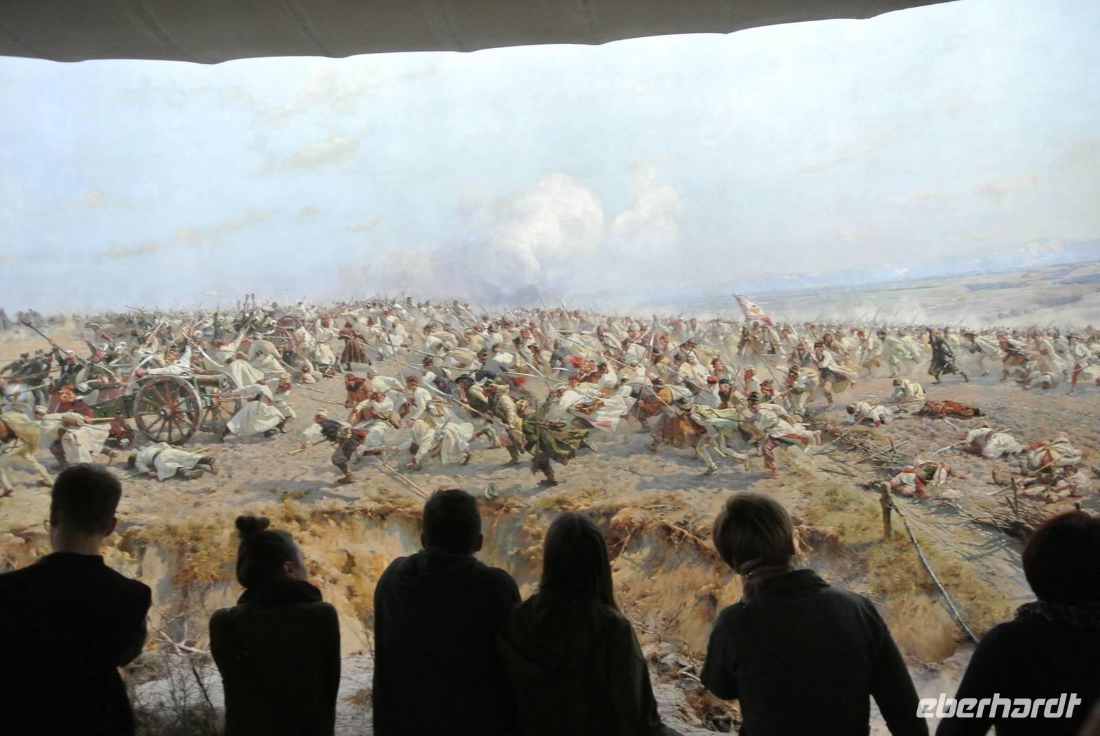 Um 19:40 Uhr machten wir uns deshalb auf den flotten Spaziergang zum Panorama Raclawice, dem einzigartigem Rundgemälde über die Schlacht zwischen der polnischen Bauernarmee unter dem Nationalhelden Tadeusz Kosciuszko und der russischen Armee. Dieses 42 Meter lange und 15 Meter hohe Ölgemälde haben wir bis 20:35 Uhr mit einem deutschen Audio Guide bewundert.