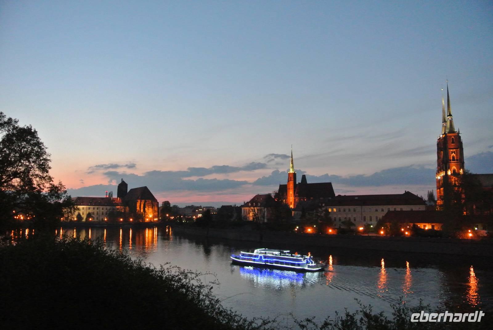 Danach machte der Reiseleiter einen Spaziergang zur Aussichtsplattform gegenüber des Panoramas mit herrlichem Blick auf die abendliche Dom-Insel und die Oder.