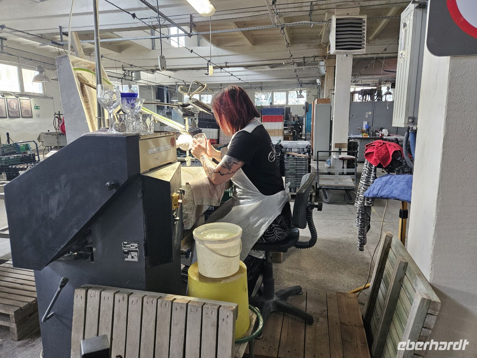 In den 1870er bis zum Beginn des zweiten Weltkriegs war Schlesien eine besonders wirtschaftsstarke Region. Zu den wichtigsten Wirtschaftszweigen gehörte vor allem der Braunkohleabbau, der in Katowice sein Hauptzentrum hatte. Weitere wichtige Rohstoffe, die hier produziert und weiterverarbeitet wurden, waren Beton, Metall und Glas. Aus diesem Grund war unser erster Halt die Glashütte „Julia“ in Piechowice – einem Stadtteil von Jelenia Gora (Hirschberg). Die Geschichte des Betriebs reicht bis ins 19. Jahrhundert zurück. Die Glashütte ging aus zwei der größten Glashersteller hervor: der Josephinenhütte aus Szklarska Poreba (Schreiberhau) und der Glashütte von Fritz Heckert. Zu den wirtschaftlichen Hochzeiten gab es in der Region drei Glashütten. Die Hütte hat Vertreibung, Kommunismus und einen amerikanischen Betreiber überstanden. Heute sind die USA und Asien die wichtigsten Abnehmer. Über 80 % der Ware wird ins Ausland exporteiert. Bei einem Rundgang haben wir erfahren, wie die einzelnen Stücke zunächst entworfen werden und dann über das Brennen, Reinigen, Schleifen und Gravieren zu dem den gewünschten Produkt aus Glas werden.