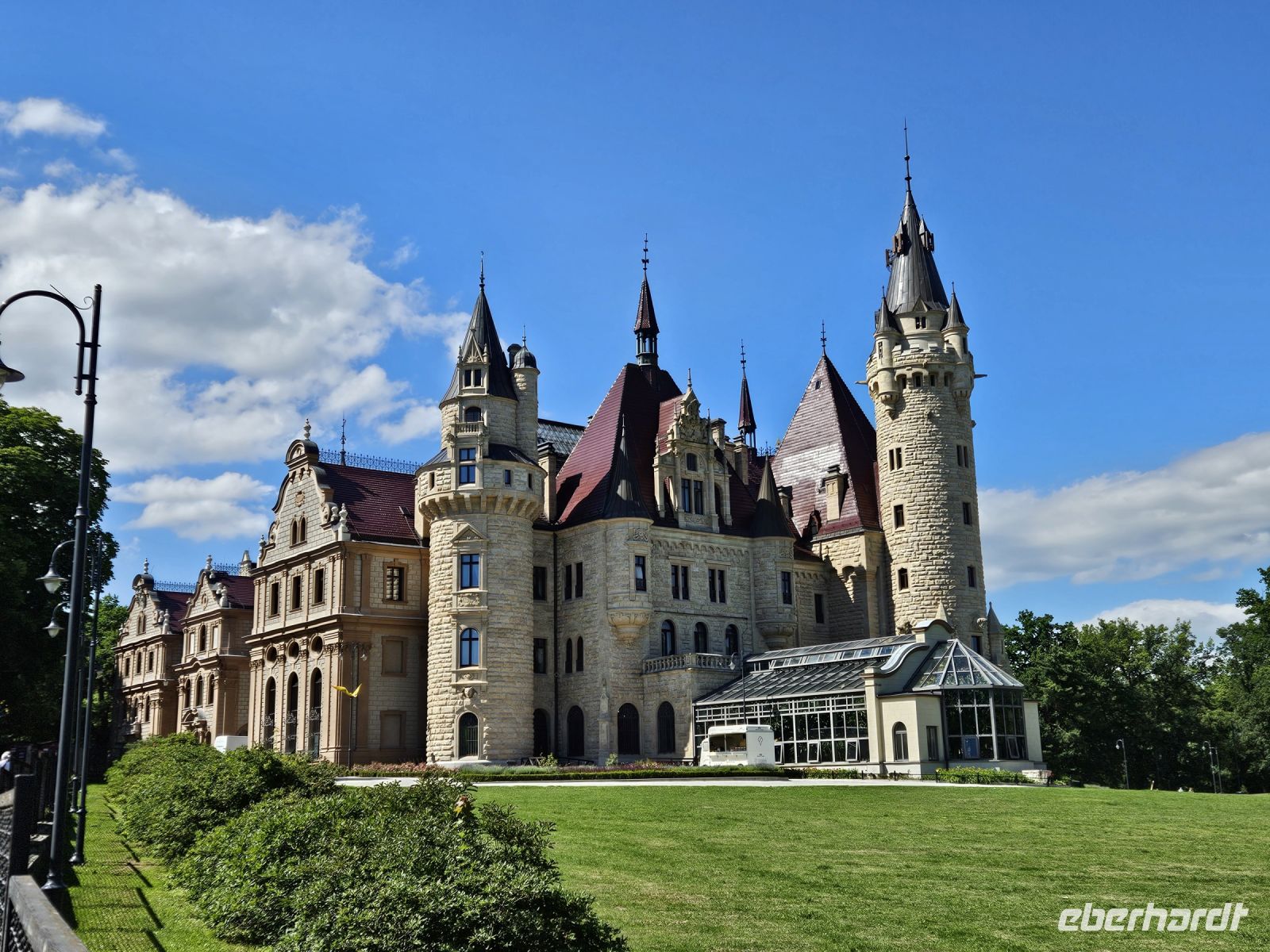 Der älteste Teil des Schlosses in Moschen stammt aus dem Anfang des 18. Jahrhunderts und wurde im barocken Stil errichtet. 1866 kaufte der oberschlesische Magnat Hubert von Tiele-Winckler die Anlage. Aber erst sein Sohn Franz Hubert ließ sie nach einem Brand im Jahre 1896 in zu dem Schloss in seiner jetzigen Form umbauen. Der Ostflügel wurde im Stil der Burgenromantik mit Erkern und Rundtürmen neu errichtet. Dieser Umbau wurde im Jahr 1914 abgeschlossen. Das Schloss hat 99 Türme und 365 Zimmer haben. Im Vergleich zu den Schlössern, die wir bisher während dieser Rundreise besichtigt hatten, war dieses sehr modern eingerichtet und vereinte verschiedene Stile und Elemente.