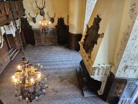 Historiker nehmen an, dass sich zu Kriegszeiten dort die geheime Schule der Chiffriere der Abwehr befand. Nach dem Krieg wurde im Schloss ein Zentrum für die Offiziere der polnischen Abwehr eingerichtet. Während unserer Führung haben wir unter anderem den Festsaal, die Bibliothek, das Schaf- und das Arbeitszimmer besichtigt. Die Wände und Böden waren mit dunklem Holz verkleidet, und an den Decken fanden sich Stuckverzierungen und Kronleuchter. Während der Besichtigung, konnte man sehr gut nachvollziehen, warum das Schloss bereits Drehort für viele polnische Filme war.