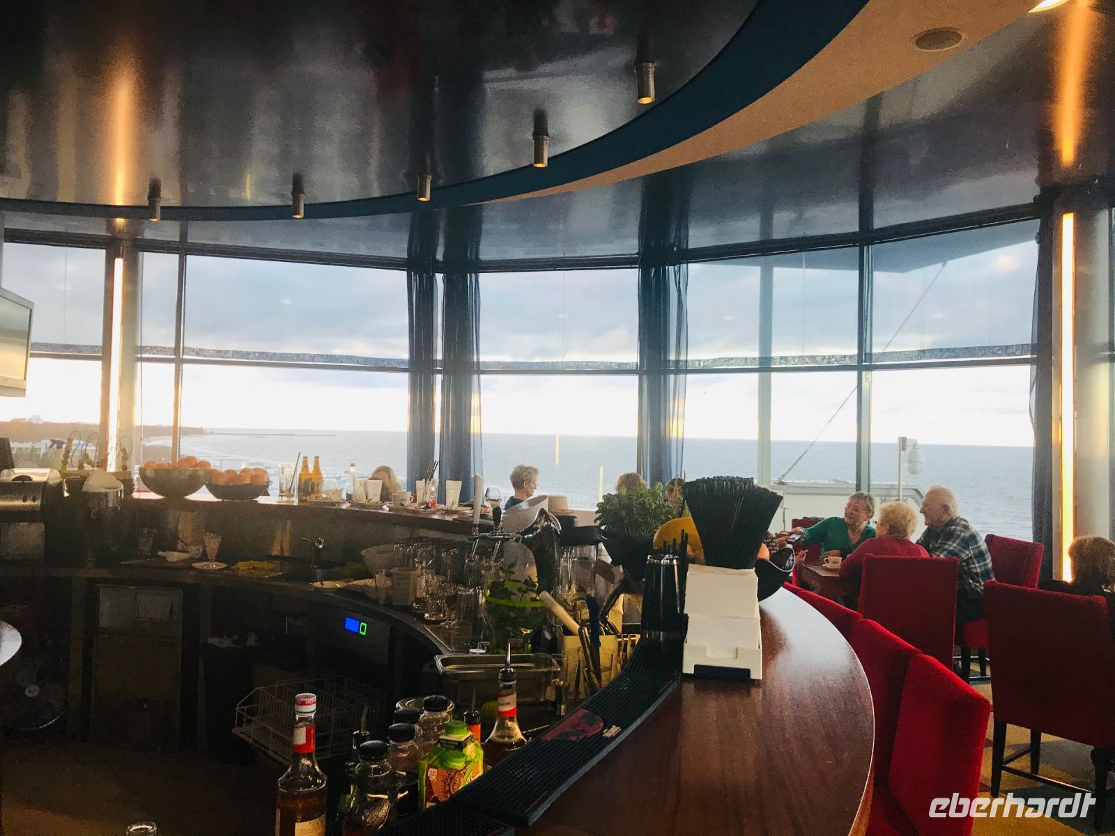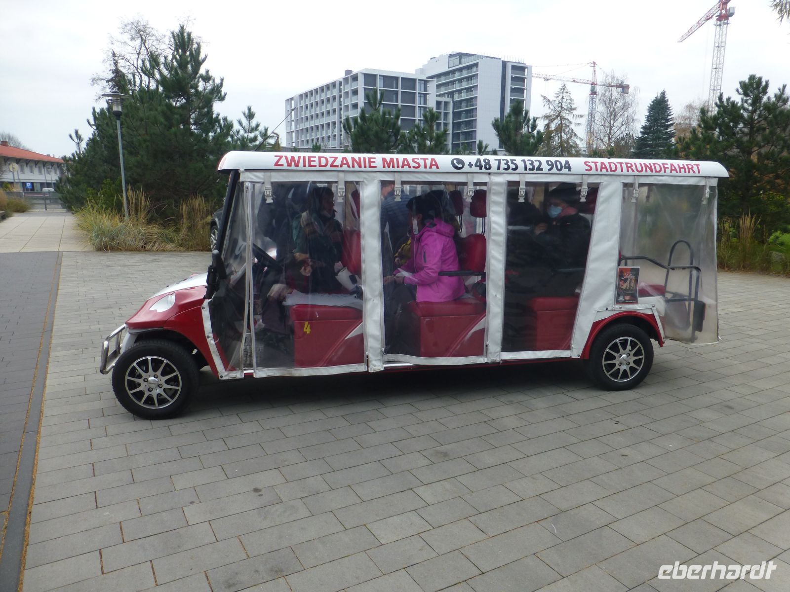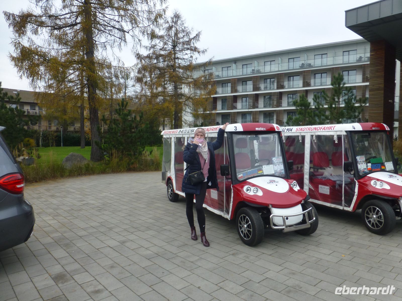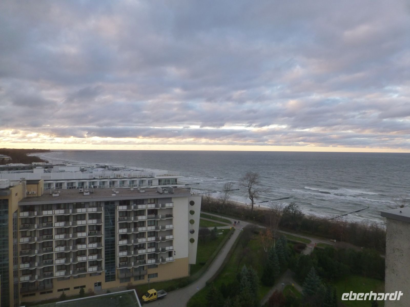 Die Freizeit nutzen wir, um im nahegelegegen Einkaufszentrum ein paar Souvenirs zu shoppen oder um eine Stadtrundfahrt in Kolberg zu unternehmen. Die kleinen Elektrobusse holen uns direkt am Hotel ab und so erkunden wir mit einer örtlichen, Deutsch sprechenden Reiseleitung in einer Stunde die Stadt. Eine gelungene Abwechslung zu unserem ursprünglichen Programm und sehr empfehlenswert. Einen Nachmittag nutzen wir, um zum Kurhotel "Arka Medical & Spa" zu laufen und dort im Drehrestaurant "Eleven" im 11. Stock einzukehren, um einen schmackhaften Kaffee und ein leckeres Stück Käsekuchen oder einen Apfelkuchen zu probieren. Nebenbei können wir im Drehmodus auch einen wunderbaren Sonnenuntergang beobachten.