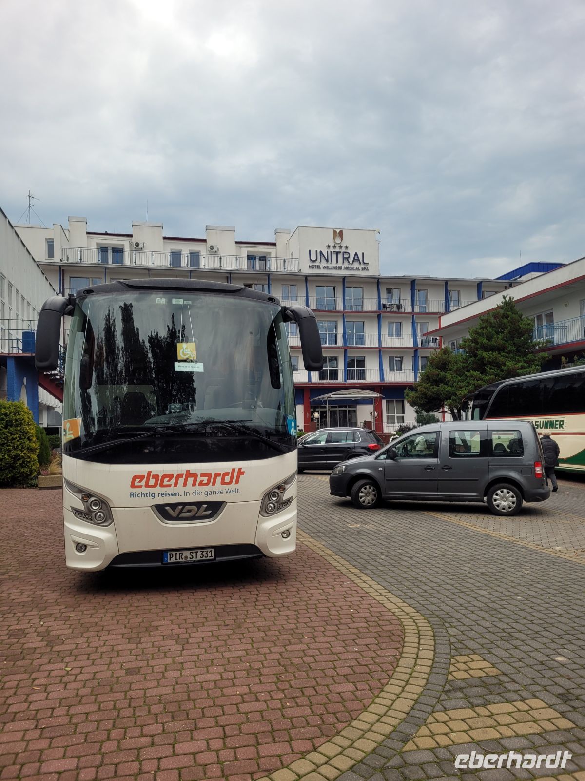 Pünktlich um 7:30 Uhr rollte der Bus von der Firmenzentrale in Kesselsdorf. Leider verspätete sich (durch Irrungen und Wirrungen) der Zubringer in Döbeln um eine Stunde, so dass auch die Gäste in Leipzig und Dessau warten mussten. Mit erstaunlicher Gelassenheit und Ruhe wurde die Verspätung toleriert und wir fuhren über den Berliner Ring nordöstlich unserem Ziel entgegen. Kurz hinter der Grenze war zum zweiten mal Rast und Geld wurde getauscht. Der Verkehr wurde spürbar ruhiger und dank unserem tüchtigen Chauffeur Jan erreichte die Reisegruppe 17:00 Uhr das Hotel Medical SPA Unitral in Mielno. Schnell wurden die Zimmer bezogen und ein fürstliches Abendessen konnte eingenommen werden.