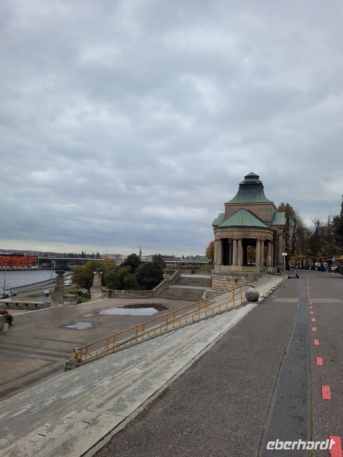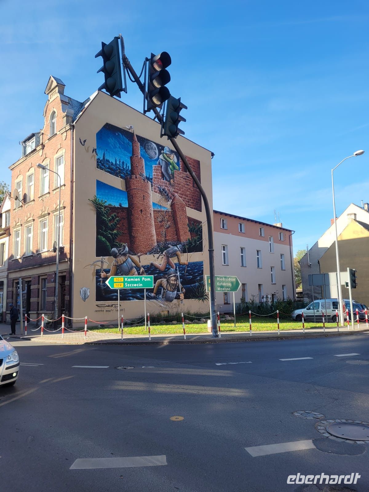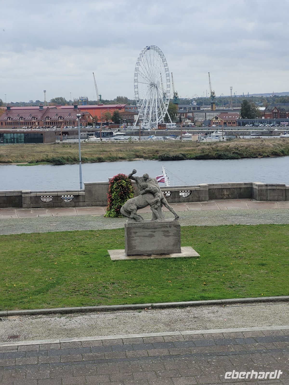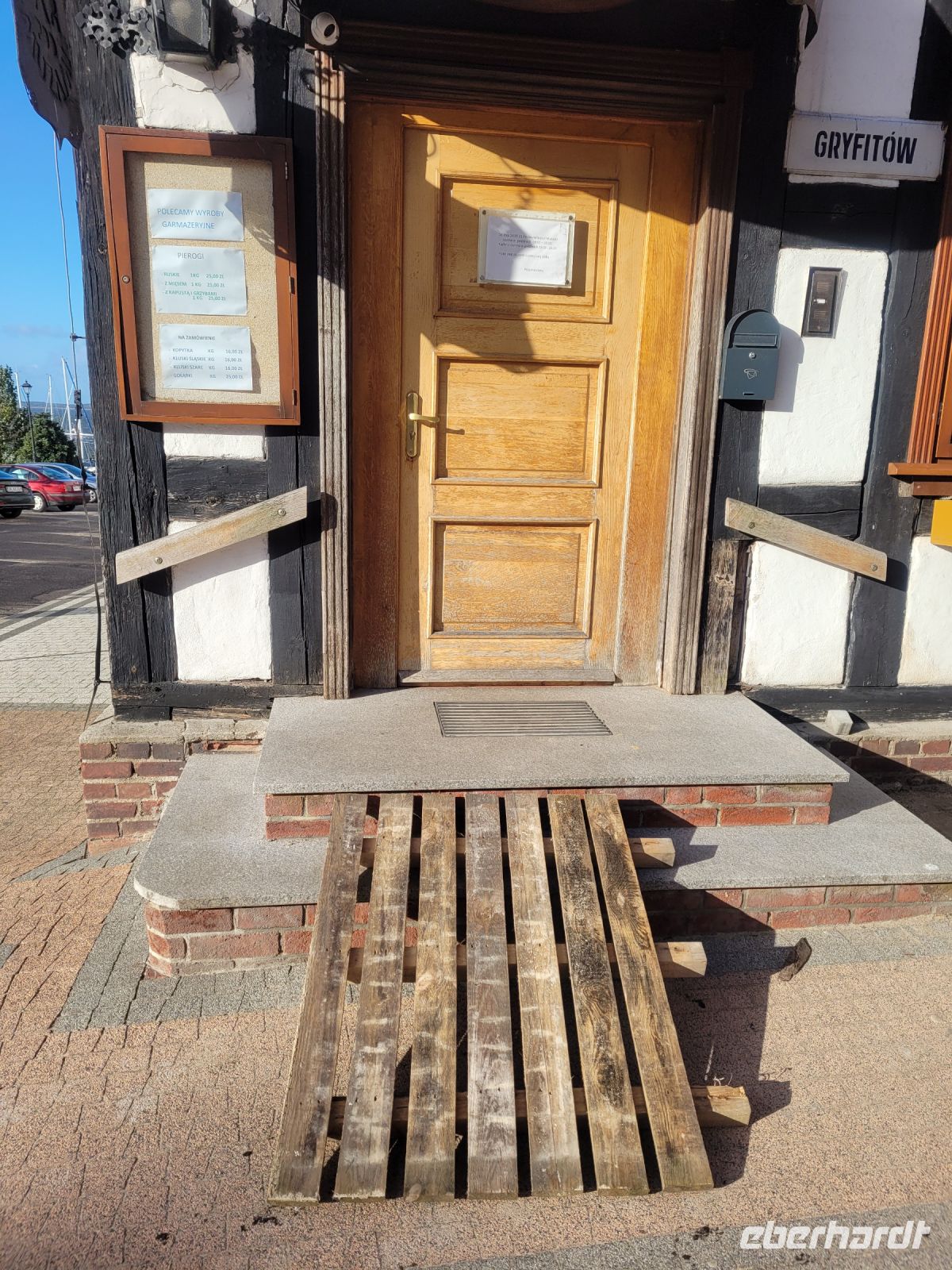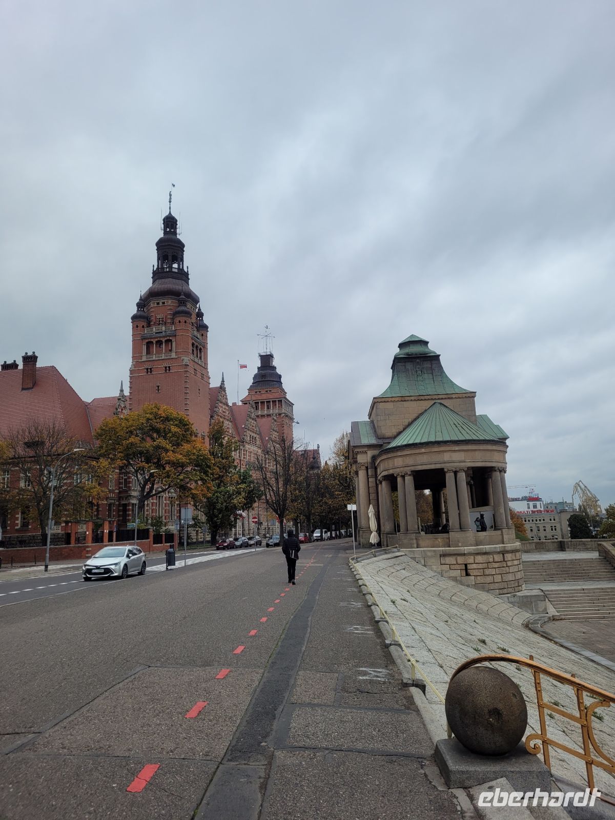 Regen, peitschender Wind. Das Sturmtief "Ignatz" wütete. Wir fuhren westwärts, Hendrik begleitete und vor der westpommerschen Hauptstadt stieg Anna ein. Als waschechte Stettinerin begleitete sie sachkundig und heiter die Stadtrundfahrt. An der Hakenterasse lockte ein Fotostop, aber an Ausstieg und flanieren war nicht zu denken. Am Schloss der Pommerschen Herzöge stiegen alle aus. Wir wollten den Innenhof besichtigen und in die Altstadt gehen. An Rollis hat hier niemand gedacht. Auf für uns schlechten Wegen kamen wir zum Märchenschloss.