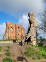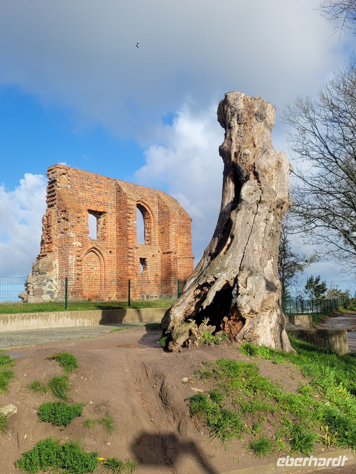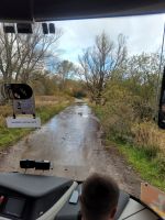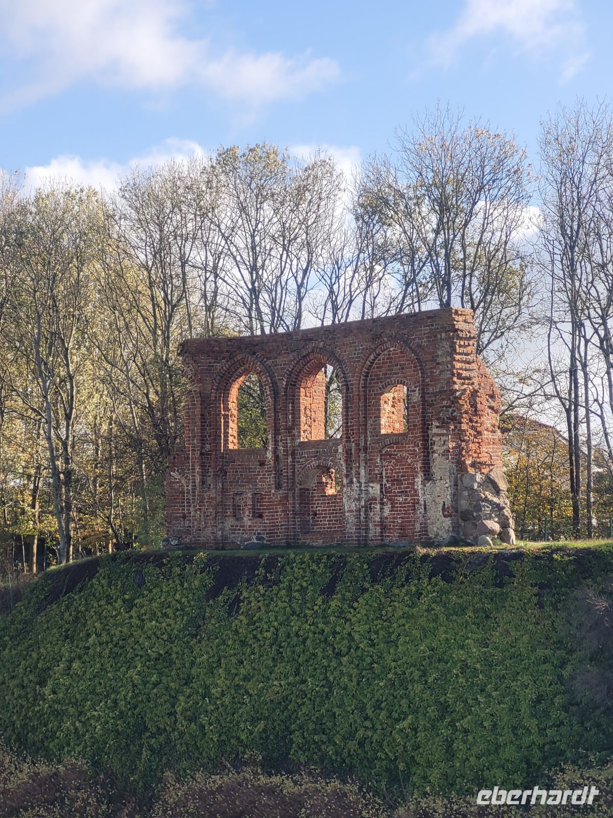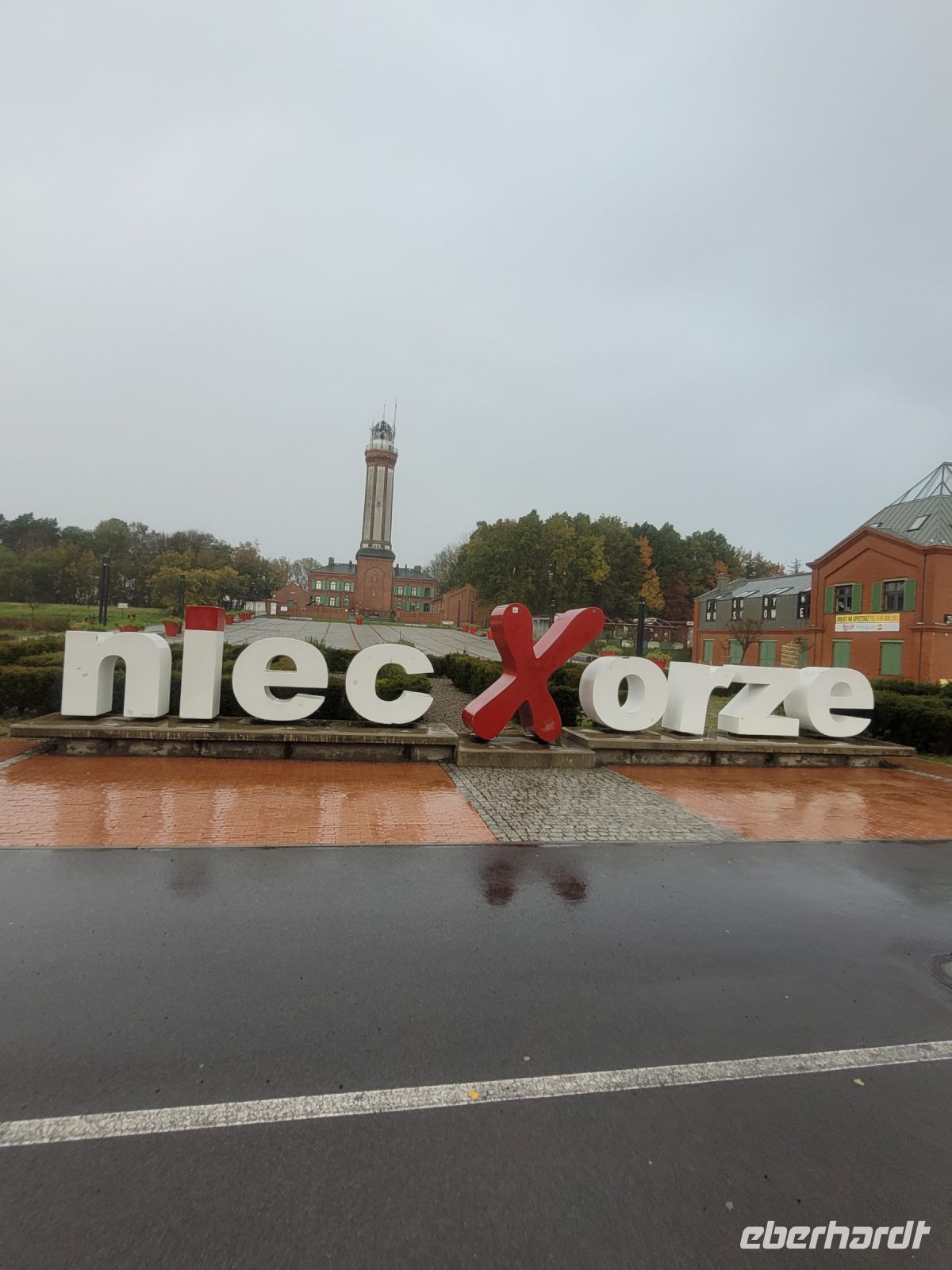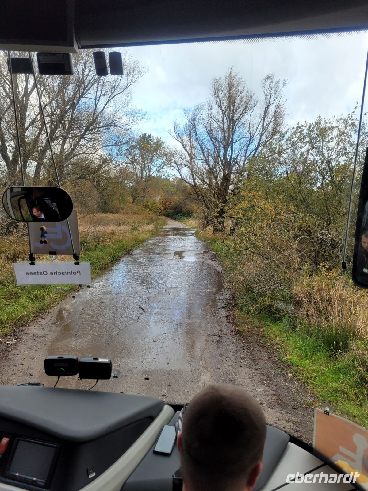 Er zeigte uns die Kurviertel von Kolberg. Eine neue Anlage, ein Kurhotel, ein Appartment nach dem anderen. Alles war neu, im Entstehen oder im Rohbau. Michael: "alles für unsere lieben Touristen". Es war einfach nur zum Kopf schütteln. Diese Umweltsünden. Ob jemals alle Gebäude belegt sein werden? Wie in den letzten beiden Tagen heulte der Wind, peitschte der Regen. Michael wollte uns einen alten Flugplatz zeigen und lotste den Bus auf einen unbefestigten Waldweg. Immer tiefer ging es in die Heide- und Moorlandschaft. Auf einmal eine wassergefüllte Senke. Jan fuhr hinein. Doch dann keinen Meter weiter. Undeutlich sah man im Wasser den vom Unwetter zerstörtenWeg. Die Tiefe ließ sich nicht abschätzen. Das Risiko war viel zu groß. Unser umsichtiger Fahrer fuhr mehrere hundert Meter rückwärts. Den Beifall hatte er sich verdient. Das Zwischenziel hieß Niechorze (Horst) mit dem berühmten Leuchtturm. Nur von der geöffneten Bustür aus konnten Fotos geschossen werden. Doch dann, wenige Kilometer weiter, in Trzesacz (Hoff) klarte es auf. Unsere Rollifahrer waren skeptisch und blieben im Bus. Die anderen liefen zur Kirchenruine. Nur noch eine Wand steht an der Abbruchkante des Kliffs. Kaum zu glauben, dass im Mittelalter das Gotteshaus noch 750 m vom Meer entfernt stand. Das schöne Fotomotiv wurde auf die Handys gebannt. Der Gang zur kleinen Seebrücke rundete den Spaziergang ab.