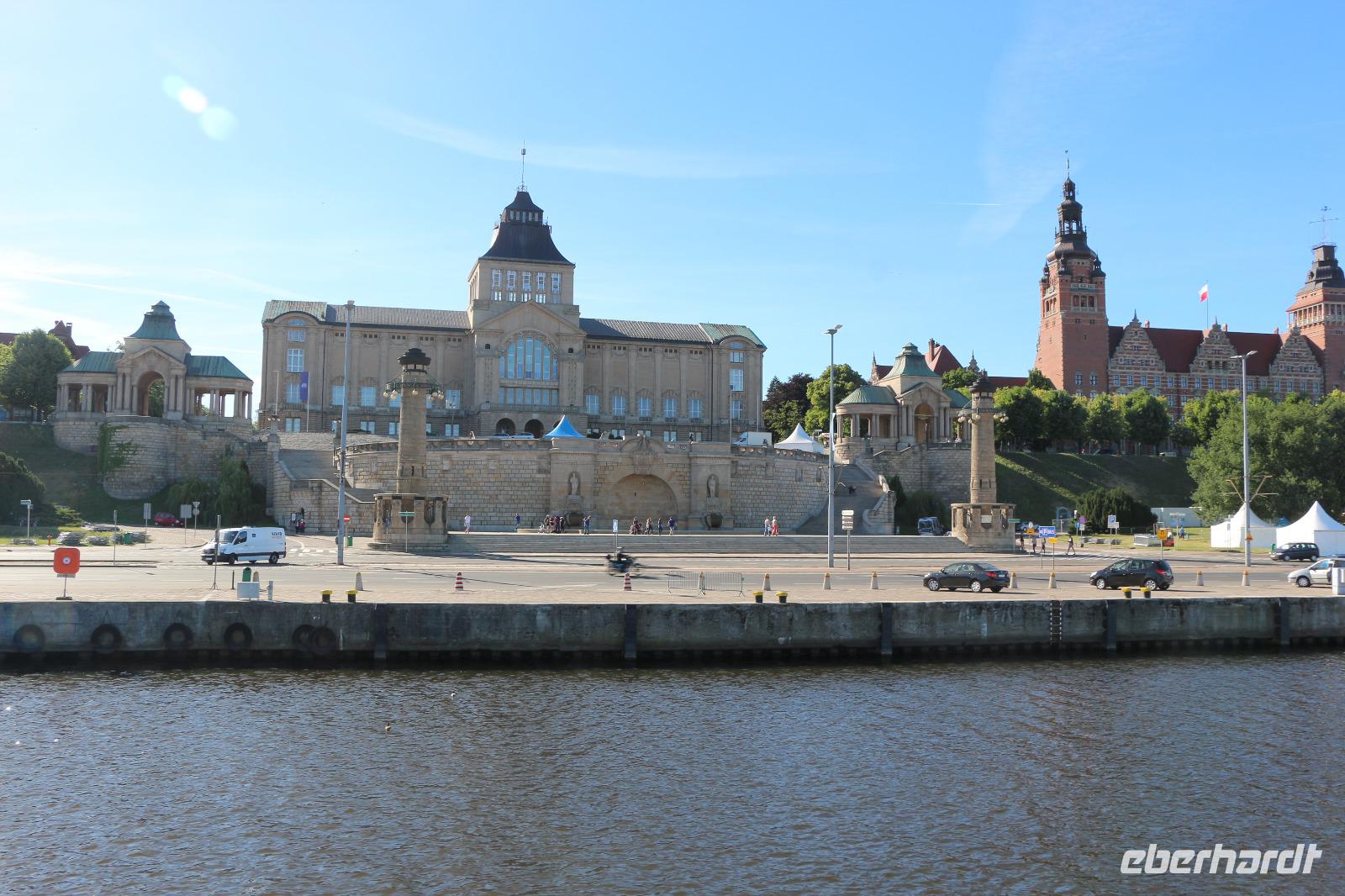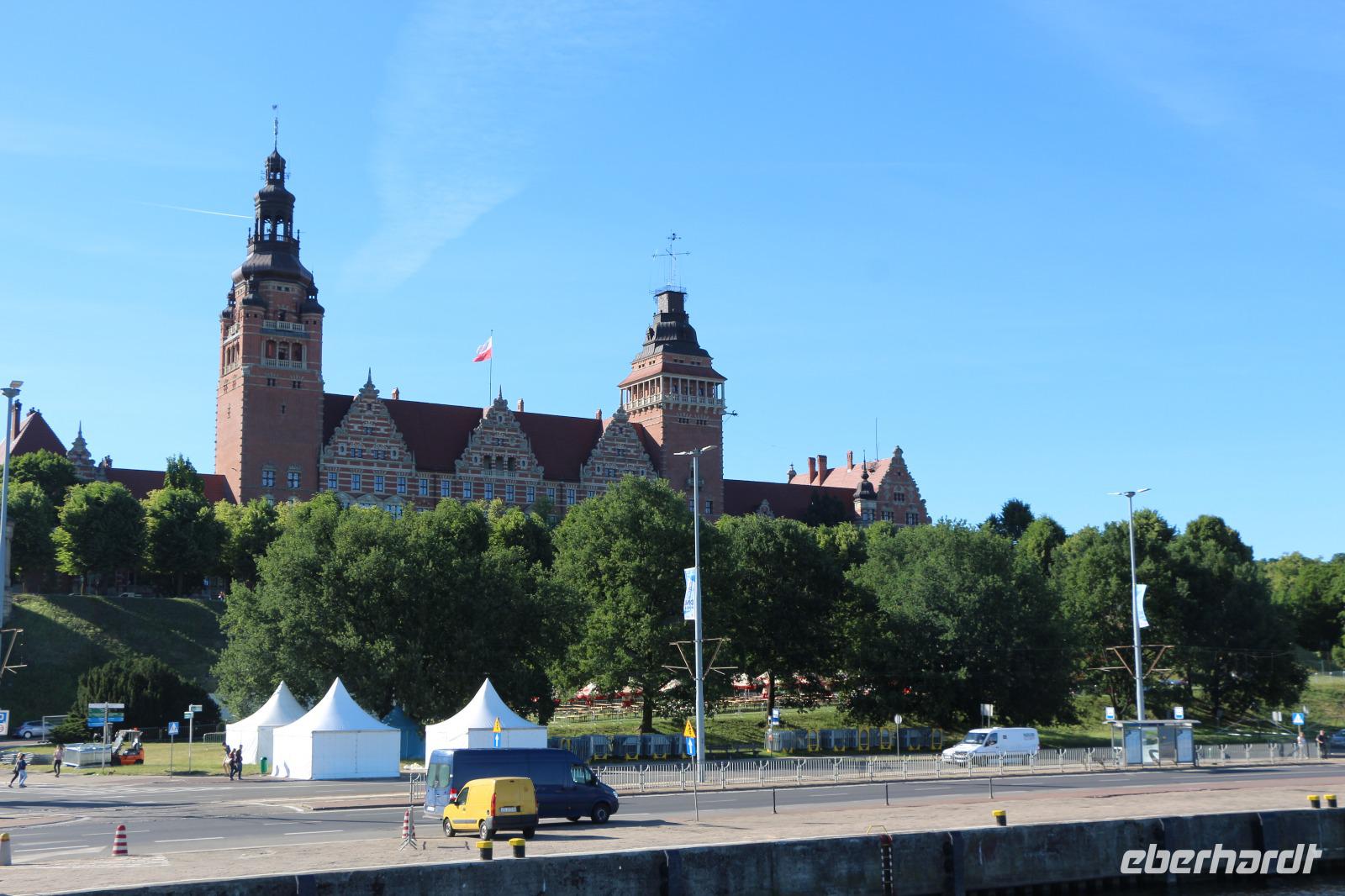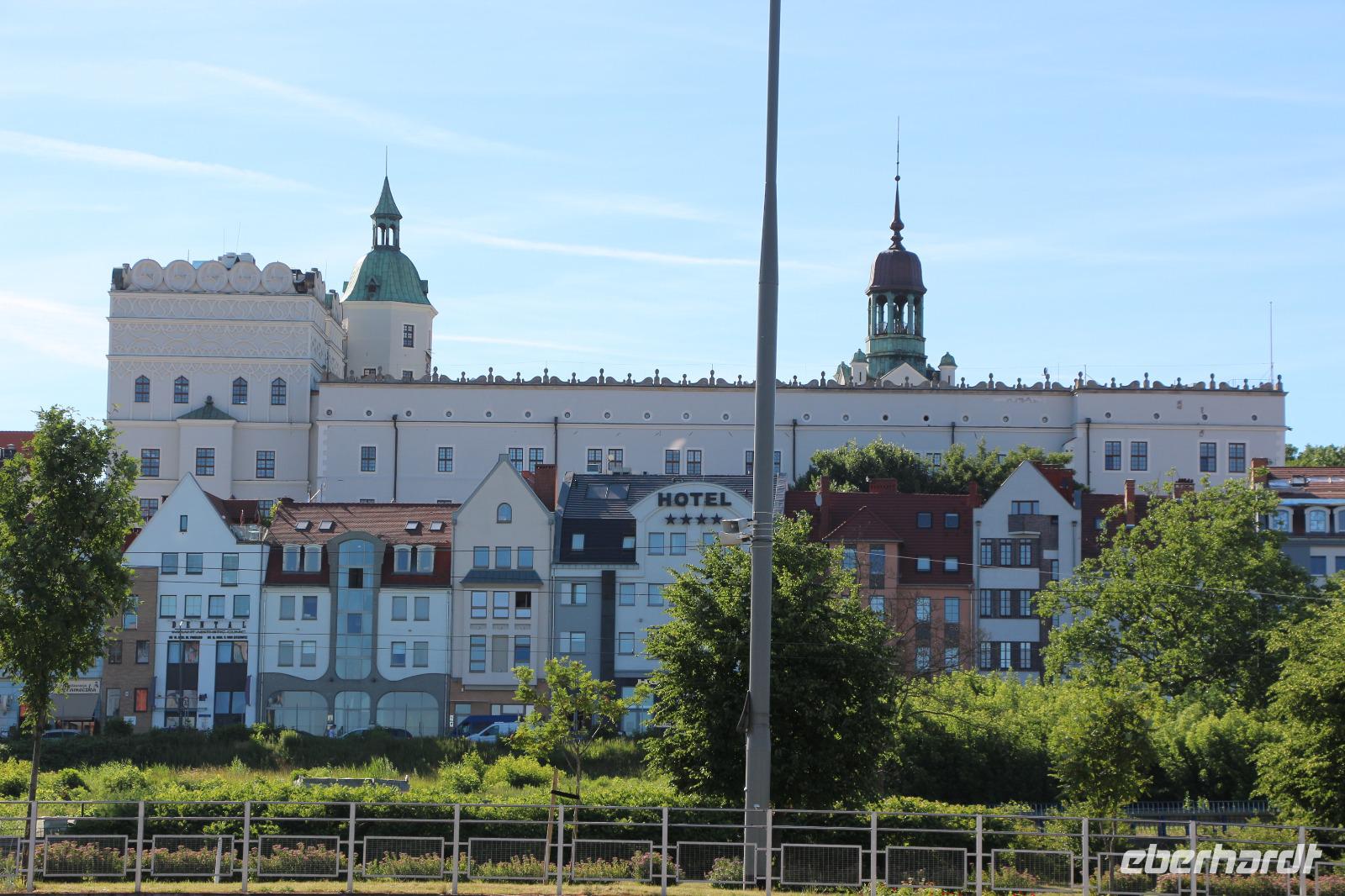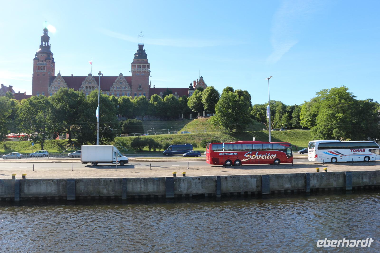Mit unserem komfortablen 5-Sterne-Reisebus reisten wir mit Bus-Chauffeur Dirk und Reisebegleiterin Kristin von Chemnitz, Dresden oder Berlin in den Norden Polens, nach Westpommern. Dabei durchquerten wir das Zweistromland zwischen Elbe und Oder mit seinen eiszeitlich geprägten Landschaften vom Baruther Urstromtal über die Oder-Havel-Region bis in die Uckermark. Am Nachmittag erreichten wir Stettin, welches nur 20 Kilometer von der Deutsch-Polnischen Grenze entfernt liegt. An einem Rasthof an der Grenze gab es gleich die Möglichkeit, ein wenig Geld zu tauschen. Vorbei am Universitätsviertel und am Friedhof von Stettin fuhren wir in die Altstadt. Hier unternahmen wir mit Kristin einen kleinen Spaziergang an der Hakenterrasse, dem bekanntesten Bauensemble der Stadt und einem Wahrzeichen Stettins. Bei herrlichem Sonnenschein genossen wir den Ausblick von der Hakenterasse auf die Oder und den Hafen. Wir flanierten entlang der Marine-Akademie, dem Nationalmuseum und dem hübschen Amtsgebäude der Woiwodschaft Westpommern zu einem der beiden Biergärten, die sich links und rechts der Hakenterrasse befinden. Bei einem Kaffee, Bier oder Eis ließen wir das fast maritime Flair der Stadt auf uns wirken.