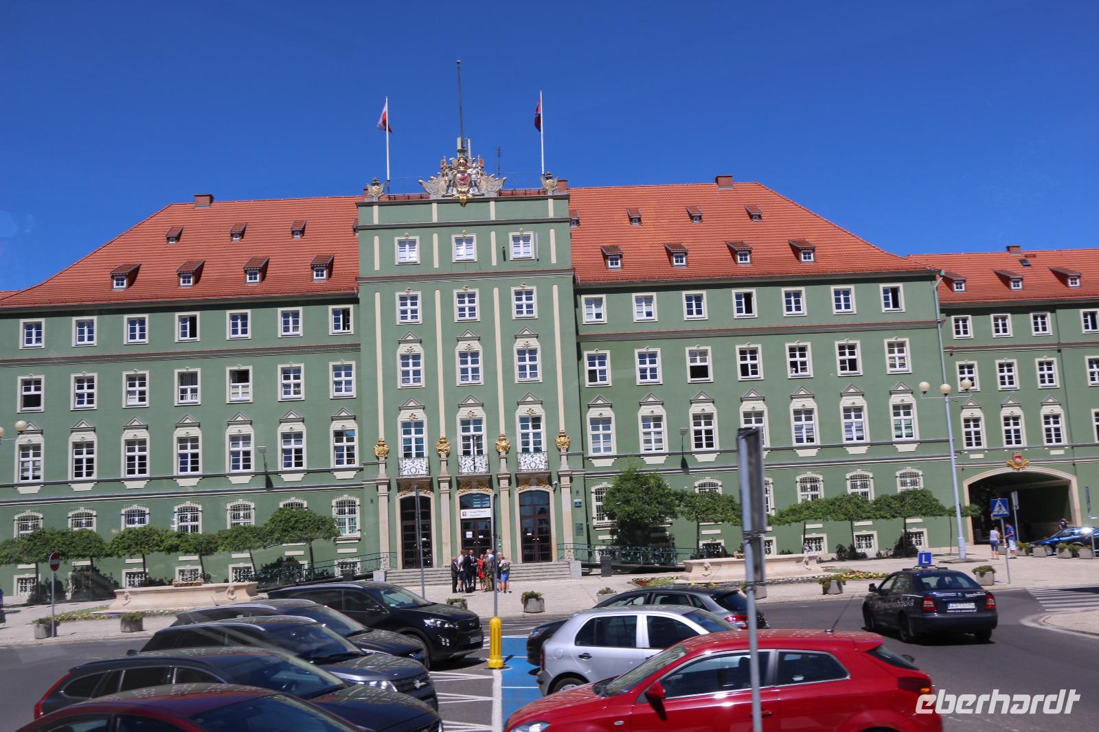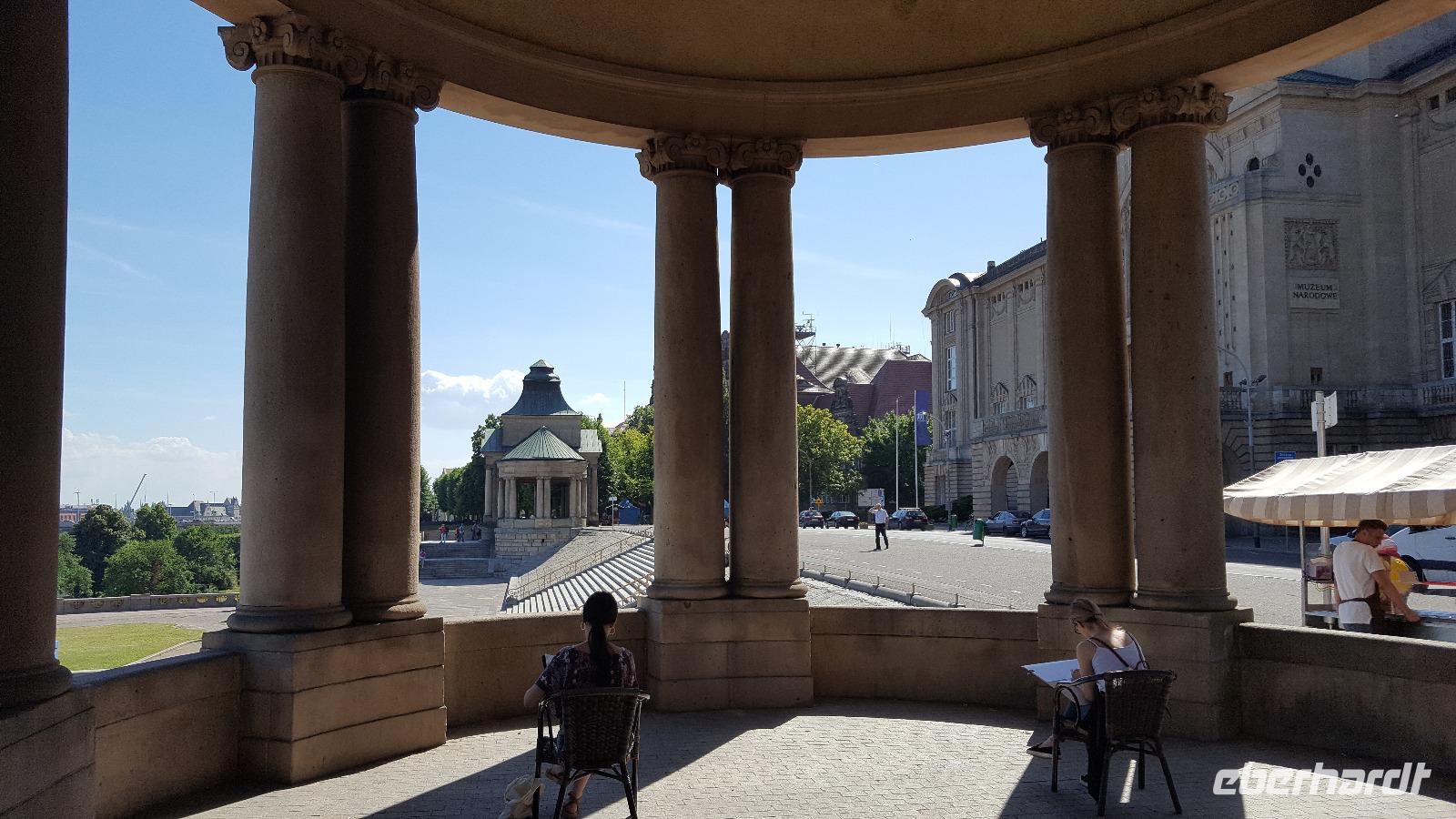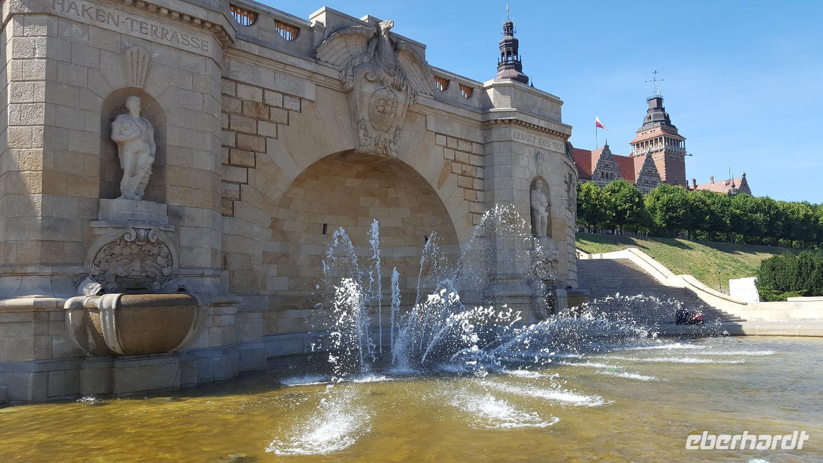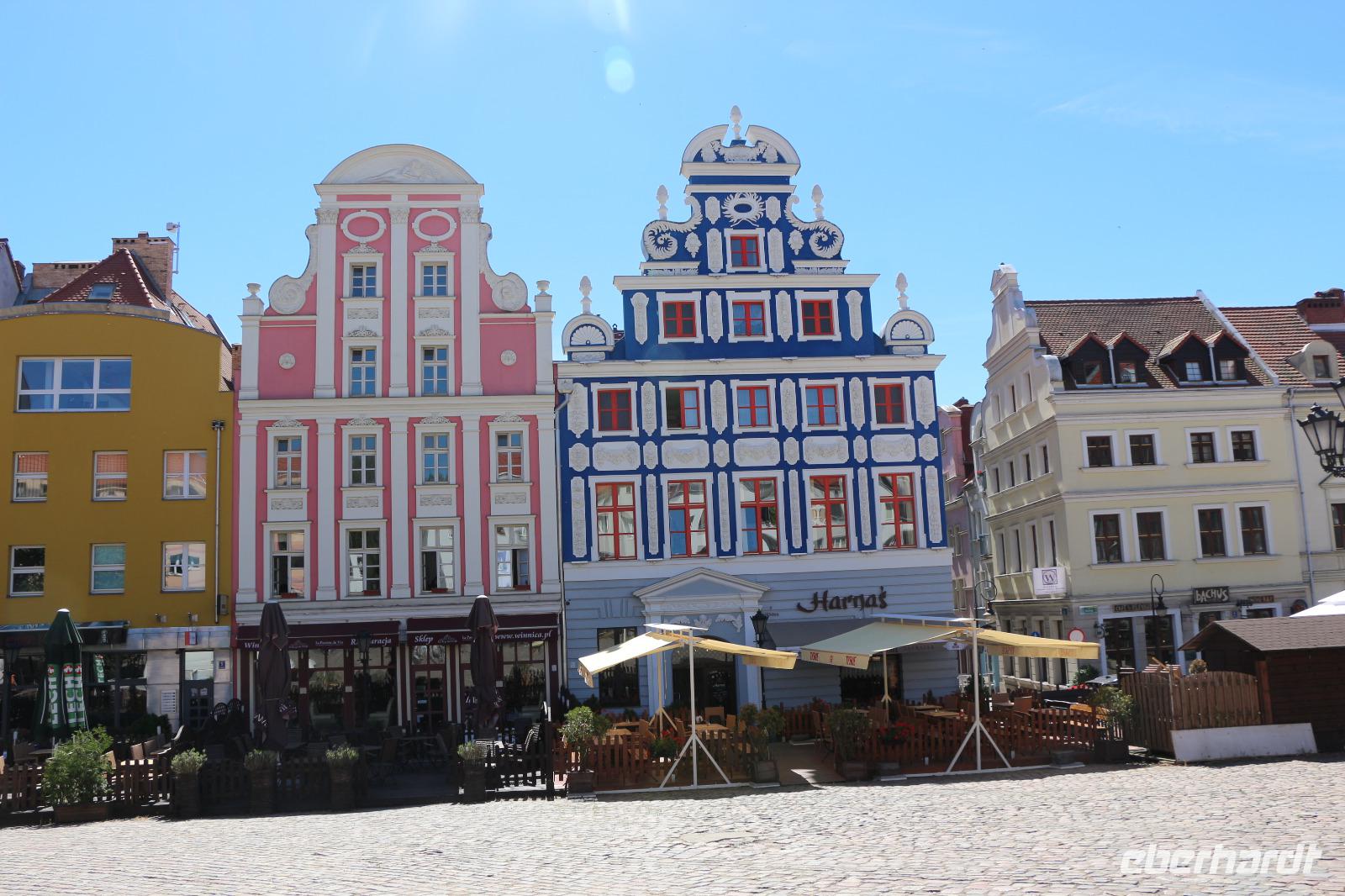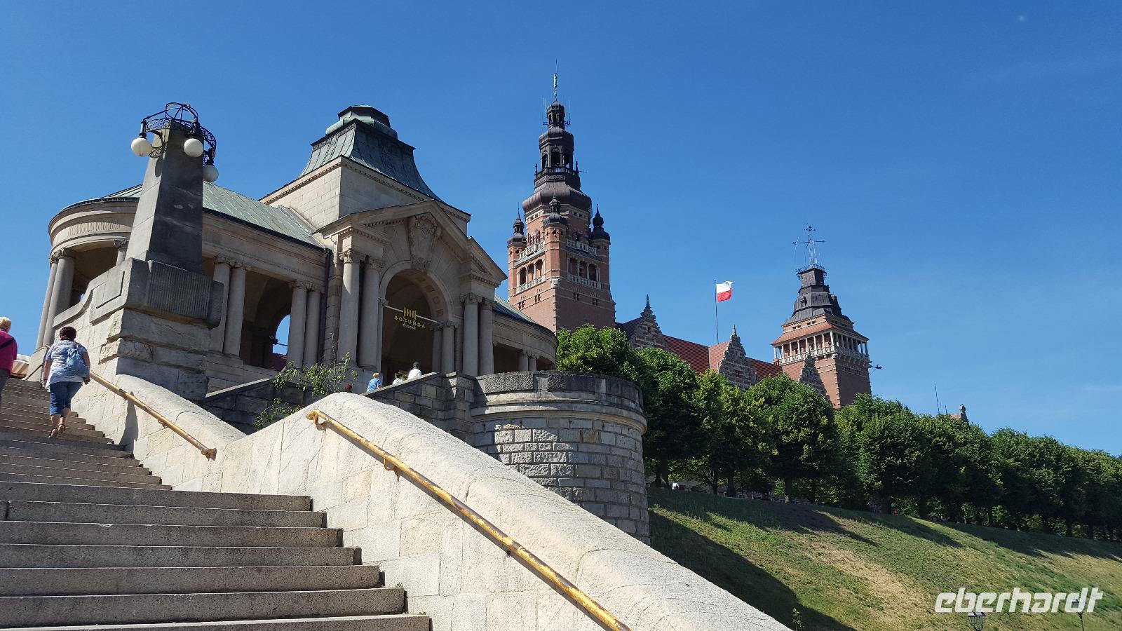 Mit unserem komfortablen 5-Sterne-Reisebus reisten wir mit Bus-Chauffeur Dirk und Reisebegleiterin Kristin von Chemnitz, Dresden oder Berlin in den Norden Polens, nach Westpommern. Dabei durchquerten wir das Zweistromland zwischen Elbe und Oder mit seinen eiszeitlich geprägten Landschaften vom Baruther Urstromtal über die Oder-Havel-Region bis in die Uckermark. Am Nachmittag erreichten wir Stettin, welches nur 20 Kilometer von der Deutsch-Polnischen Grenze entfernt liegt. An einem Rasthof an der Grenze gab es gleich die Möglichkeit, ein wenig Geld zu tauschen. Vorbei am Universitätsviertel und am Friedhof von Stettin fuhren wir in die Altstadt. Hier unternahmen wir mit Kristin einen kleinen Spaziergang an der Hakenterrasse, dem bekanntesten Bauensemble der Stadt und einem Wahrzeichen Stettins. Bei herrlichem Sonnenschein genossen wir den Ausblick von der Hakenterasse auf die Oder und den Hafen. Wir flanierten entlang der Marine-Akademie, dem Nationalmuseum und dem hübschen Amtsgebäude der Woiwodschaft Westpommern zu einem der beiden Biergärten, die sich links und rechts der Hakenterrasse befinden. Bei einem Kaffee, Bier oder Eis ließen wir das fast maritime Flair der Stadt auf uns wirken.
