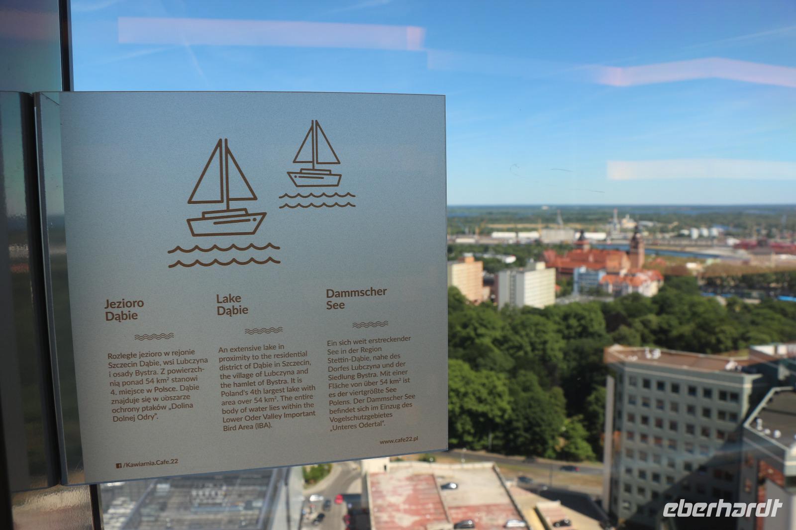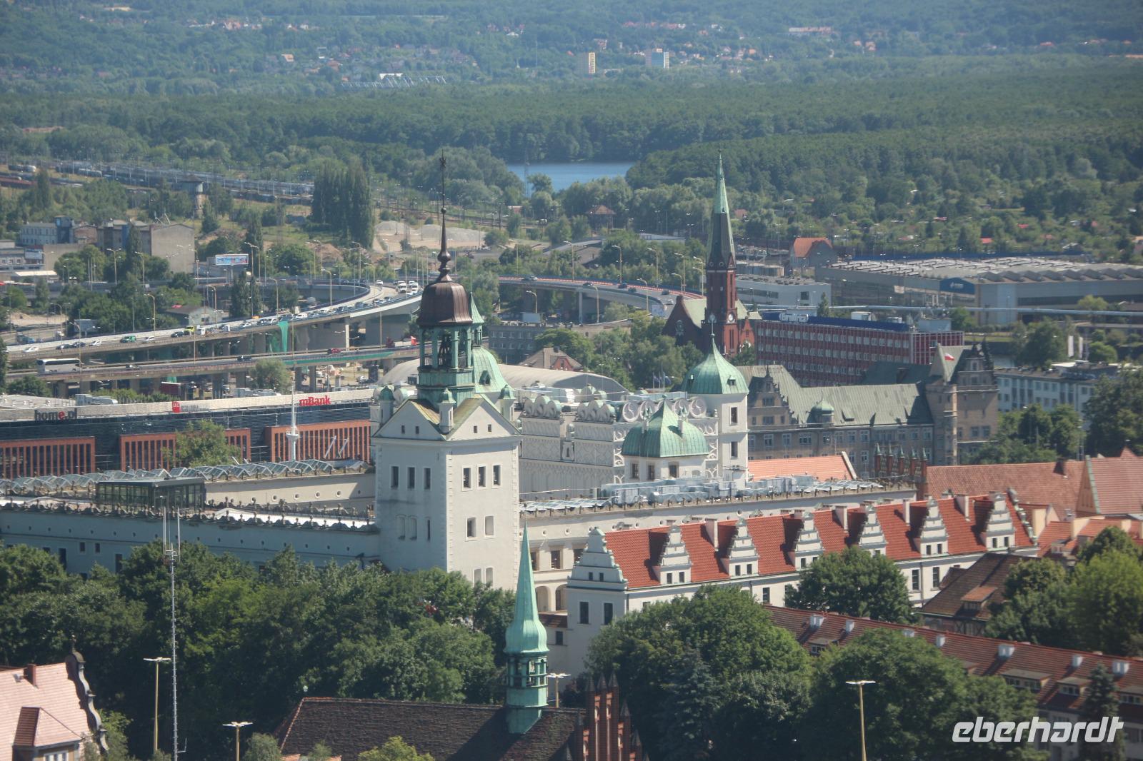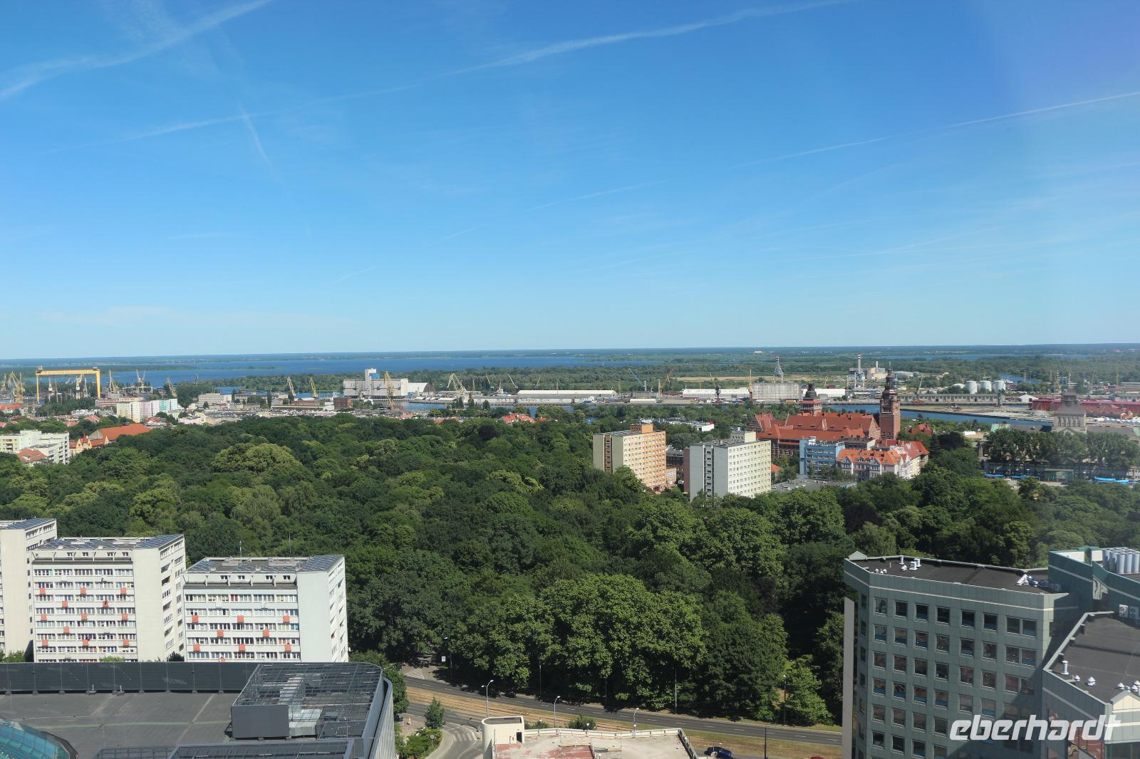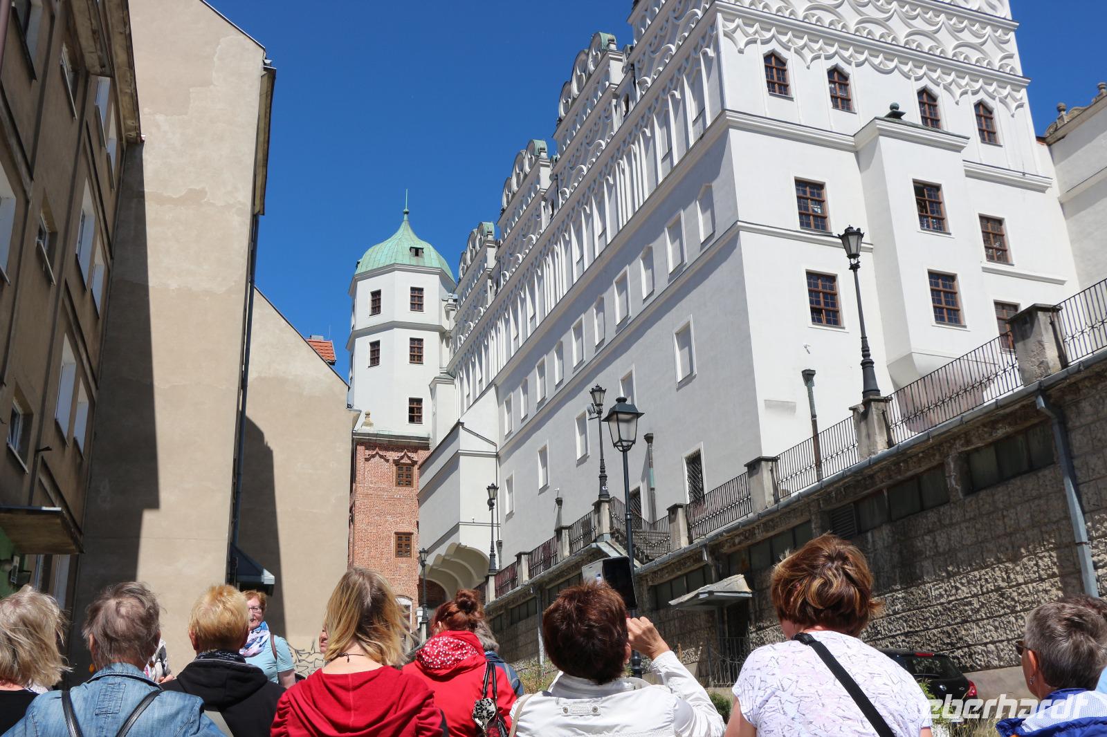 Dann ging es zu Fuß weiter in die innere Altstadt Stettins. Vorbei am historischen Marktplatz mit seinen hübschen bunten Ständehäusern und dem alten Rathaus spazierten wir zum Schloss der Pommern-Herzöge. Dabei erzählte uns Anna allerlei Wissenswertes zur Geschichte der Stadt und ihrer Bewohner, zu Liebesgeschichten, Hexen und Herzögen. Unsere Stadtrundfahrt ging vom Schloss weiter in die sehenswertesten Viertel der Stadt mit ihren alten Stadttoren, Kirchen und Parks. Wir staunten, wie grün und abwechslungsreich die siebtgrößte Stadt Polens ist. Wir besuchten den Rosengarten Stettins "Rozanka", in dem mehr als einhundert Rosenarten wachsen. Bei einem Spaziergang ließen wir die bunte Blütenpracht und den Duft der Rosen auf uns wirken. Bei unserer weiteren Rundfahrt durch den riesigen Quistorp-Park zeigte uns Anna die schönsten Villen, Alleen und Denkmäler. Das schöne Viertel gilt als das "Westend" von Stettin. Entlang der Hauptpromenaden und dem sternförmigen Plac Grunwaldski fuhren wir zurück in Richtung Innenstadt. Zurück am Hochhaus Pazim stiegen wir aus dem Bus aus und legten eine Mittagspause ein. Ein Großteil unserer Reisegruppe fuhr mit Kristin zum höchstgelegenen Café Stettins hinauf, dem "Café 22" in der 22. Etage des Pazim-Hochhauses. Von etwa 90 Metern Höhe hat man hier einen wunderbaren Blick über Stettin, den Dammschen See (Dabie) und den Flusslauf der Oder. Bei Kaffee, Eis und leckeren Slalaten und Snacks genossen wir die Aussicht. Gleich neben dem Pazim-Gebäude befindet sich das Einkaufszentrum Galaxy, in dem man neben Geschäften auch viele Möglichkeiten zum Mittagessen findet.