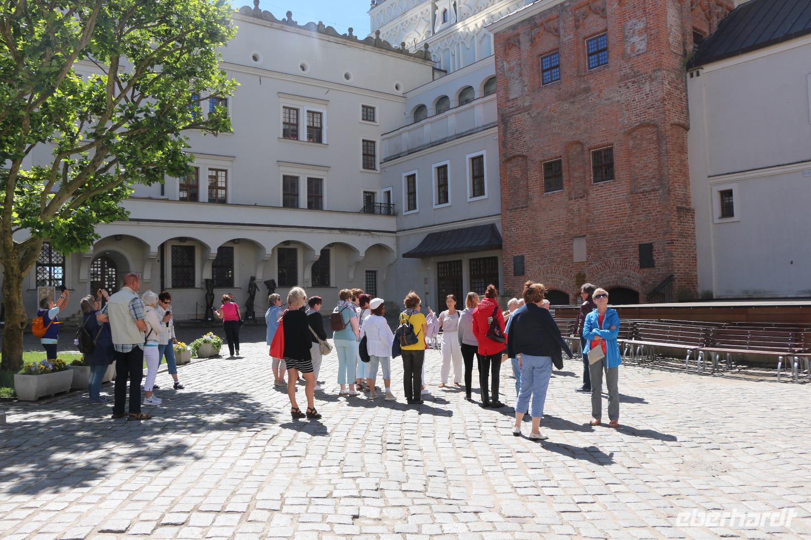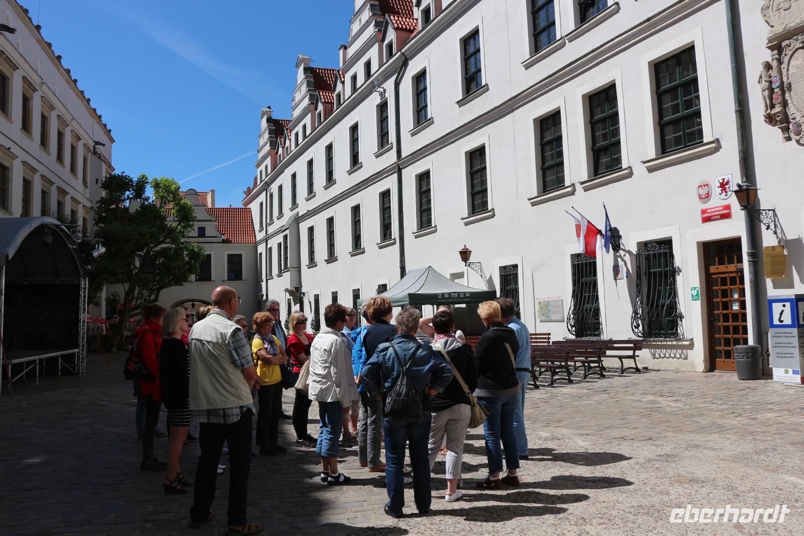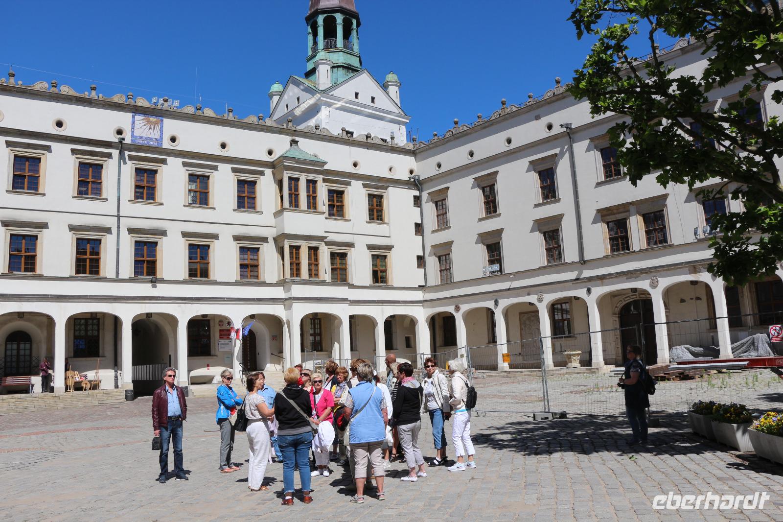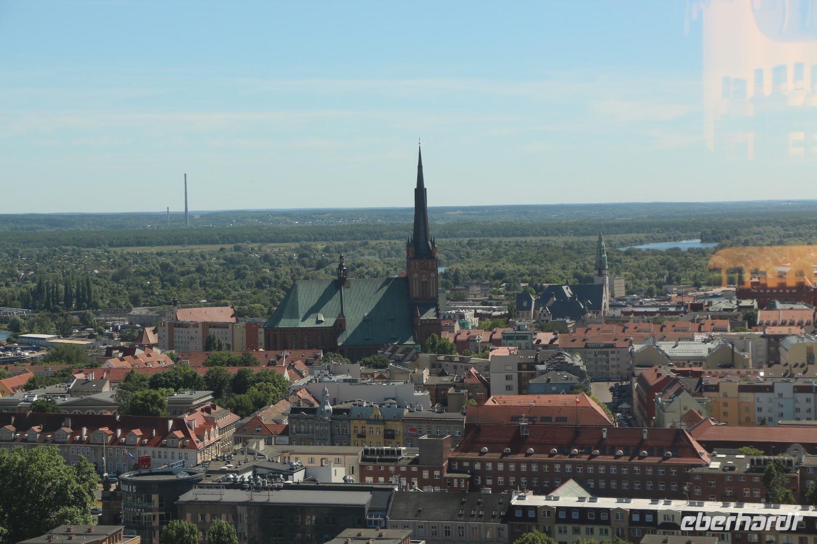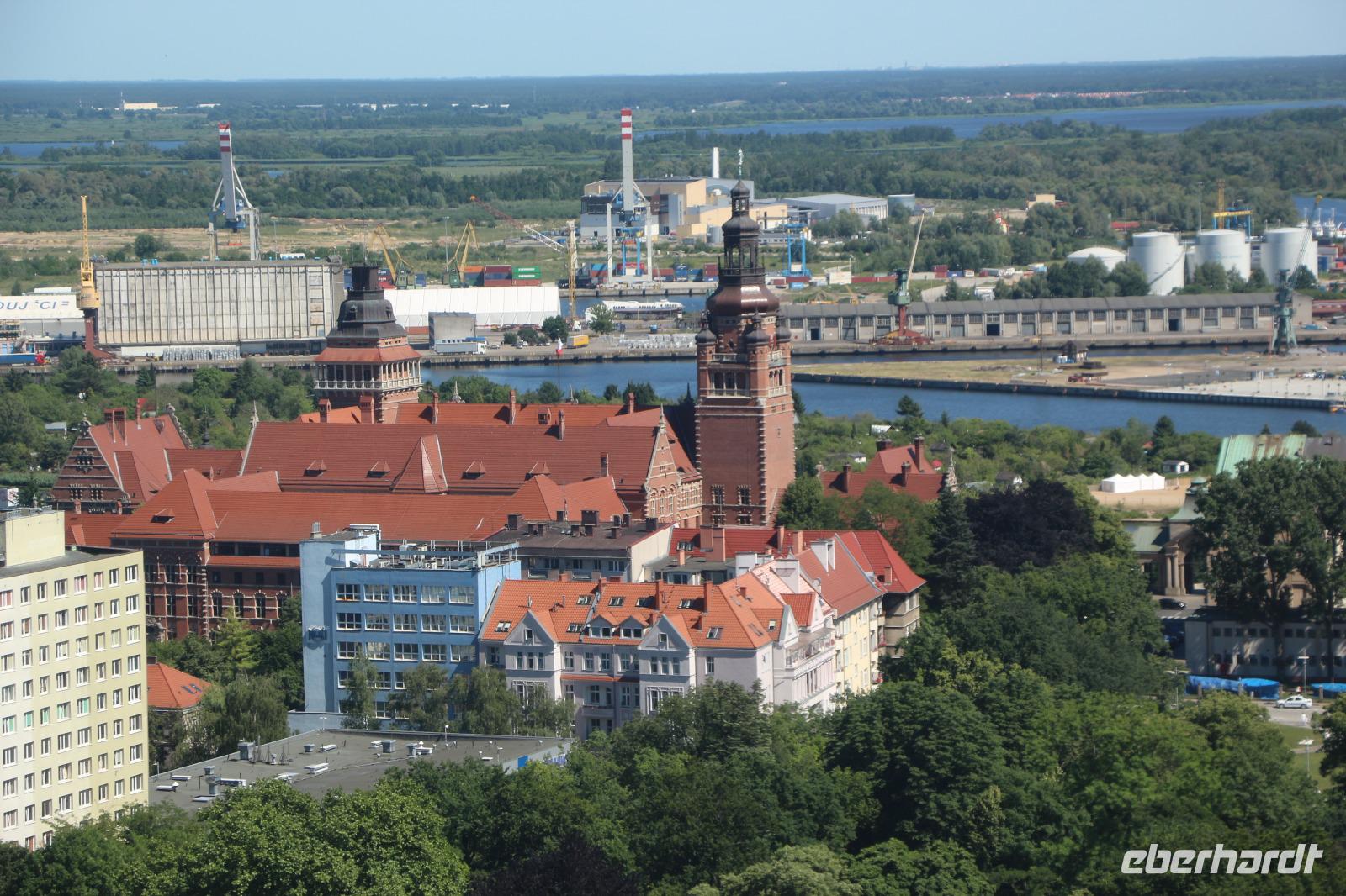 Dann ging es zu Fuß weiter in die innere Altstadt Stettins. Vorbei am historischen Marktplatz mit seinen hübschen bunten Ständehäusern und dem alten Rathaus spazierten wir zum Schloss der Pommern-Herzöge. Dabei erzählte uns Anna allerlei Wissenswertes zur Geschichte der Stadt und ihrer Bewohner, zu Liebesgeschichten, Hexen und Herzögen. Unsere Stadtrundfahrt ging vom Schloss weiter in die sehenswertesten Viertel der Stadt mit ihren alten Stadttoren, Kirchen und Parks. Wir staunten, wie grün und abwechslungsreich die siebtgrößte Stadt Polens ist. Wir besuchten den Rosengarten Stettins "Rozanka", in dem mehr als einhundert Rosenarten wachsen. Bei einem Spaziergang ließen wir die bunte Blütenpracht und den Duft der Rosen auf uns wirken. Bei unserer weiteren Rundfahrt durch den riesigen Quistorp-Park zeigte uns Anna die schönsten Villen, Alleen und Denkmäler. Das schöne Viertel gilt als das "Westend" von Stettin. Entlang der Hauptpromenaden und dem sternförmigen Plac Grunwaldski fuhren wir zurück in Richtung Innenstadt. Zurück am Hochhaus Pazim stiegen wir aus dem Bus aus und legten eine Mittagspause ein. Ein Großteil unserer Reisegruppe fuhr mit Kristin zum höchstgelegenen Café Stettins hinauf, dem "Café 22" in der 22. Etage des Pazim-Hochhauses. Von etwa 90 Metern Höhe hat man hier einen wunderbaren Blick über Stettin, den Dammschen See (Dabie) und den Flusslauf der Oder. Bei Kaffee, Eis und leckeren Slalaten und Snacks genossen wir die Aussicht. Gleich neben dem Pazim-Gebäude befindet sich das Einkaufszentrum Galaxy, in dem man neben Geschäften auch viele Möglichkeiten zum Mittagessen findet.