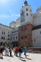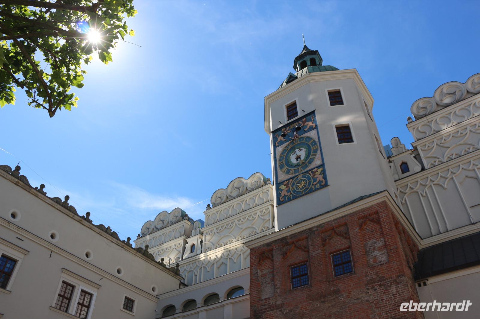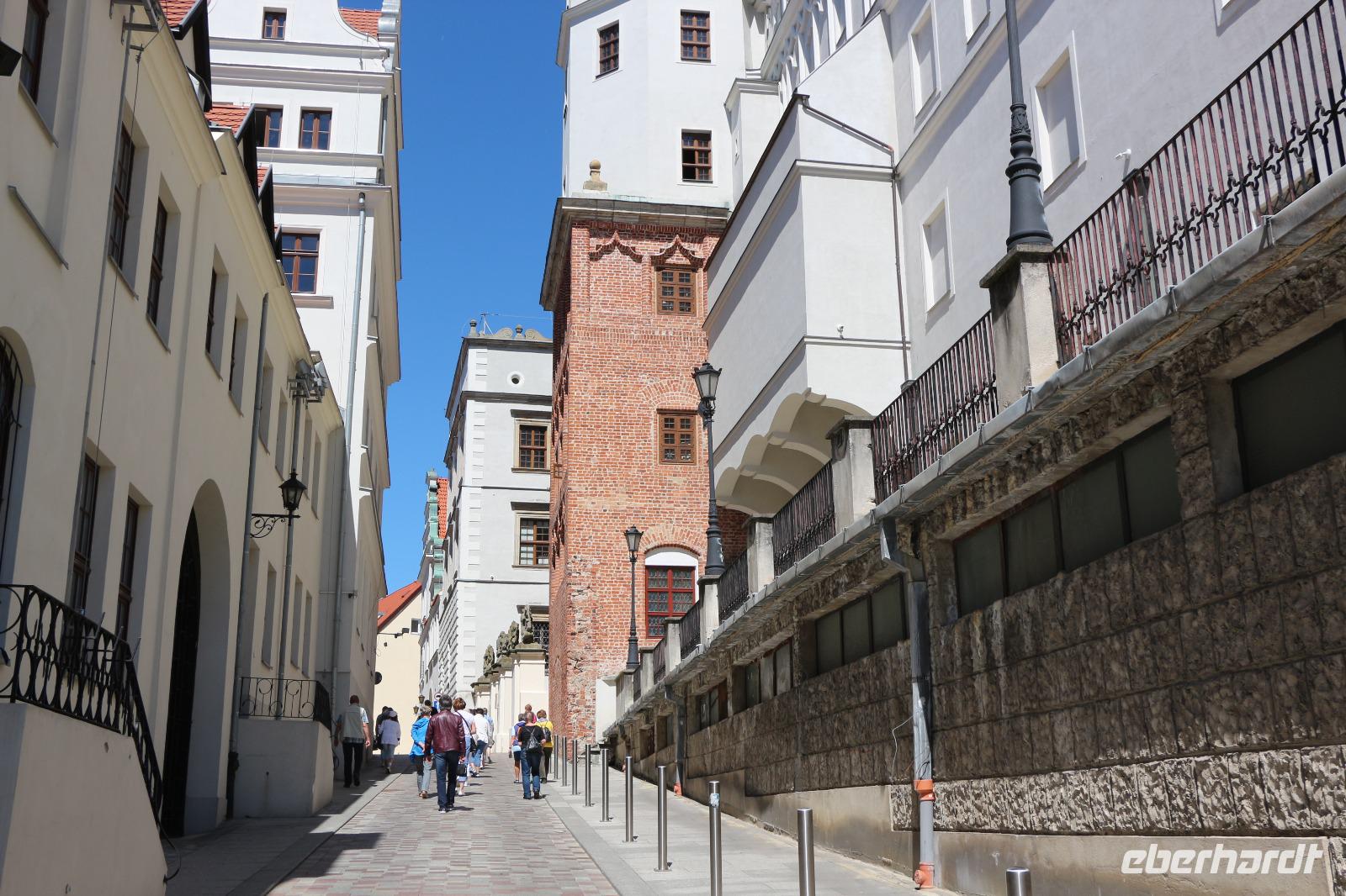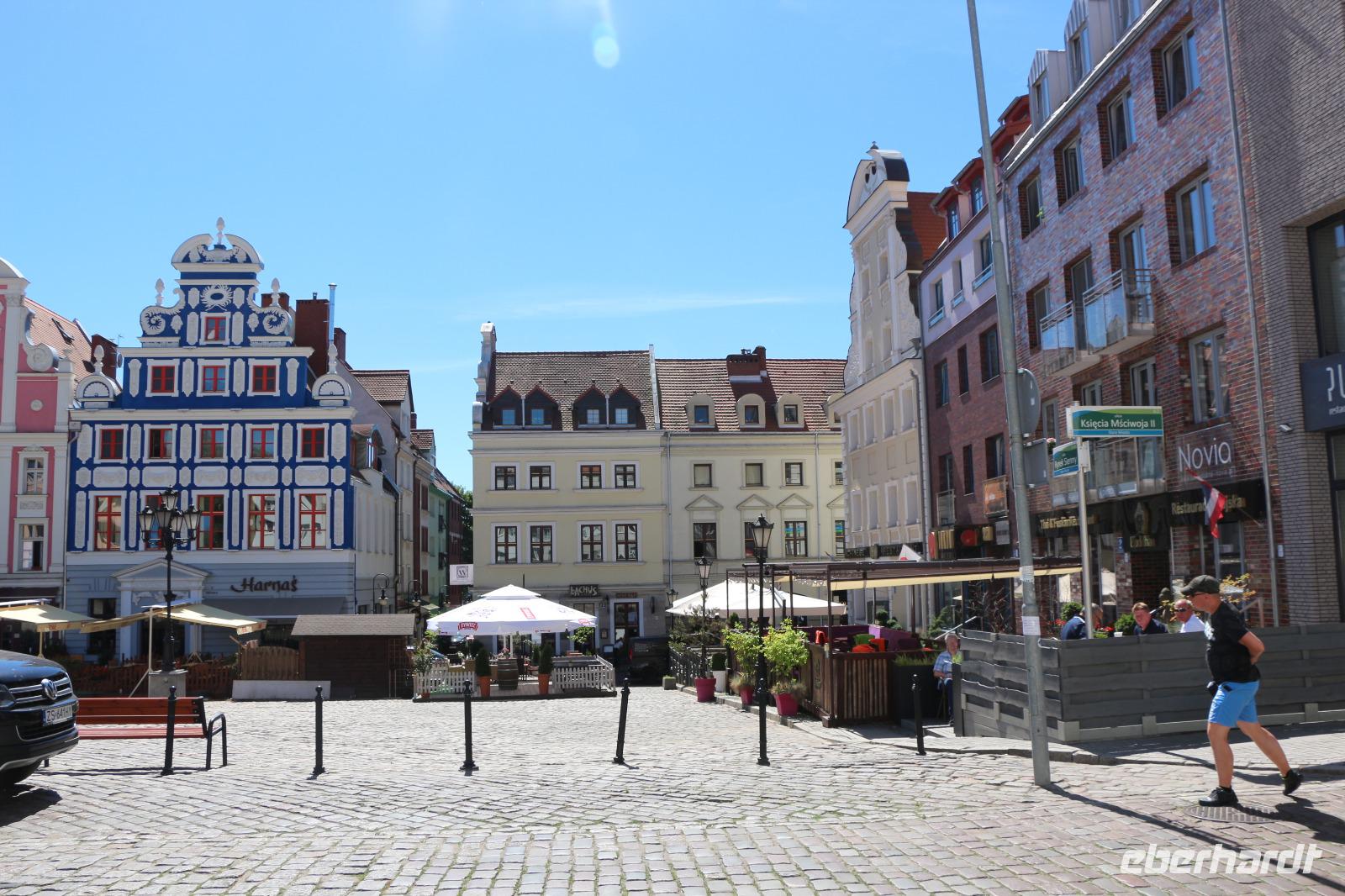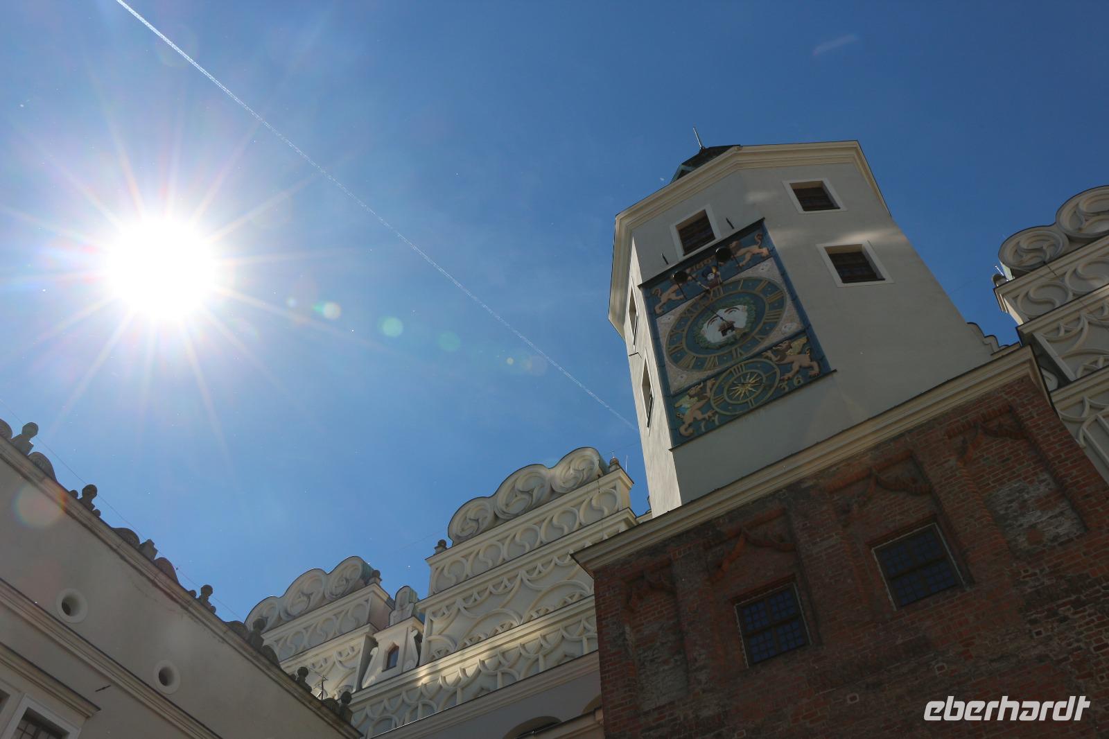 Dann ging es zu Fuß weiter in die innere Altstadt Stettins. Vorbei am historischen Marktplatz mit seinen hübschen bunten Ständehäusern und dem alten Rathaus spazierten wir zum Schloss der Pommern-Herzöge. Dabei erzählte uns Anna allerlei Wissenswertes zur Geschichte der Stadt und ihrer Bewohner, zu Liebesgeschichten, Hexen und Herzögen. Unsere Stadtrundfahrt ging vom Schloss weiter in die sehenswertesten Viertel der Stadt mit ihren alten Stadttoren, Kirchen und Parks. Wir staunten, wie grün und abwechslungsreich die siebtgrößte Stadt Polens ist. Wir besuchten den Rosengarten Stettins "Rozanka", in dem mehr als einhundert Rosenarten wachsen. Bei einem Spaziergang ließen wir die bunte Blütenpracht und den Duft der Rosen auf uns wirken. Bei unserer weiteren Rundfahrt durch den riesigen Quistorp-Park zeigte uns Anna die schönsten Villen, Alleen und Denkmäler. Das schöne Viertel gilt als das "Westend" von Stettin. Entlang der Hauptpromenaden und dem sternförmigen Plac Grunwaldski fuhren wir zurück in Richtung Innenstadt. Zurück am Hochhaus Pazim stiegen wir aus dem Bus aus und legten eine Mittagspause ein. Ein Großteil unserer Reisegruppe fuhr mit Kristin zum höchstgelegenen Café Stettins hinauf, dem "Café 22" in der 22. Etage des Pazim-Hochhauses. Von etwa 90 Metern Höhe hat man hier einen wunderbaren Blick über Stettin, den Dammschen See (Dabie) und den Flusslauf der Oder. Bei Kaffee, Eis und leckeren Slalaten und Snacks genossen wir die Aussicht. Gleich neben dem Pazim-Gebäude befindet sich das Einkaufszentrum Galaxy, in dem man neben Geschäften auch viele Möglichkeiten zum Mittagessen findet.