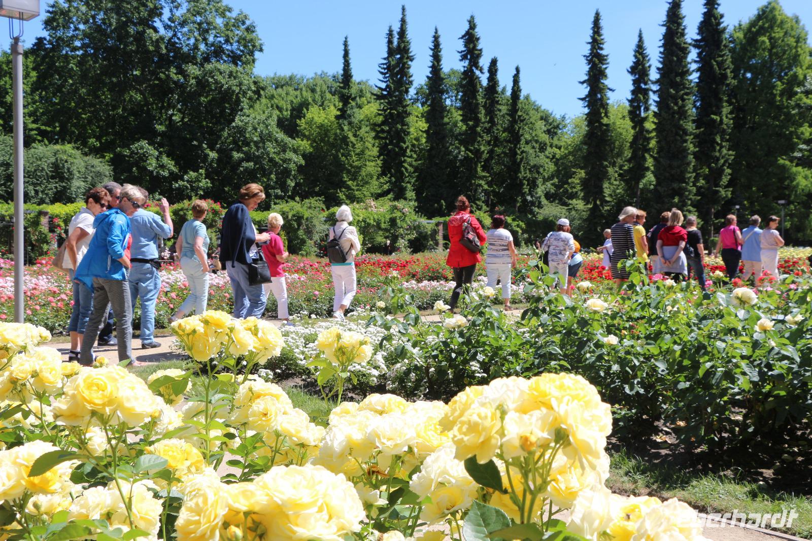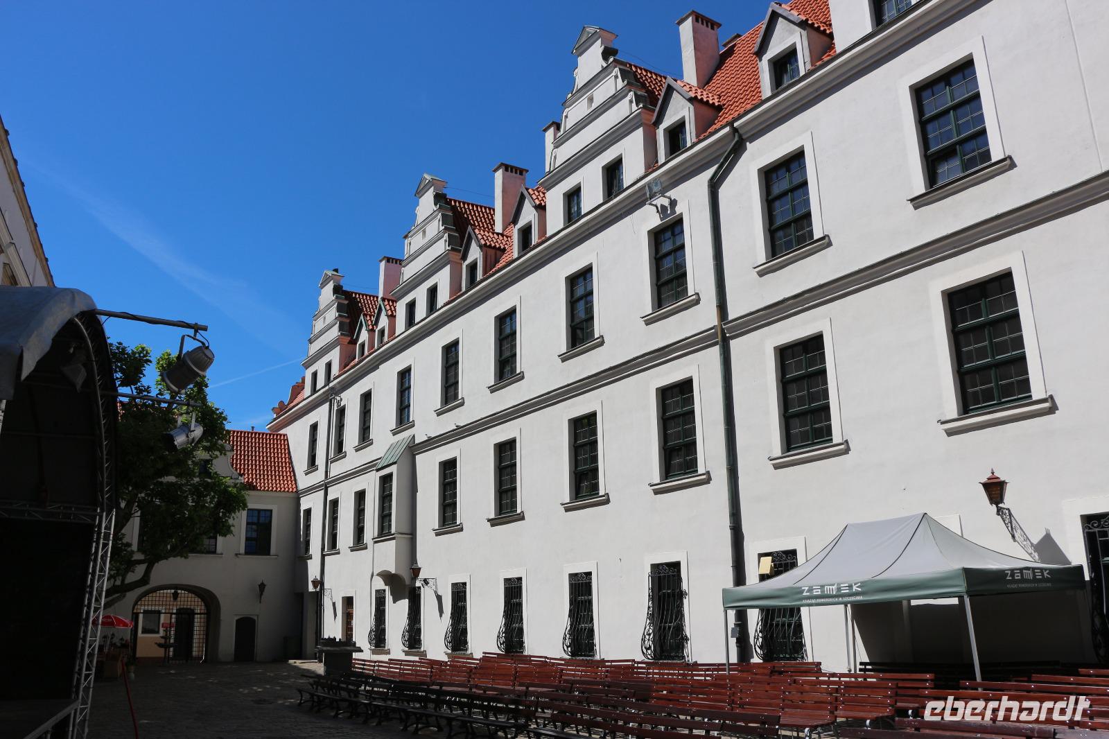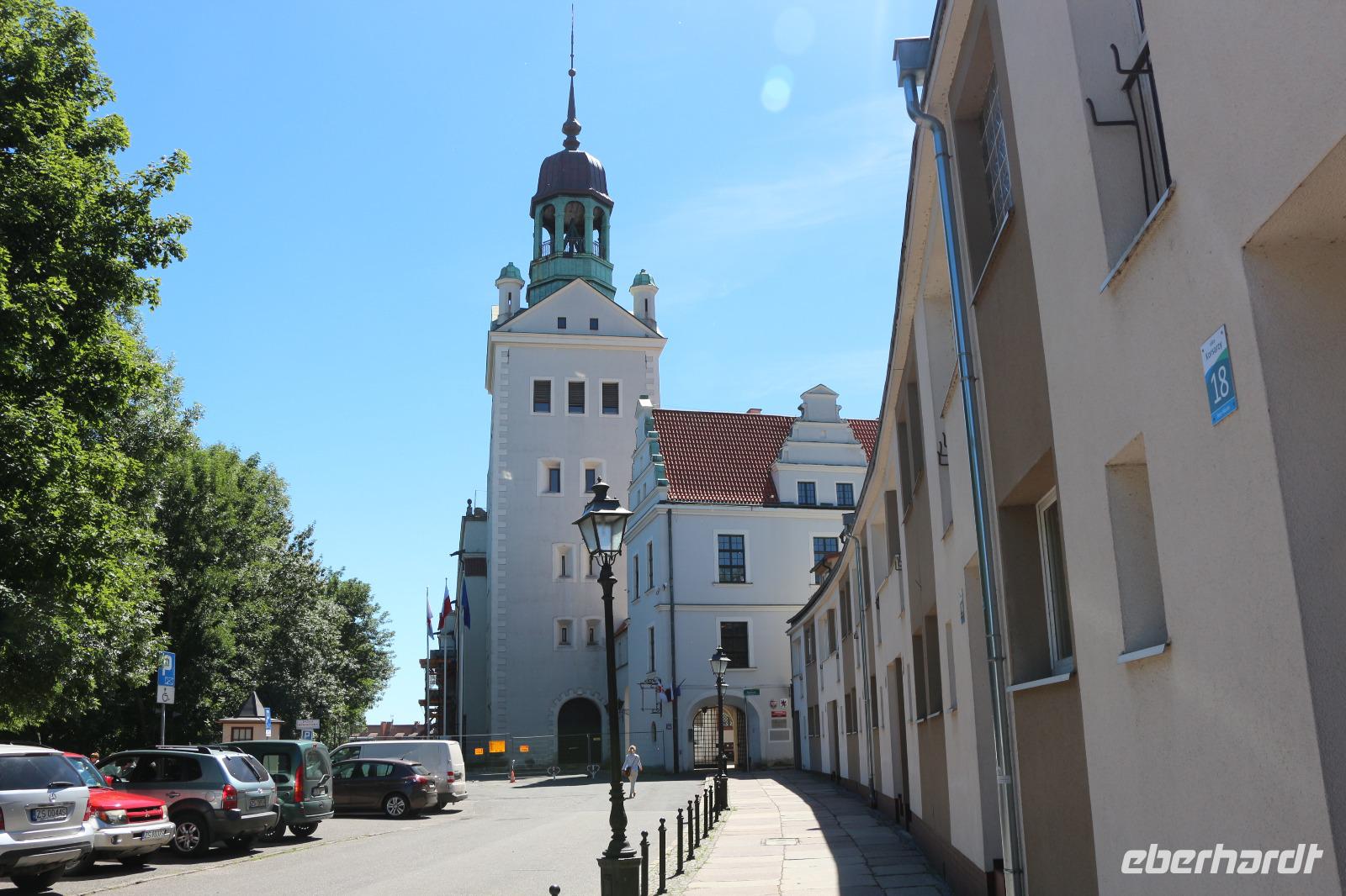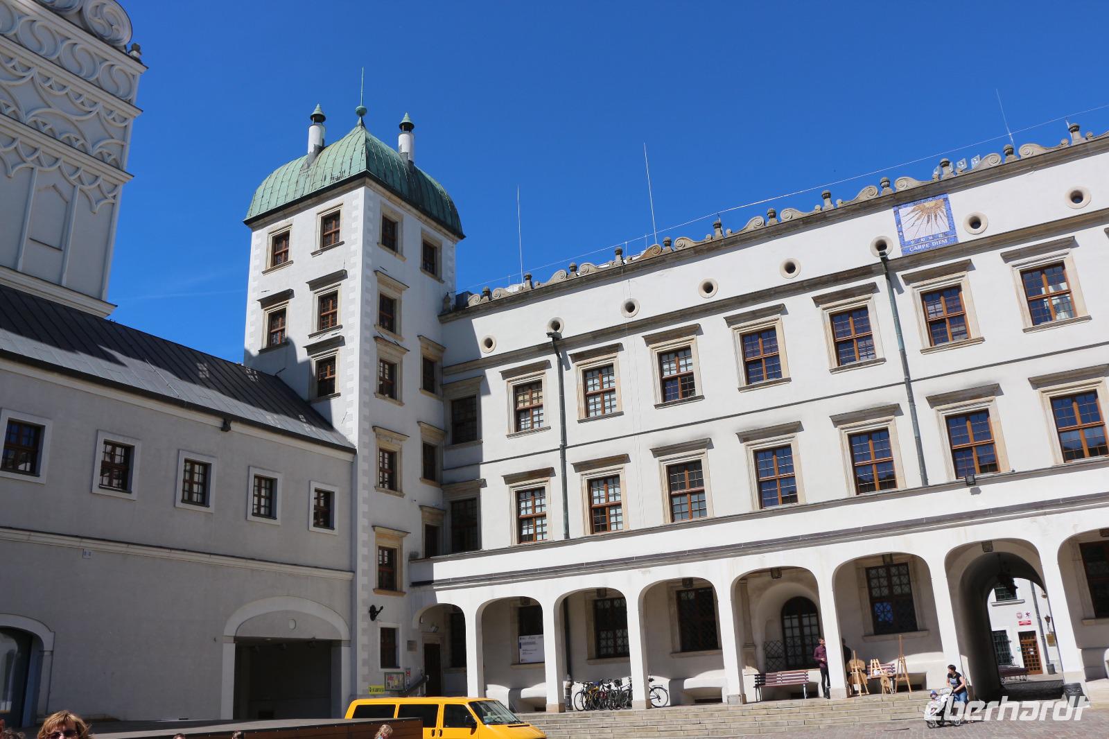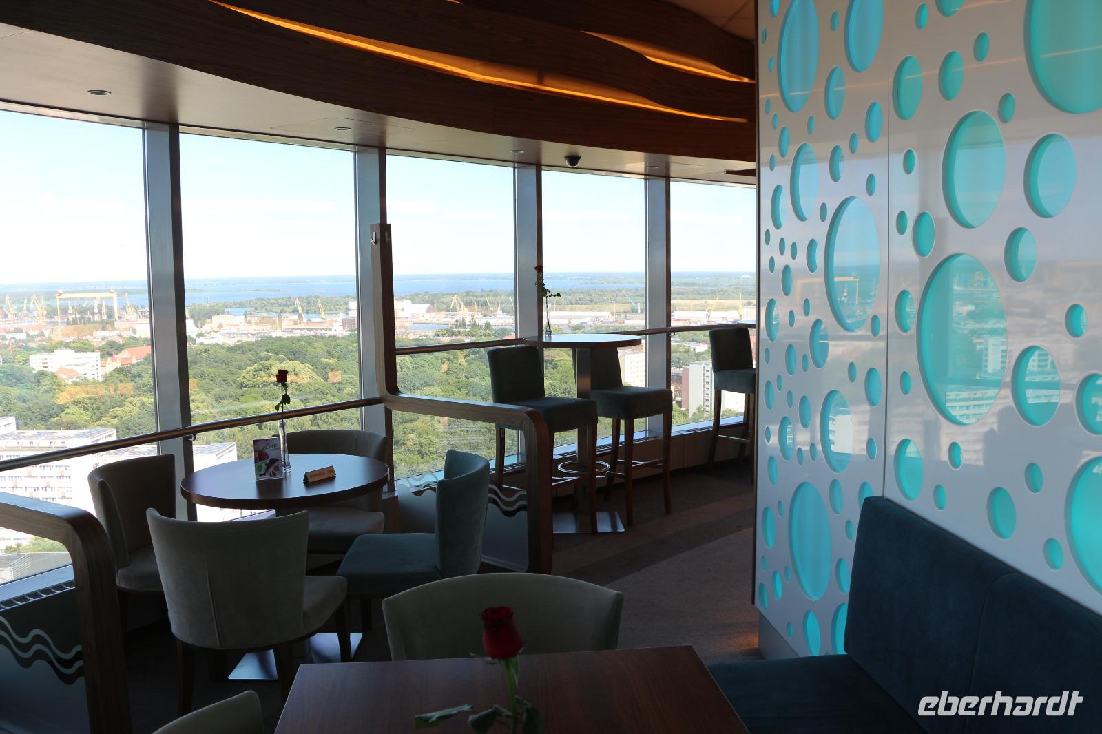Dann ging es zu Fuß weiter in die innere Altstadt Stettins. Vorbei am historischen Marktplatz mit seinen hübschen bunten Ständehäusern und dem alten Rathaus spazierten wir zum Schloss der Pommern-Herzöge. Dabei erzählte uns Anna allerlei Wissenswertes zur Geschichte der Stadt und ihrer Bewohner, zu Liebesgeschichten, Hexen und Herzögen. Unsere Stadtrundfahrt ging vom Schloss weiter in die sehenswertesten Viertel der Stadt mit ihren alten Stadttoren, Kirchen und Parks. Wir staunten, wie grün und abwechslungsreich die siebtgrößte Stadt Polens ist. Wir besuchten den Rosengarten Stettins "Rozanka", in dem mehr als einhundert Rosenarten wachsen. Bei einem Spaziergang ließen wir die bunte Blütenpracht und den Duft der Rosen auf uns wirken. Bei unserer weiteren Rundfahrt durch den riesigen Quistorp-Park zeigte uns Anna die schönsten Villen, Alleen und Denkmäler. Das schöne Viertel gilt als das "Westend" von Stettin. Entlang der Hauptpromenaden und dem sternförmigen Plac Grunwaldski fuhren wir zurück in Richtung Innenstadt. Zurück am Hochhaus Pazim stiegen wir aus dem Bus aus und legten eine Mittagspause ein. Ein Großteil unserer Reisegruppe fuhr mit Kristin zum höchstgelegenen Café Stettins hinauf, dem "Café 22" in der 22. Etage des Pazim-Hochhauses. Von etwa 90 Metern Höhe hat man hier einen wunderbaren Blick über Stettin, den Dammschen See (Dabie) und den Flusslauf der Oder. Bei Kaffee, Eis und leckeren Slalaten und Snacks genossen wir die Aussicht. Gleich neben dem Pazim-Gebäude befindet sich das Einkaufszentrum Galaxy, in dem man neben Geschäften auch viele Möglichkeiten zum Mittagessen findet.