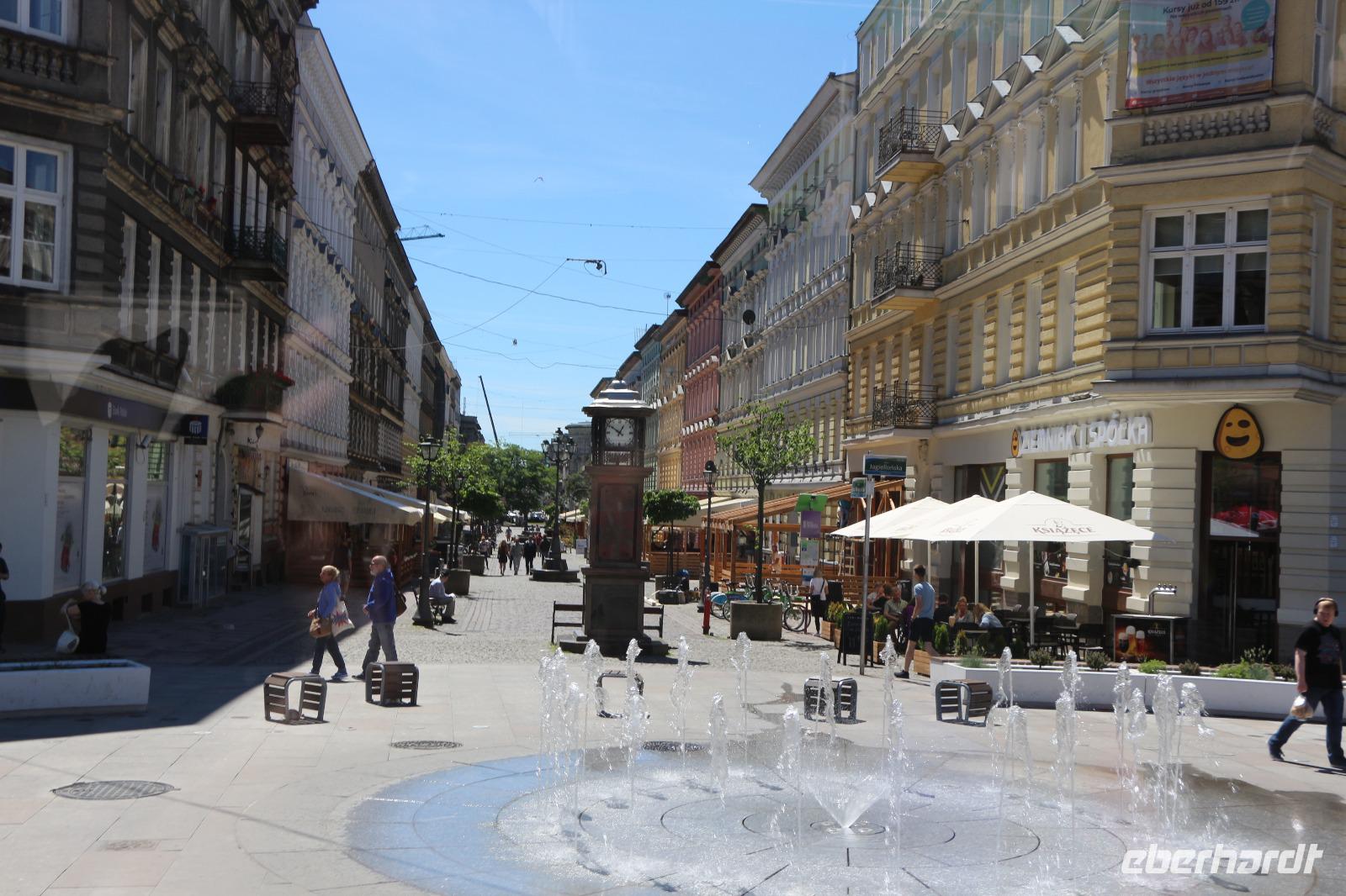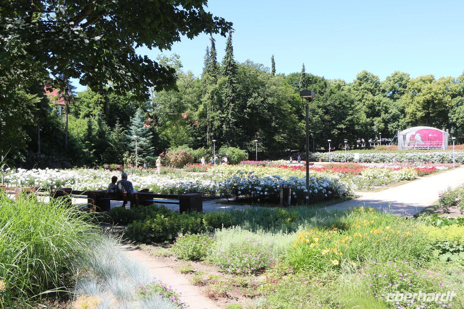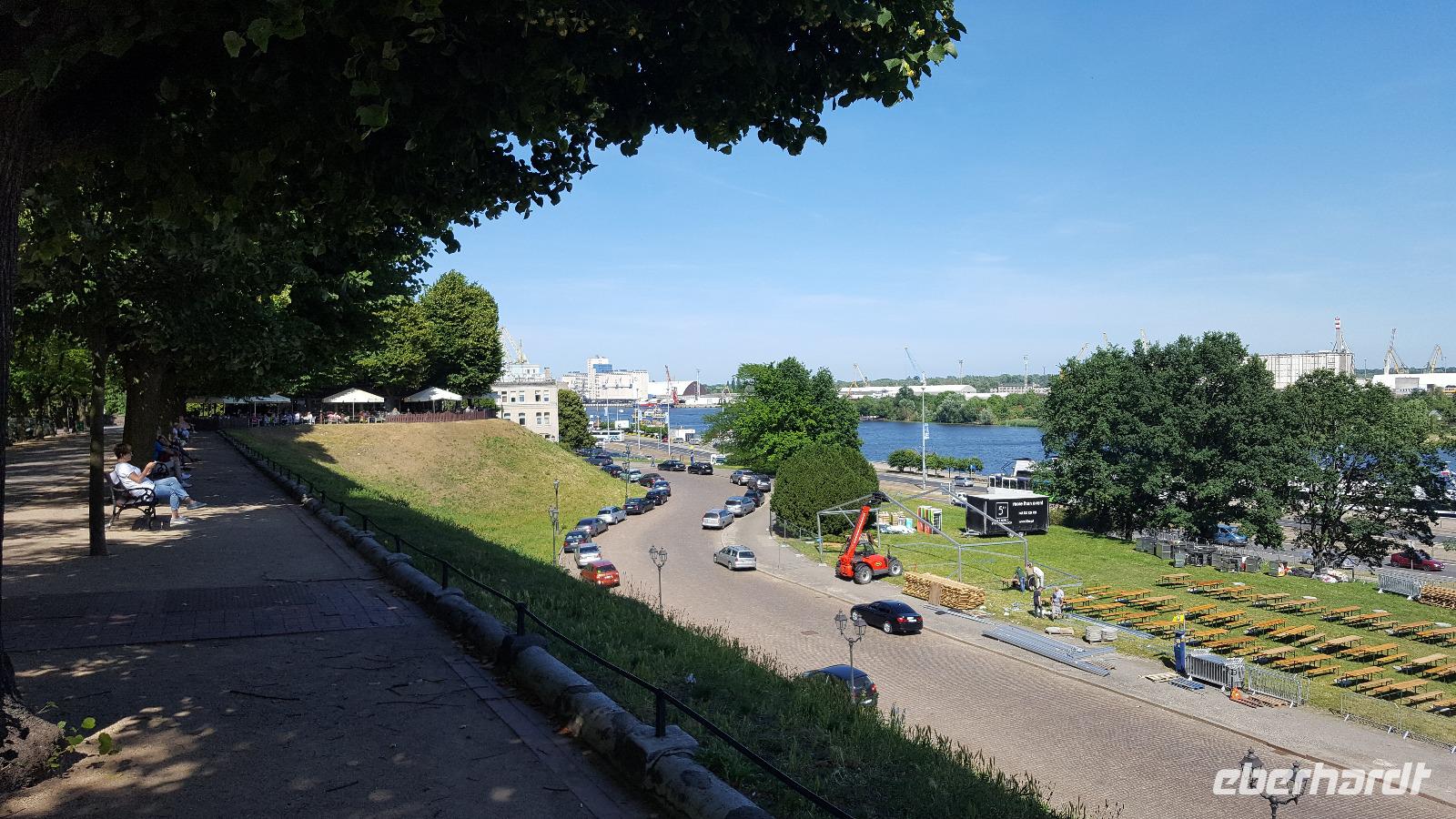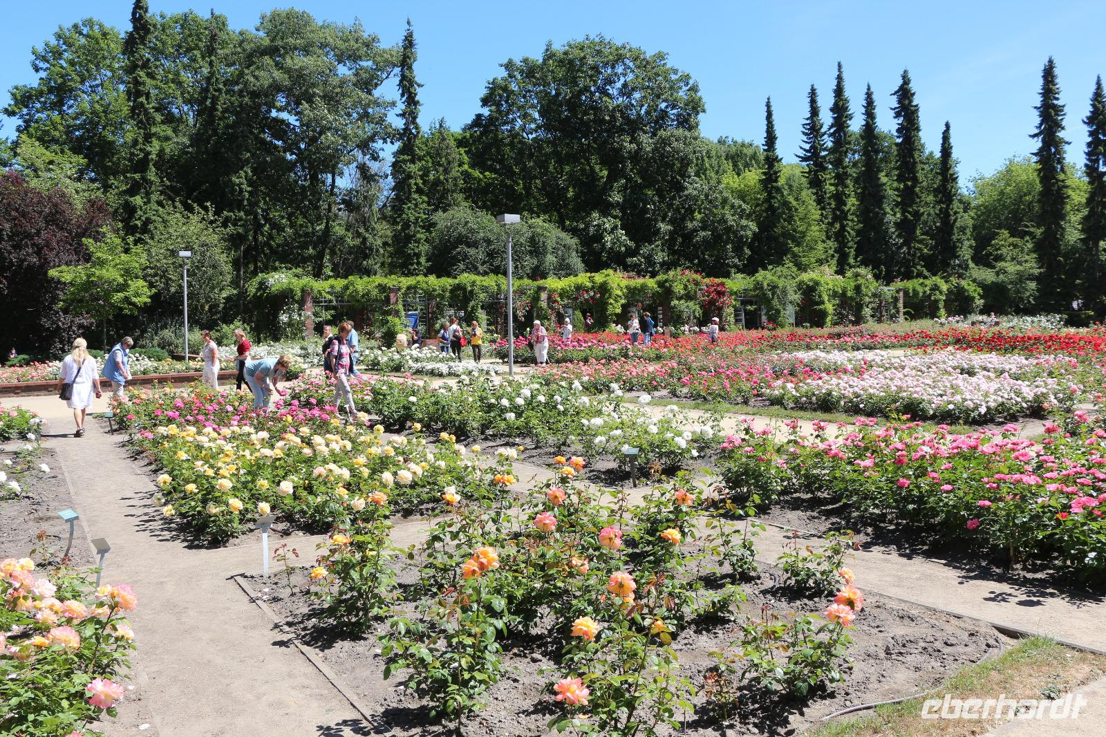 Dann ging es zu Fuß weiter in die innere Altstadt Stettins. Vorbei am historischen Marktplatz mit seinen hübschen bunten Ständehäusern und dem alten Rathaus spazierten wir zum Schloss der Pommern-Herzöge. Dabei erzählte uns Anna allerlei Wissenswertes zur Geschichte der Stadt und ihrer Bewohner, zu Liebesgeschichten, Hexen und Herzögen. Unsere Stadtrundfahrt ging vom Schloss weiter in die sehenswertesten Viertel der Stadt mit ihren alten Stadttoren, Kirchen und Parks. Wir staunten, wie grün und abwechslungsreich die siebtgrößte Stadt Polens ist. Wir besuchten den Rosengarten Stettins "Rozanka", in dem mehr als einhundert Rosenarten wachsen. Bei einem Spaziergang ließen wir die bunte Blütenpracht und den Duft der Rosen auf uns wirken. Bei unserer weiteren Rundfahrt durch den riesigen Quistorp-Park zeigte uns Anna die schönsten Villen, Alleen und Denkmäler. Das schöne Viertel gilt als das "Westend" von Stettin. Entlang der Hauptpromenaden und dem sternförmigen Plac Grunwaldski fuhren wir zurück in Richtung Innenstadt. Zurück am Hochhaus Pazim stiegen wir aus dem Bus aus und legten eine Mittagspause ein. Ein Großteil unserer Reisegruppe fuhr mit Kristin zum höchstgelegenen Café Stettins hinauf, dem "Café 22" in der 22. Etage des Pazim-Hochhauses. Von etwa 90 Metern Höhe hat man hier einen wunderbaren Blick über Stettin, den Dammschen See (Dabie) und den Flusslauf der Oder. Bei Kaffee, Eis und leckeren Slalaten und Snacks genossen wir die Aussicht. Gleich neben dem Pazim-Gebäude befindet sich das Einkaufszentrum Galaxy, in dem man neben Geschäften auch viele Möglichkeiten zum Mittagessen findet.