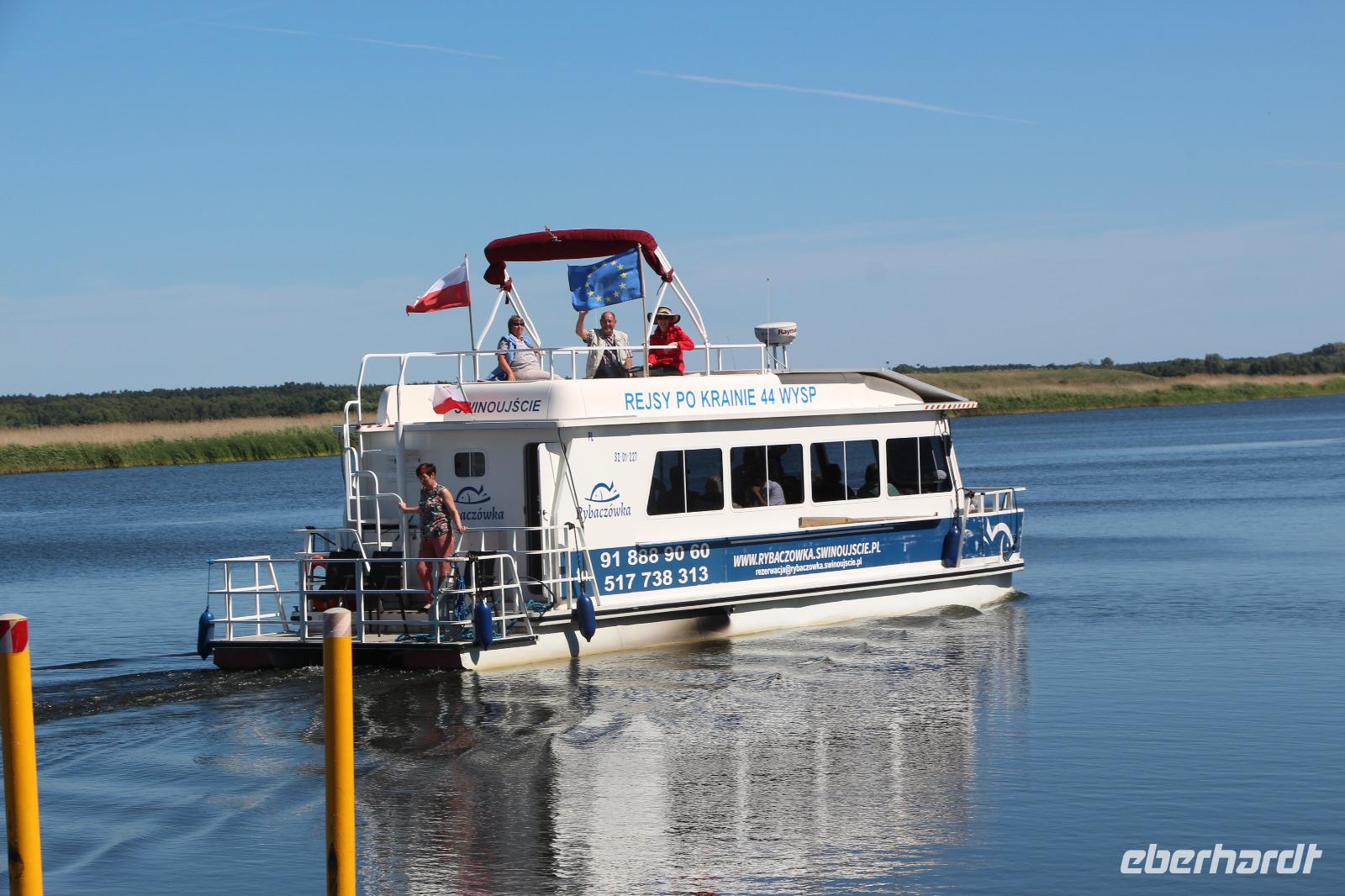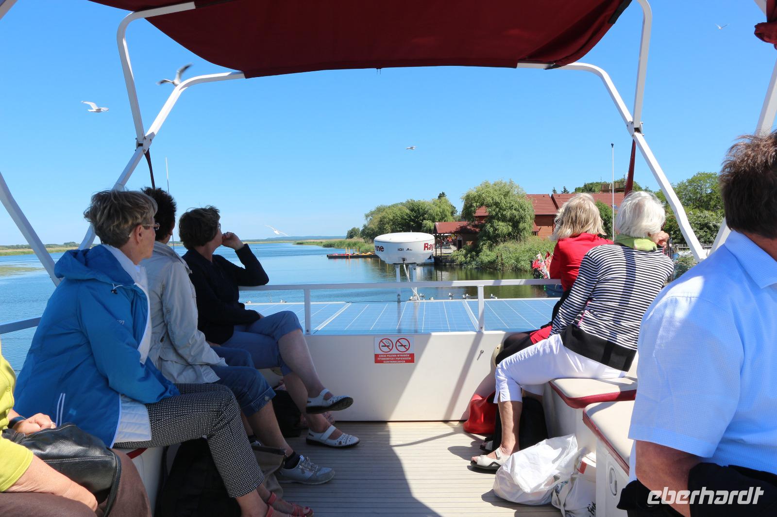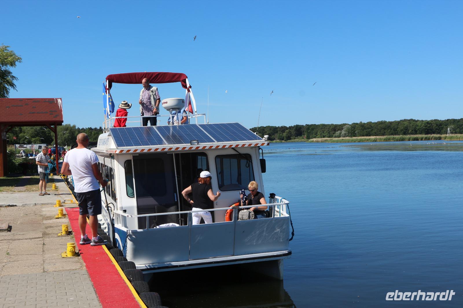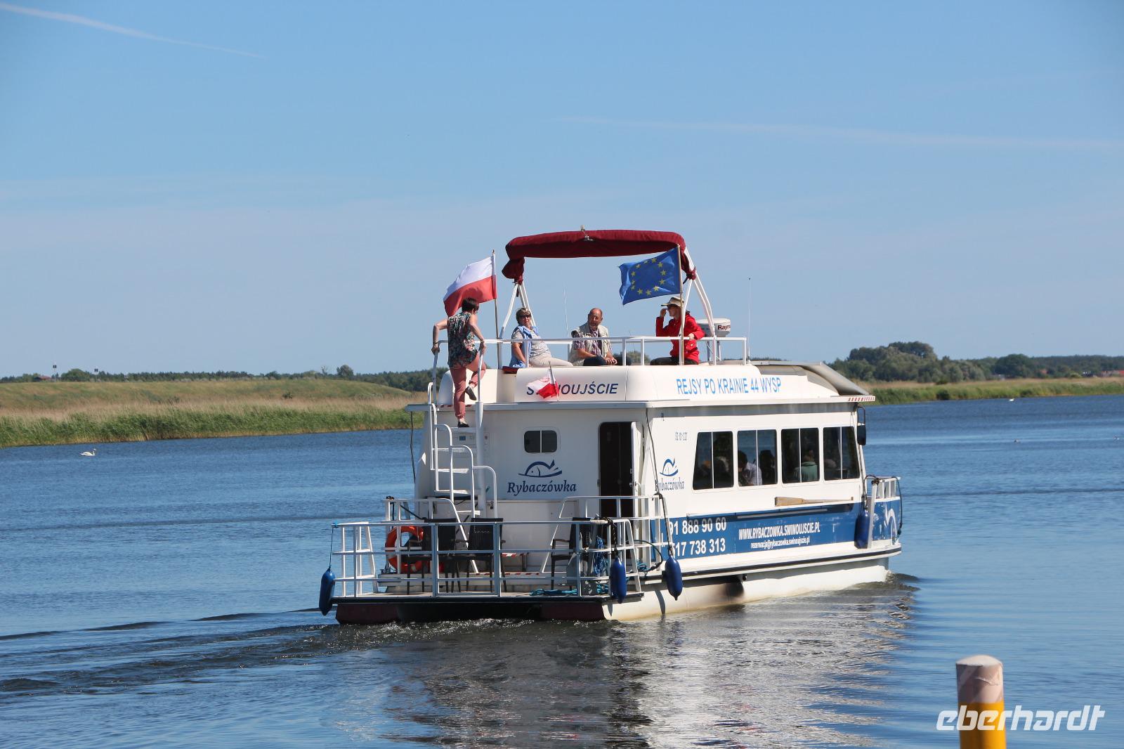 Am dritten Tag unserer Singlereise unternahmen wir einen spannenden Ganztagesausflug an die Ostsee und das Stettiner Haff. Unsere Reiseleiterin Anna holte uns nach dem Frühstück direkt am Hotel ab und wir fuhren mit dem Bus etwa 1,5 Stunden zur Insel Wolin und zur kleineren Insel Karsibor, die nur durch einen Kanal von der Insel Usedom getrennt ist. In einem kleinem ursprünglichen Dorf auf Karsibor erwartete uns der erste Programmpunkt - eine Bootsfahrt im idyllischen Delta des Flusses Swine, nach dem auch der bekannte Badeort Swinemünde benannt ist. In zwei Gruppen schipperten wir mit einem kleinen Katamaran-Motorboot durch die Flusslandschaft, die Lebensraum vieler seltener Wasservögel ist. Die jeweils andere Gruppe entspannte sich auf der Hotelterrasse am Bootsanleger bei Kaffee und Kuchen. Auch zu einem Spaziergang, zum Ausblick vom Aussichtsturm, zum Paddeln oder Tretbootfahren war hier die Möglichkeit. Danach besuchten wir die kleine Dorfkirche auf Karsibor, um deren Erhalt sich die Dorfbewohner mit viel Liebe und Leidenschaft kümmern.
