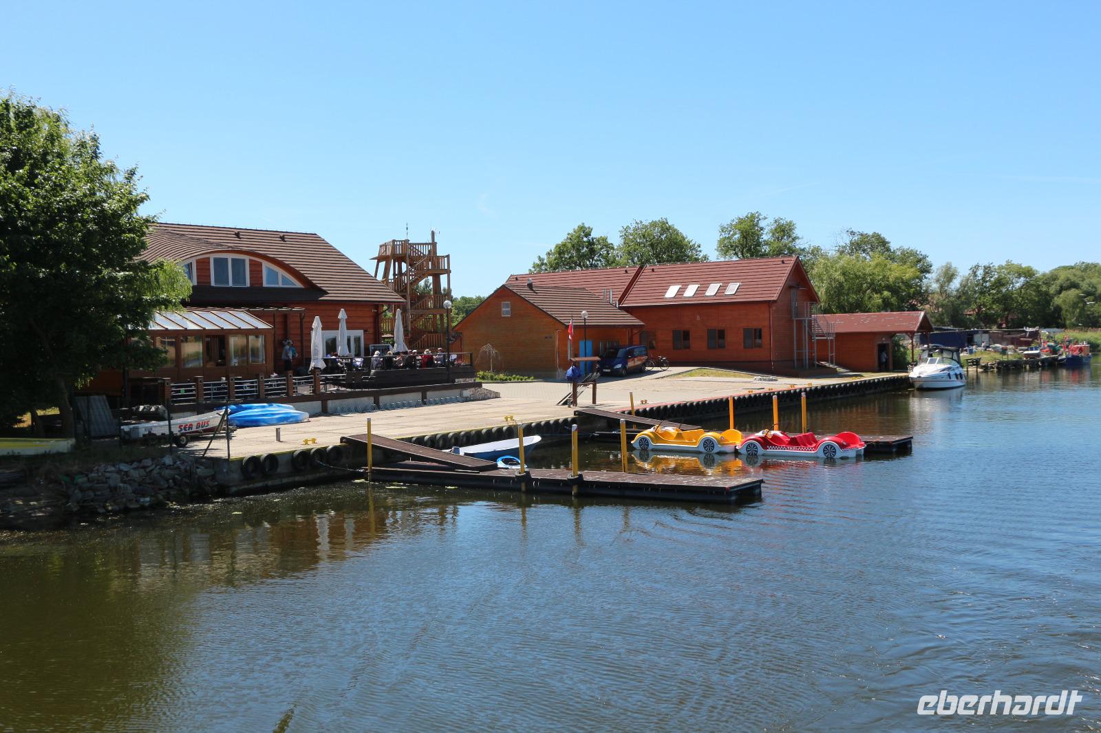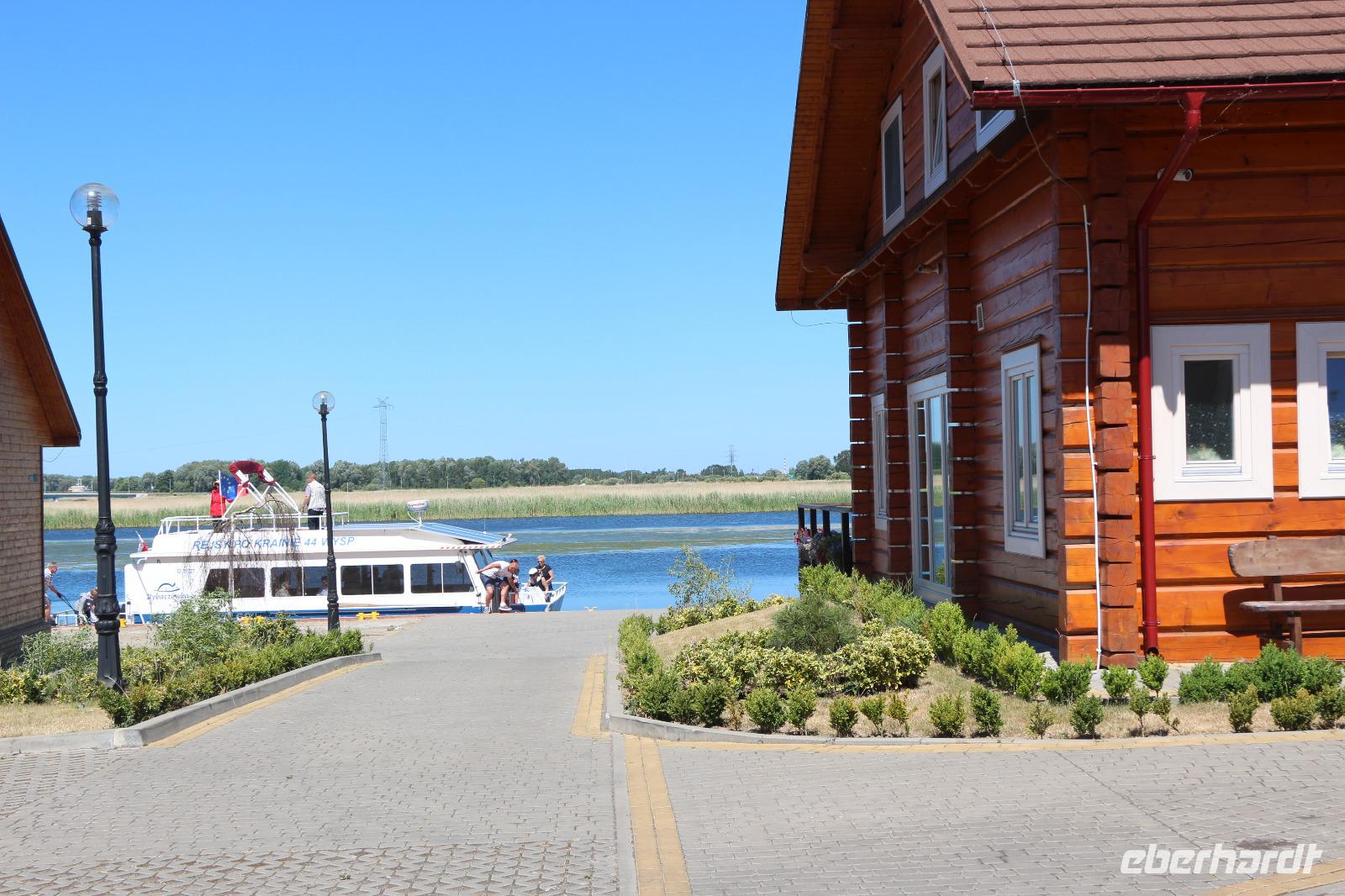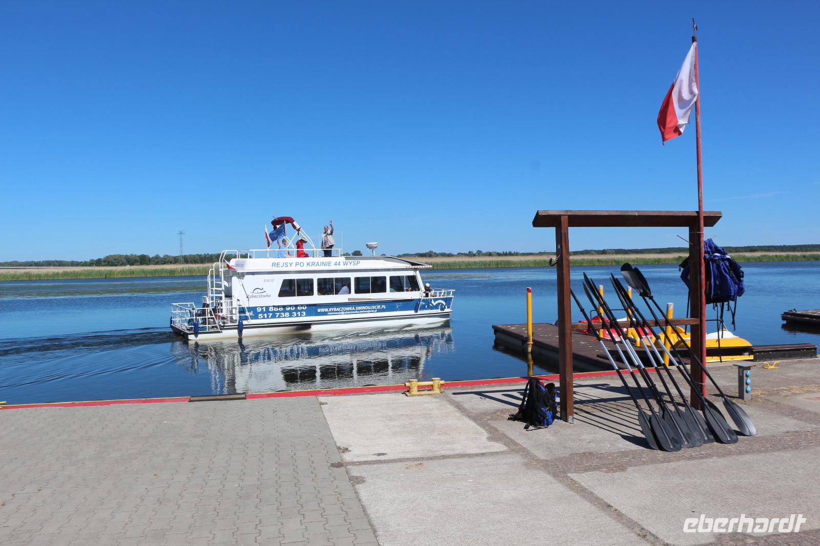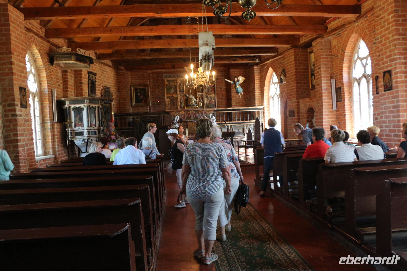 Am dritten Tag unserer Singlereise unternahmen wir einen spannenden Ganztagesausflug an die Ostsee und das Stettiner Haff. Unsere Reiseleiterin Anna holte uns nach dem Frühstück direkt am Hotel ab und wir fuhren mit dem Bus etwa 1,5 Stunden zur Insel Wolin und zur kleineren Insel Karsibor, die nur durch einen Kanal von der Insel Usedom getrennt ist. In einem kleinem ursprünglichen Dorf auf Karsibor erwartete uns der erste Programmpunkt - eine Bootsfahrt im idyllischen Delta des Flusses Swine, nach dem auch der bekannte Badeort Swinemünde benannt ist. In zwei Gruppen schipperten wir mit einem kleinen Katamaran-Motorboot durch die Flusslandschaft, die Lebensraum vieler seltener Wasservögel ist. Die jeweils andere Gruppe entspannte sich auf der Hotelterrasse am Bootsanleger bei Kaffee und Kuchen. Auch zu einem Spaziergang, zum Ausblick vom Aussichtsturm, zum Paddeln oder Tretbootfahren war hier die Möglichkeit. Danach besuchten wir die kleine Dorfkirche auf Karsibor, um deren Erhalt sich die Dorfbewohner mit viel Liebe und Leidenschaft kümmern.