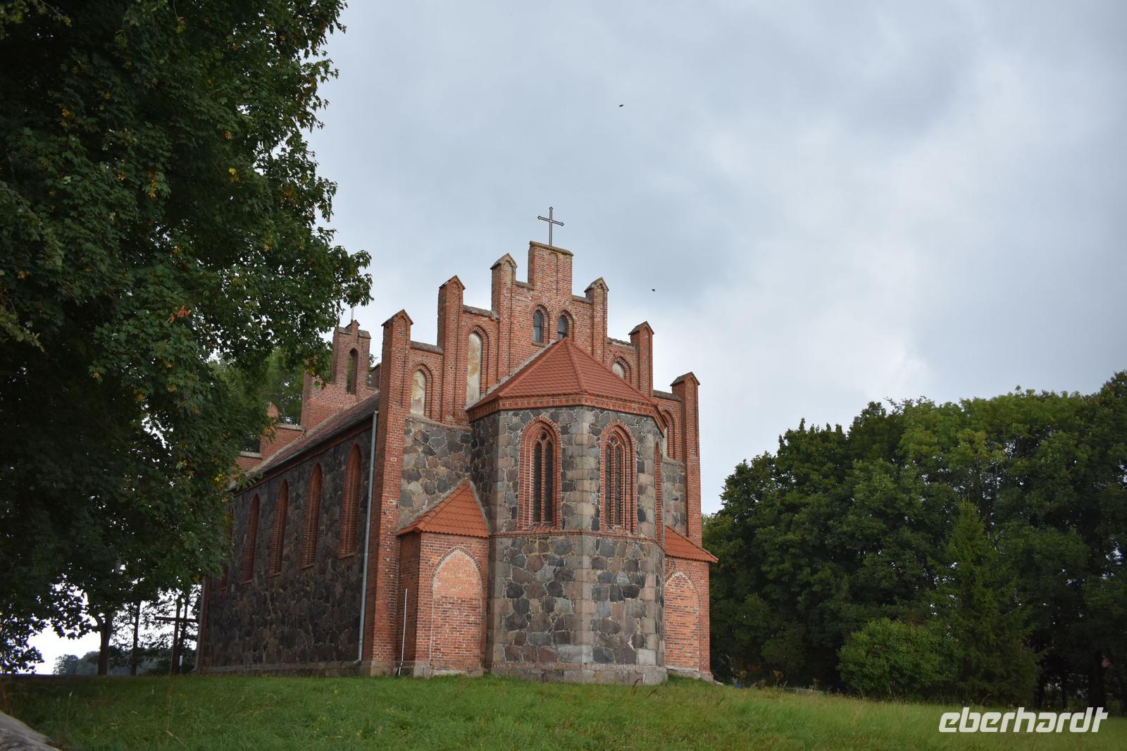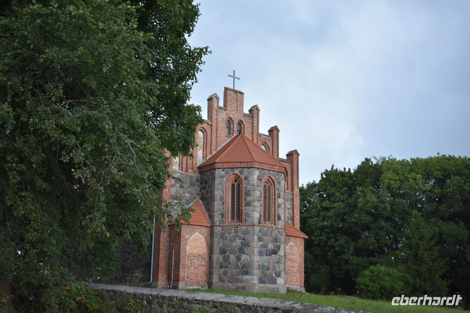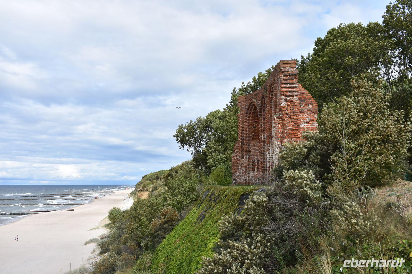 Nach dem Frühstück fuhren in Richtung Kolberg-Zentrum, immer an der Kolberger Promenade entlang, am Denkmal der „Hochzeit mit dem Meer" vorbei, bis zum Kolberger Leuchtturm. 1945 wurde das Wahrzeichen Kolbergs erbaut und strahlt mit Feuerhöhe von rund 36 Metern den Seefahrern entgegen. Von dort ging es immer nach Westen an der Küste entlang. Wir radelten durch die Ortschaften Dzwirzyno, Rogowo und Mrzezyno. Abwechselnd sahen wir die typisch polnischen Märkte und Spielbuden sowie die tolle, beruhigende Landschaft. Immer wieder konnte man durch die Nadelbäume die Ostsee schimmern sehen. An einem Aussichtspunkt, dem ohne Namen, konnten wir unberührten Ostseestrand bewundern. Durch die Wälder ging es auf Schotterwegen bis nach Pogorzelica. Am Nachmittag fuhren wir mit der Schmalspurbahn gemütlich von Pogorzelica nach Rewal, und weiter bis nach Hoff. In Hoff standen wir nun am 15. Längengrad. Aber Hoff ist vor allem für seine Kirchenruine bekannt. Über Jahrhunderte wurde die Küste immer weiter abgetragen - so kam es also dazu, dass die einst zwei Kilometer von der Küste entfernte Kirche zur Hälfte ins Wasser gerissen wurde und heute an einer Klippe steht. Eine Legende besagt, dass Neptun sich eine seiner Töchter wiederholen wollte, die von den Dorfbewohnern geraubt und auf dem Friedhof begraben wurde. So verschlang das Meer das halbe Dorf und die halbe Kirche. In Hoff versorgten wir uns mit den wohl besten Fischbrötchen in Pommern. Aber Eis natürlich auch! Auch wenn es etwas frisch war. Mit dem Bus ging es dann zurück ins Hotel nach Kolberg.