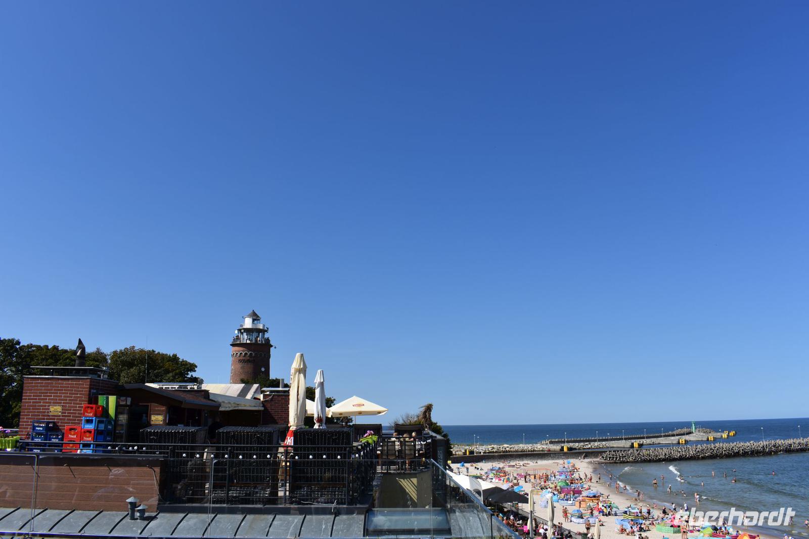 Unser erster Radtag startete mit einer Busfahrt zu einem pommerschen Landhaus. In Osieki, auf dem Gutshof Dworek Osieki, luden wir die Fahrräder ab und starteten in Richtung Lazy. Die ersten Kilometer fuhren wir im Grunde immer am Jamno Bodden entlang. Nach kurzer Eingewöhnungsphase zischten wir mit den E-Bikes an der polnischen Ostseeküste entlang. Im polnischen Ibiza. In Mielno machten wir eine Pause. Neben der glänzenden Seehundskulptur konnte man ein paar Waffeln probieren. Direkt hinter der Skulptur, die auch eine nette Geschichte symbolisiert, ging es zum Strand. Es war ziemlich windig, fast schon ungemütlich. Aber man konnte hier einige Kitesurfer beobachten, die mit ihrem Drachen rein und rausfuhren und ein paar Sprünge, beziehungsweise Flüge über die Wellen machten. Von Großmöllen, wie Mielno früher genannt wurde, ging es weiter an der Küste entlang. Dort passierten wir auch den 16. Längengrad. Am Seebad Gaskach stoppten wir nochmal um den Leuchtturm näher zu betrachten oder ihn sogar zu besteigen. Und natürlich gab es hier wieder die Gelegenheit ein köstliches polnisches Eis zu verköstigen. Unsere Radtour führte uns weiter am Kolberger Flughafen vorbei, bis zum Ekopark Wschodni, wo wir die Aussicht auf die Natur genießen konnten. Nun hatten wir schon fast die 50 Tages-Kilometer vollgemacht - es war nun nur noch ein Katzensprung mit unseren Fahrrädern bis zum Hotel.