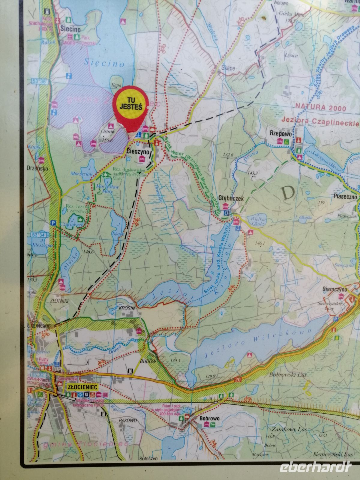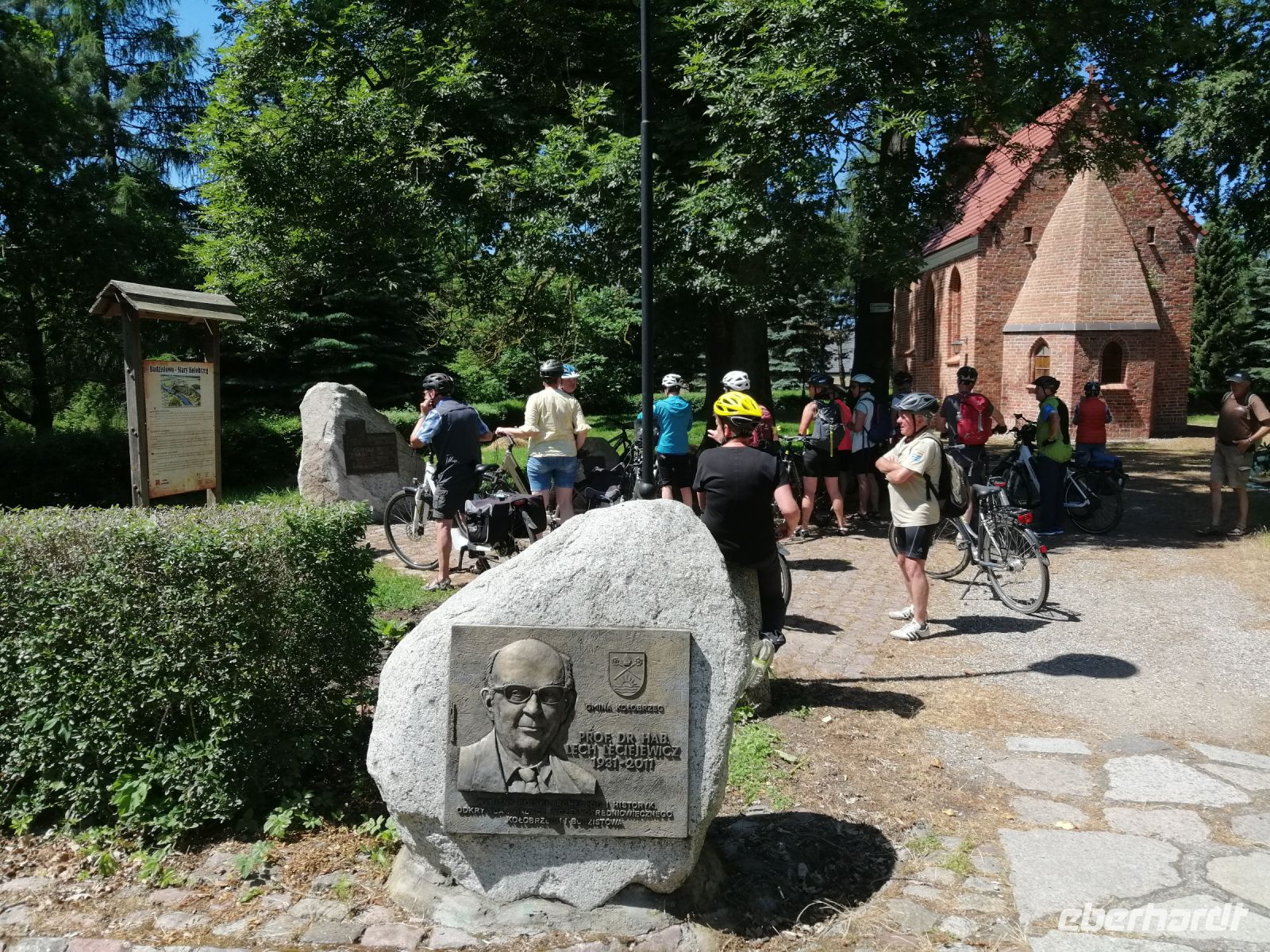 Heute wurden wir ebenfalls von der Claudia begleitet. Wir trafen uns nach dem Frühstück vom Hotel und fuhren zuerst Richtung Kolberg und danach in das Landesinnere (Hinterpommern), weg von der Ostsee. Unterwegs besichtigten wir die Kriegsgräberstätte der polnischen und sowjetischen Truppen aus dem zweiten Weltkrieg. Den nächsten Stopp machten wir in Goscino (Groß Jestin). Hier erzählte uns Claudia die Legende der Heiligen Katharina und was auf sich das rum liegende Wagenrad hat. Gegen Mittag erreichten wir das Schloß Ryman und machten hier Mittagspause. In einem sehr schön eingerichteten Speiseraum des Schloß Restaurants wurden uns Piroggen serviert: eine polnische Spezialität - Teigtaschen gefüllt mit Fleisch oder mit Quark. Nach der Mittagspause fuhren wir weiter und besichtigten unterwegs eine 600-Jahre alte Buche. Gegen 15:30 Uhr erreichten wir das Endziel der heutigen Radtour am Rzesznikowo See. Robert wartete auf uns mit dem Fahrradanhänger und der Busfahrer brachte uns wieder zum Hotel. Wir verabschiedeten uns von Claudia, denn ab Donnerstag ist Sylwester wieder im Einsatz. Nach dem Abendessen trafen sich noch einige von uns an der Bar und tauschten sich mit Bilder und Eindrücken des erlebnisreichen Tages aus.