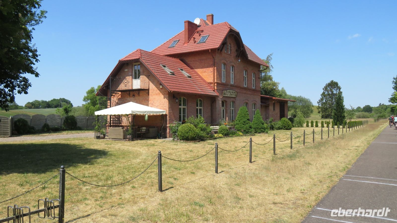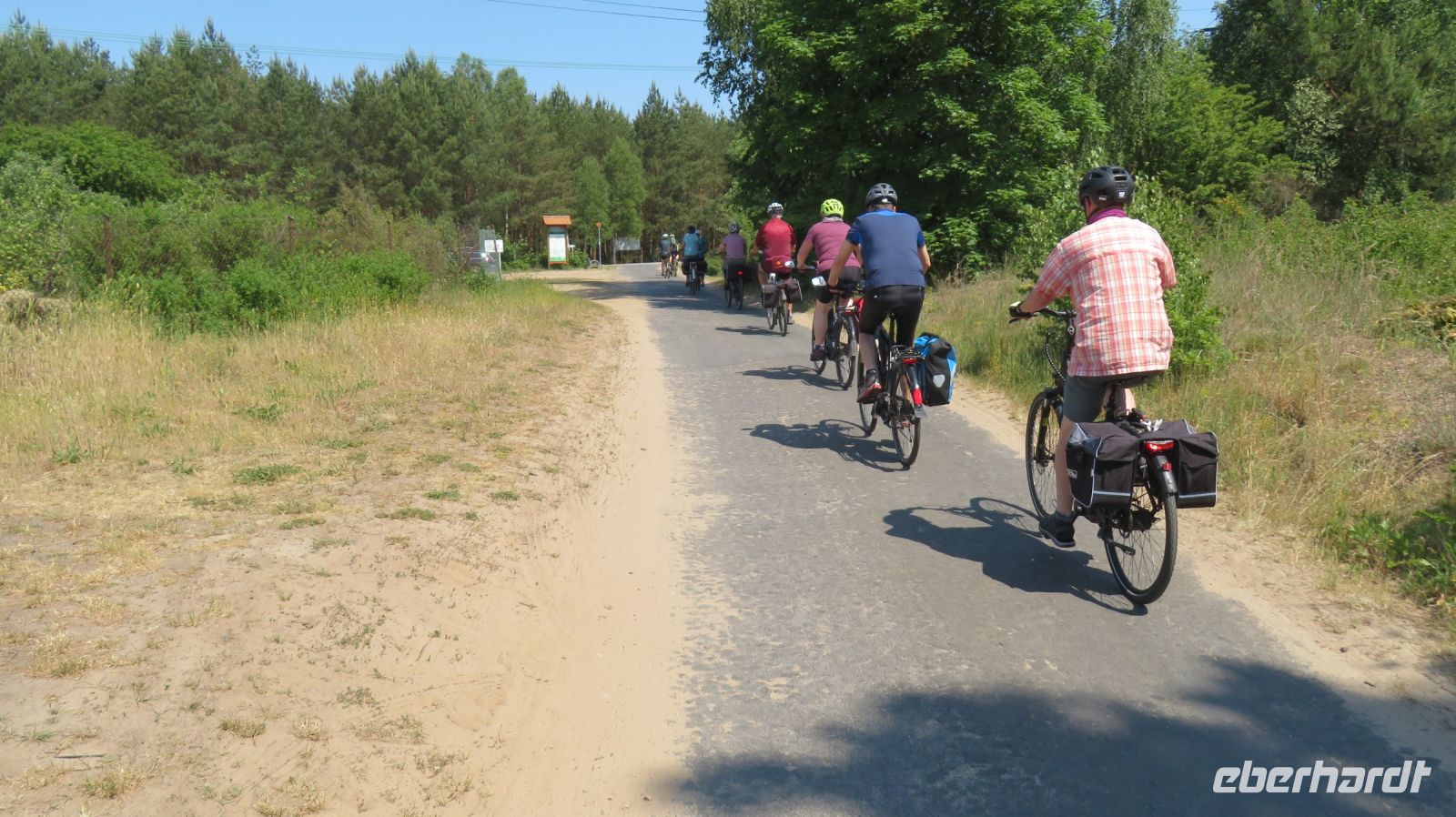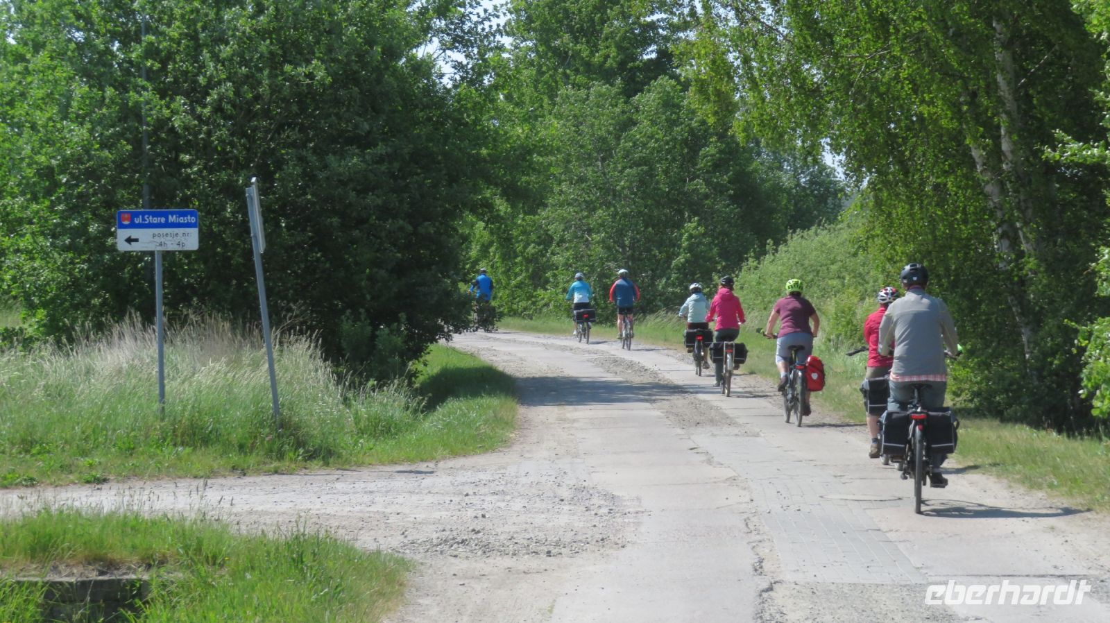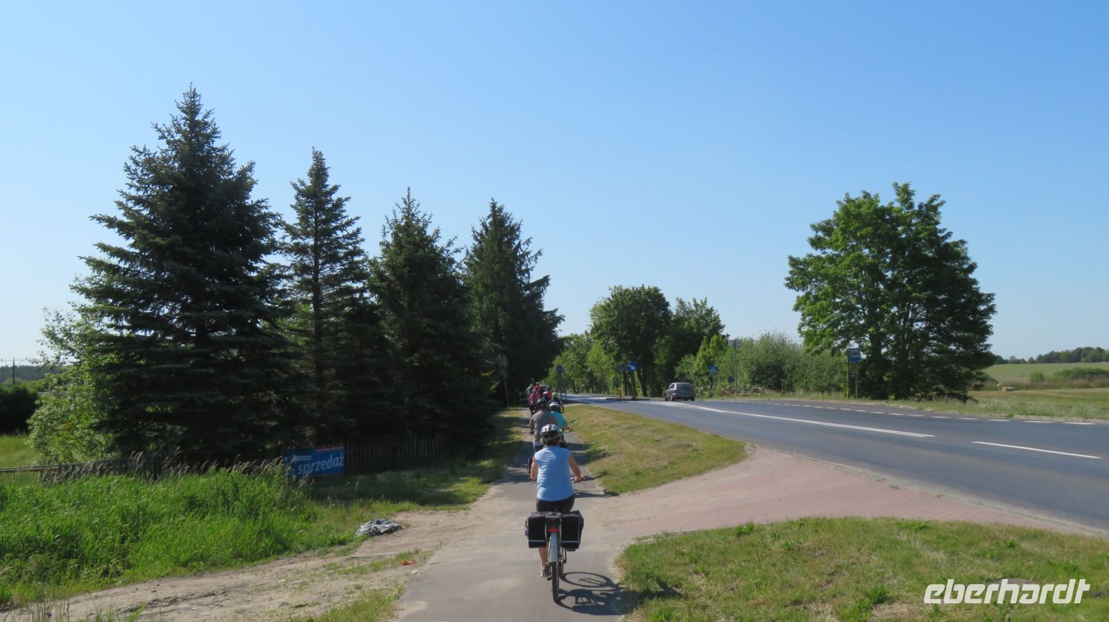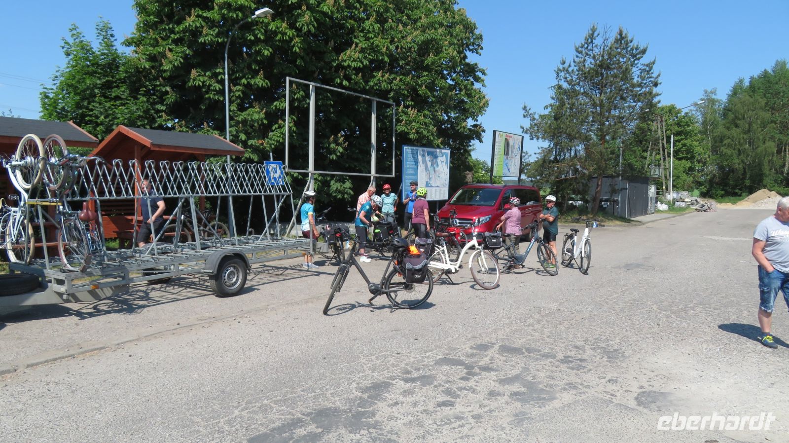 Mit den Transferbussen legten wir eine längere Strecke zurück, bevor unsere Radtour in Zlocieniec begann. Da dieser Tag in Polen ein Feiertag war, konnten wir in Zlocieniec einer kirchlichen Prozession beiwohnen. Auf einer ehemaligen Schmalspurbahnstrecke umrundeten wir die Pommersche Seenplatte, vorbei an heute privat genutzten Bahnhofsgebäuden. Am Badesee bei Skape machten wir eine Pause und wer wollte, konnte baden gehen. In der Nähe von Slowianki war unser Transferfahrer Robert schon dabei, ein Grillpicknick für uns vorzubereiten.