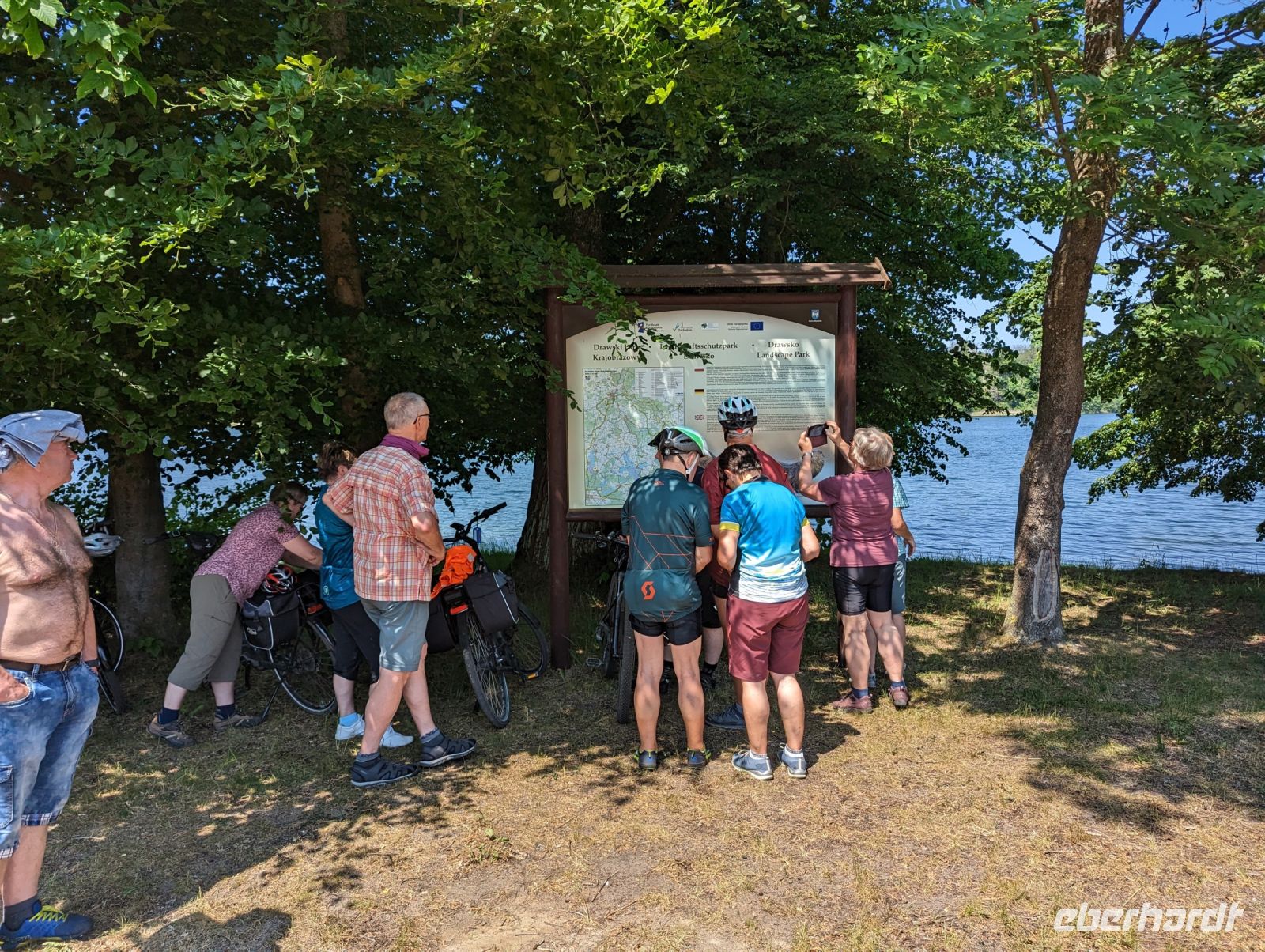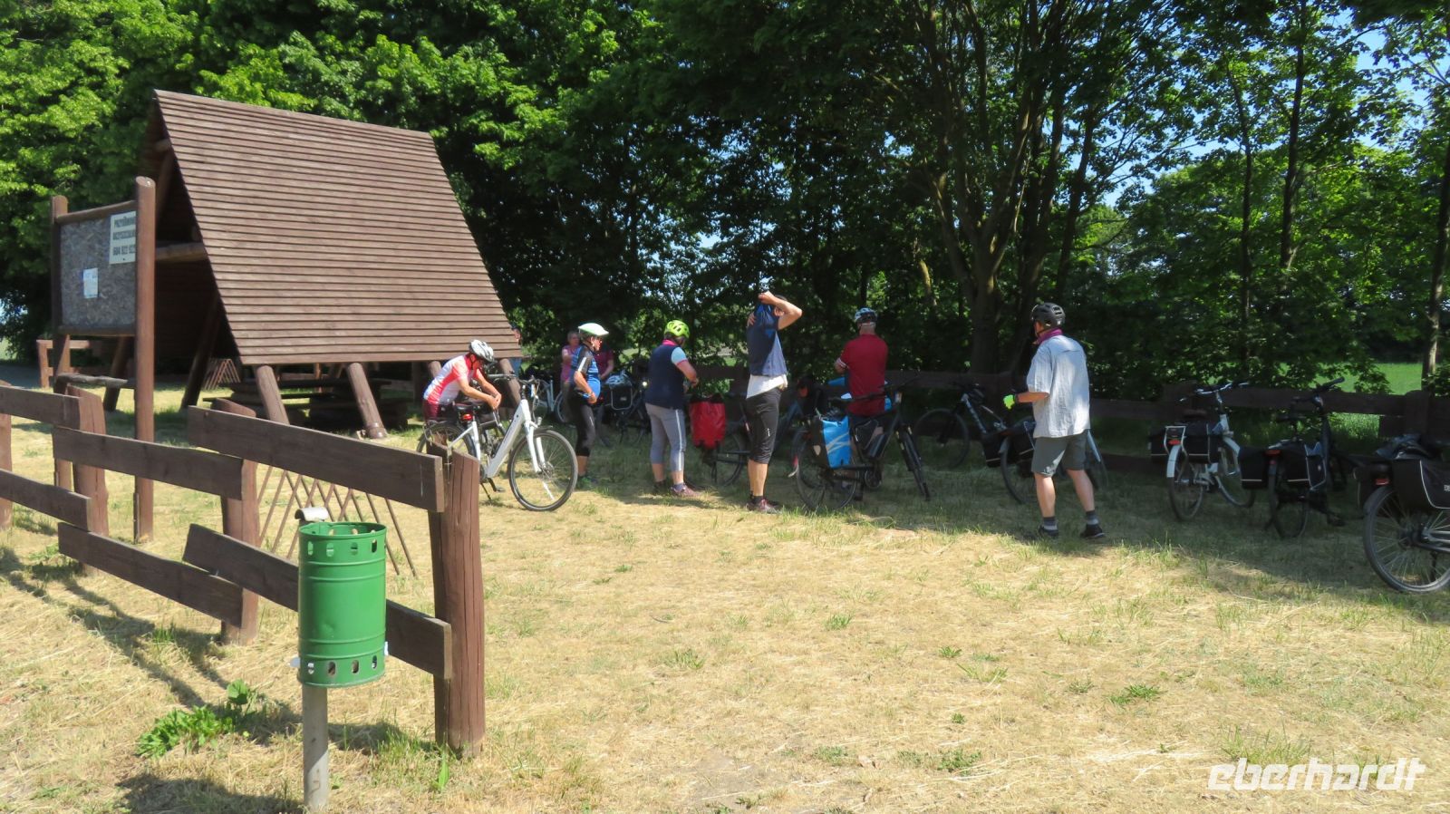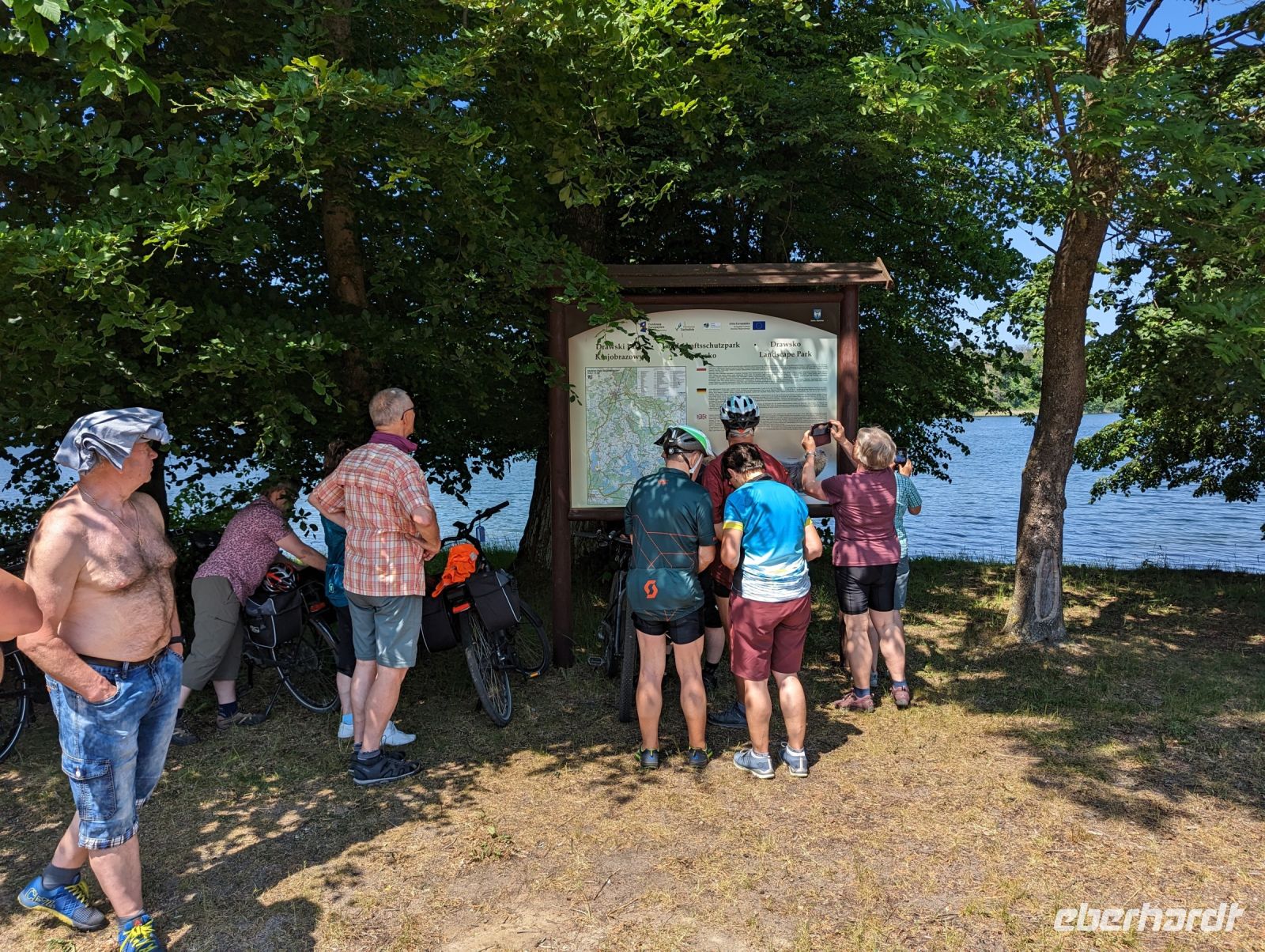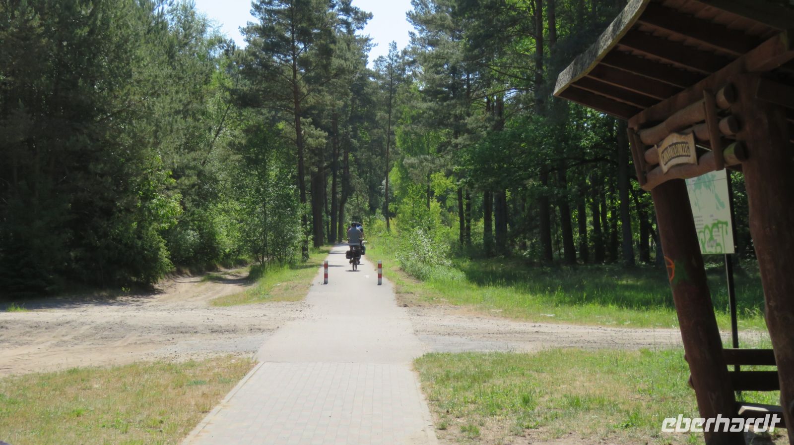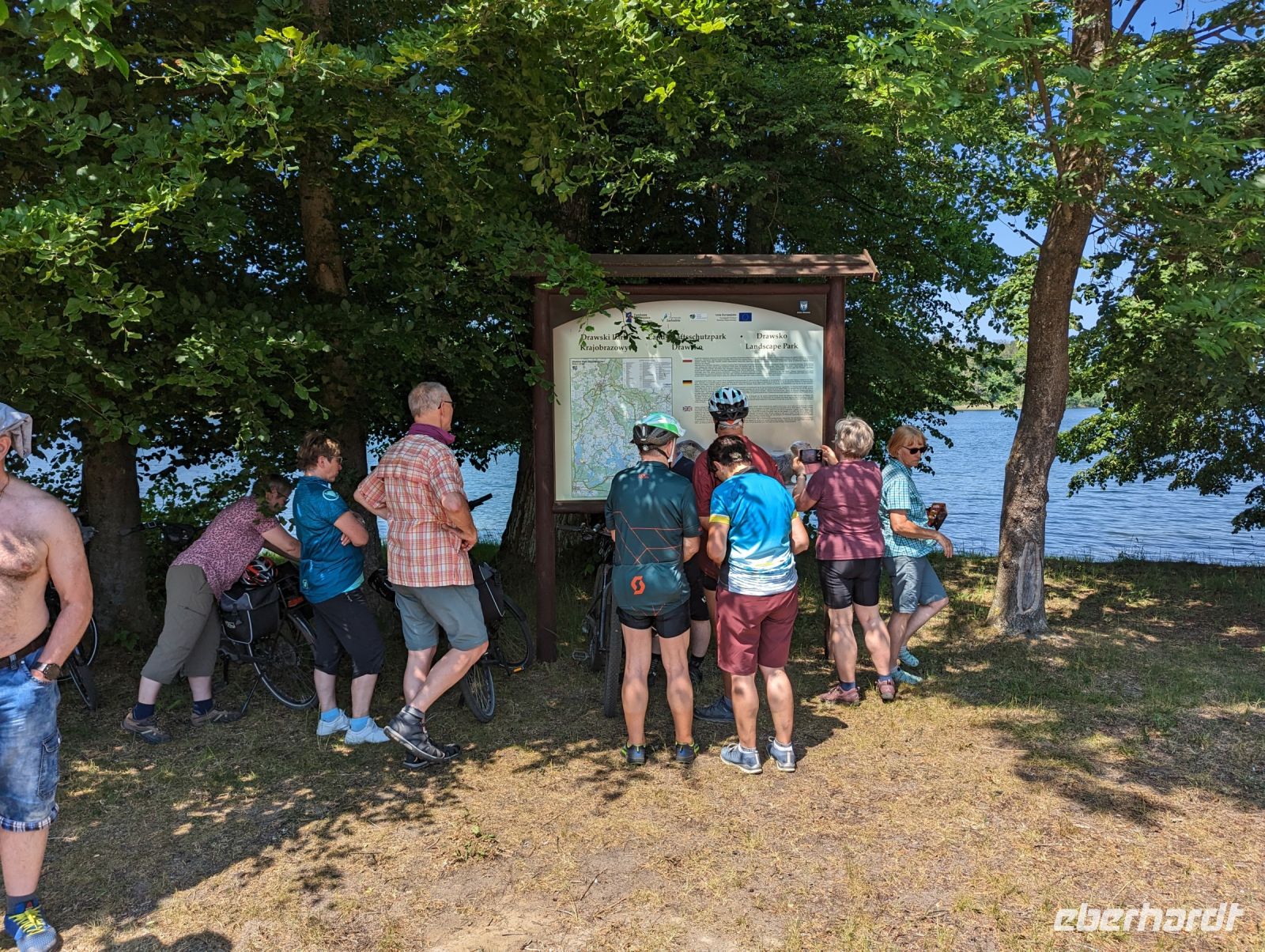 Mit den Transferbussen legten wir eine längere Strecke zurück, bevor unsere Radtour in Zlocieniec begann. Da dieser Tag in Polen ein Feiertag war, konnten wir in Zlocieniec einer kirchlichen Prozession beiwohnen. Auf einer ehemaligen Schmalspurbahnstrecke umrundeten wir die Pommersche Seenplatte, vorbei an heute privat genutzten Bahnhofsgebäuden. Am Badesee bei Skape machten wir eine Pause und wer wollte, konnte baden gehen. In der Nähe von Slowianki war unser Transferfahrer Robert schon dabei, ein Grillpicknick für uns vorzubereiten.