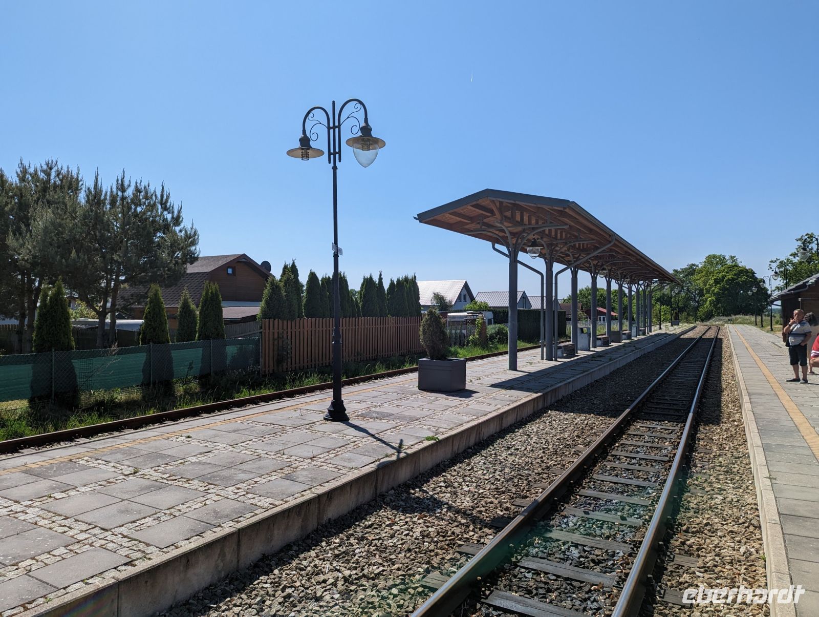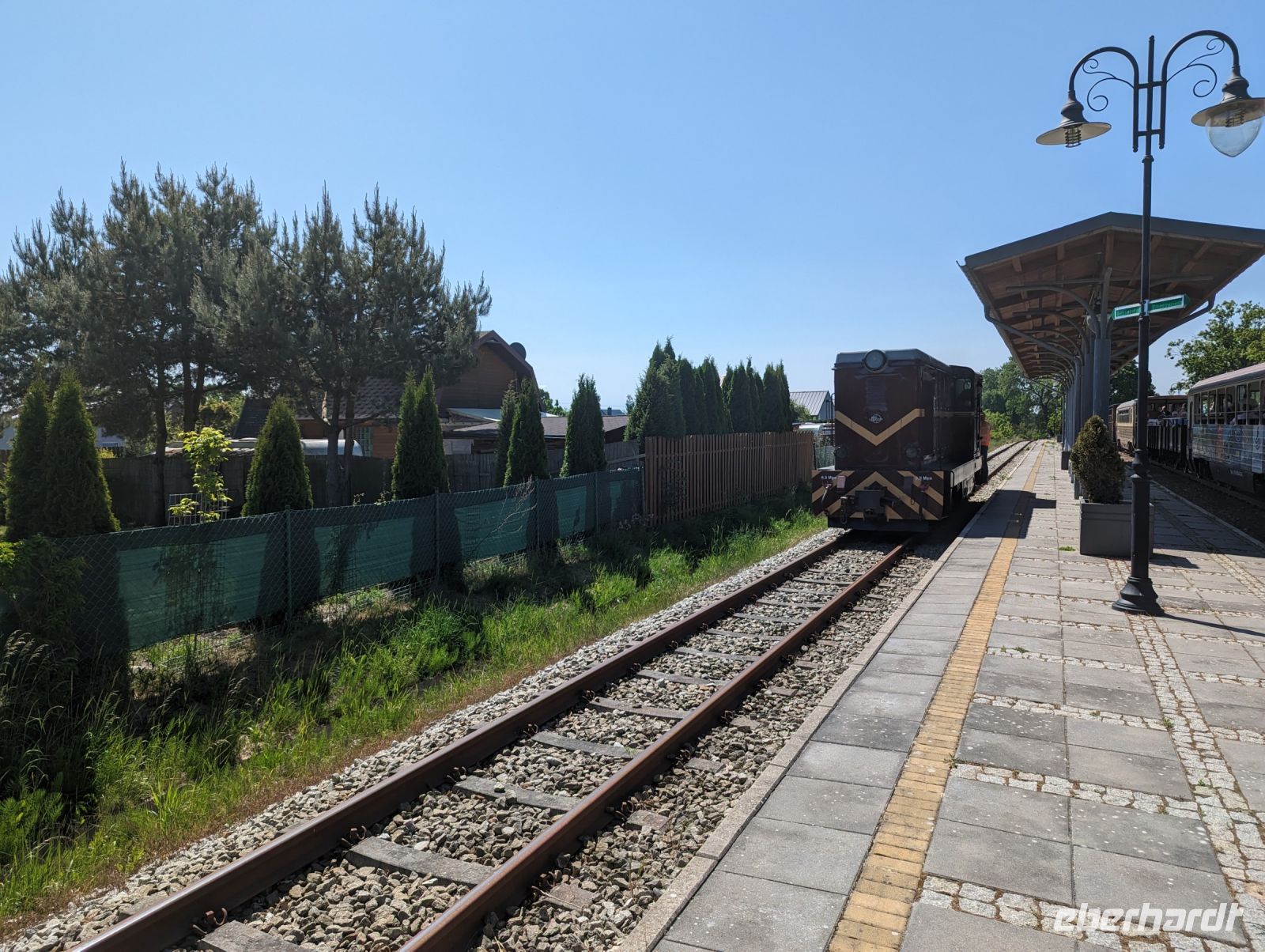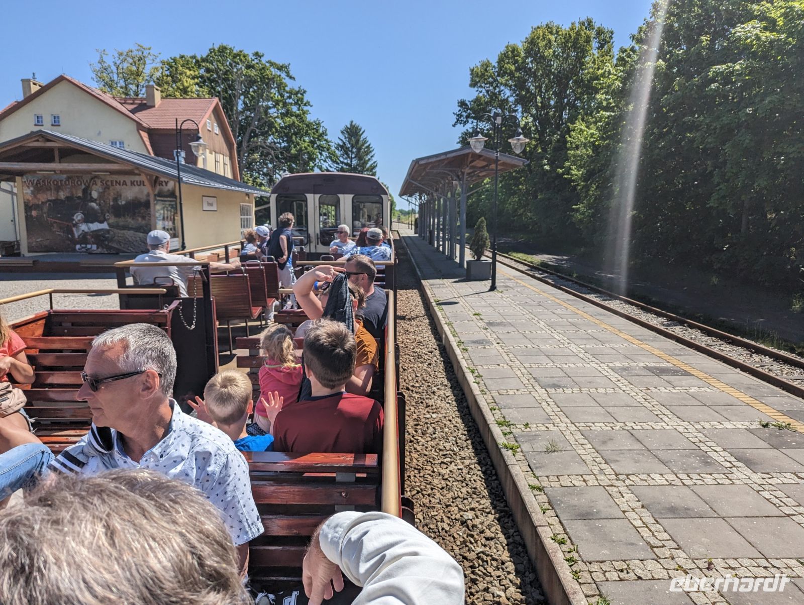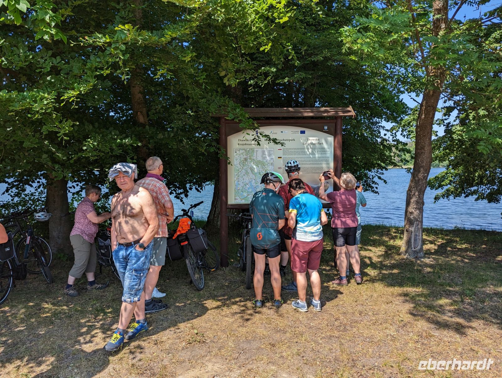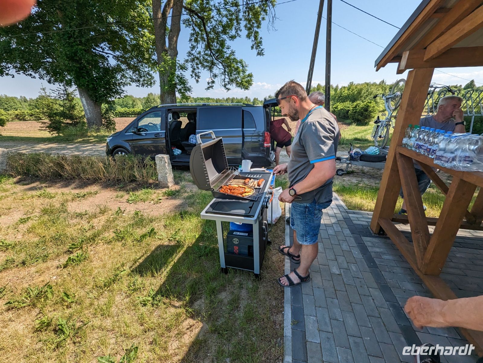 Mit den Transferbussen legten wir eine längere Strecke zurück, bevor unsere Radtour in Zlocieniec begann. Da dieser Tag in Polen ein Feiertag war, konnten wir in Zlocieniec einer kirchlichen Prozession beiwohnen. Auf einer ehemaligen Schmalspurbahnstrecke umrundeten wir die Pommersche Seenplatte, vorbei an heute privat genutzten Bahnhofsgebäuden. Am Badesee bei Skape machten wir eine Pause und wer wollte, konnte baden gehen. In der Nähe von Slowianki war unser Transferfahrer Robert schon dabei, ein Grillpicknick für uns vorzubereiten.
