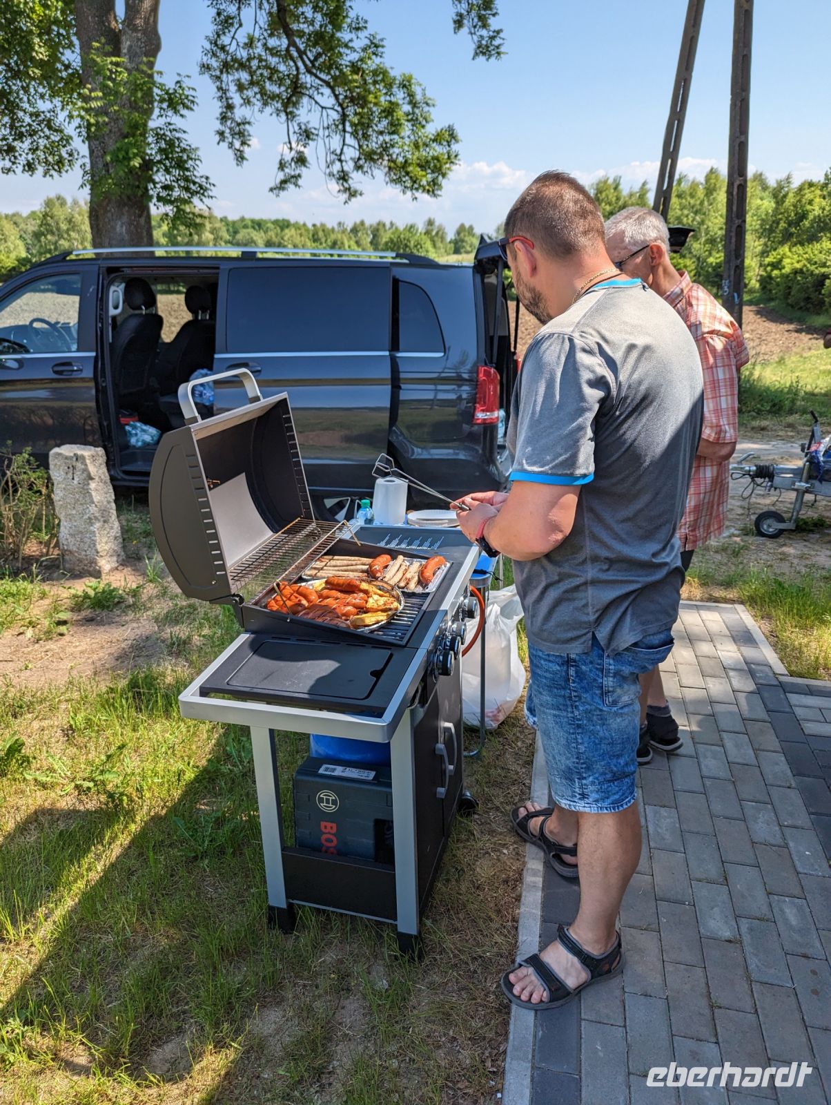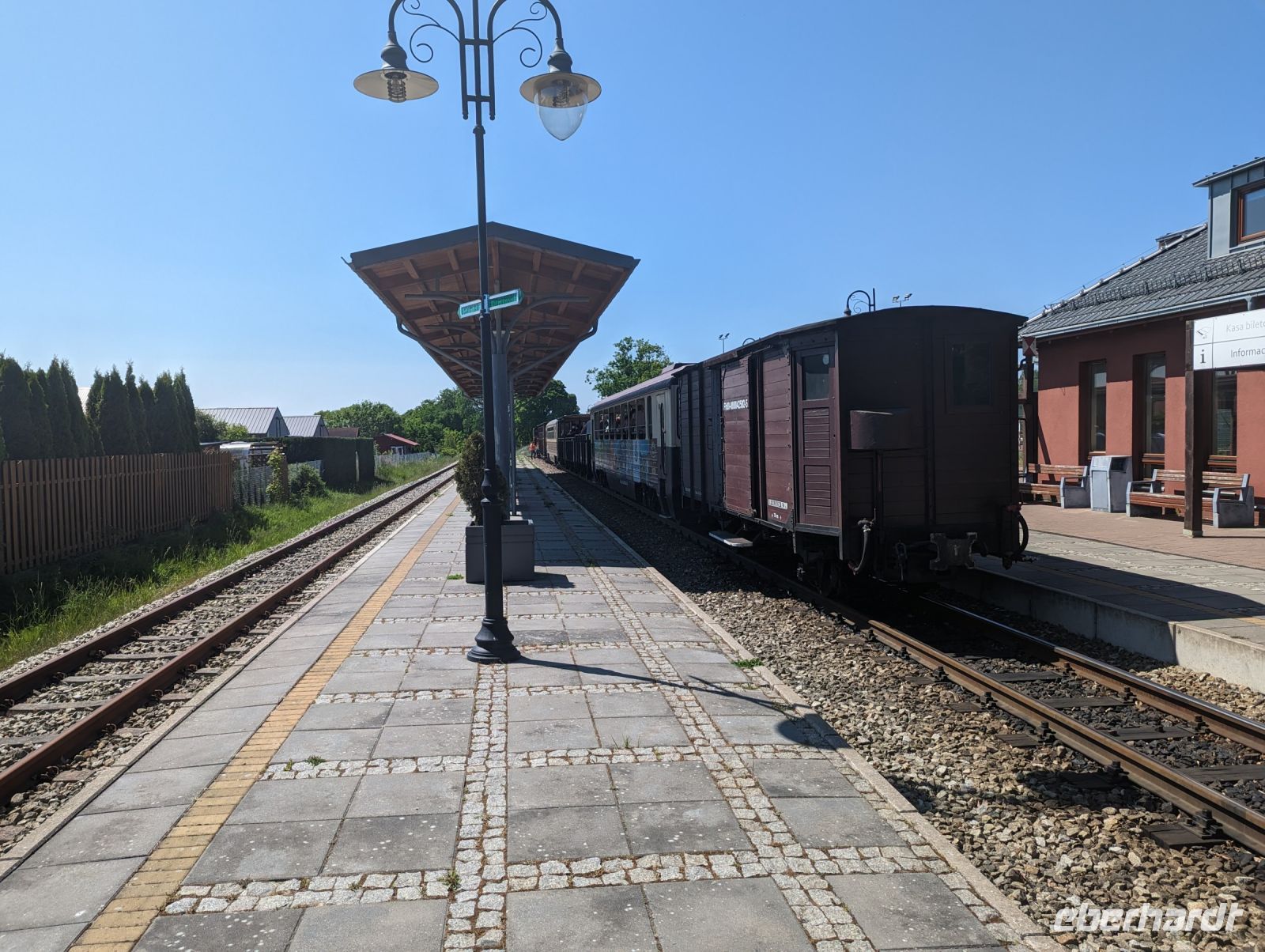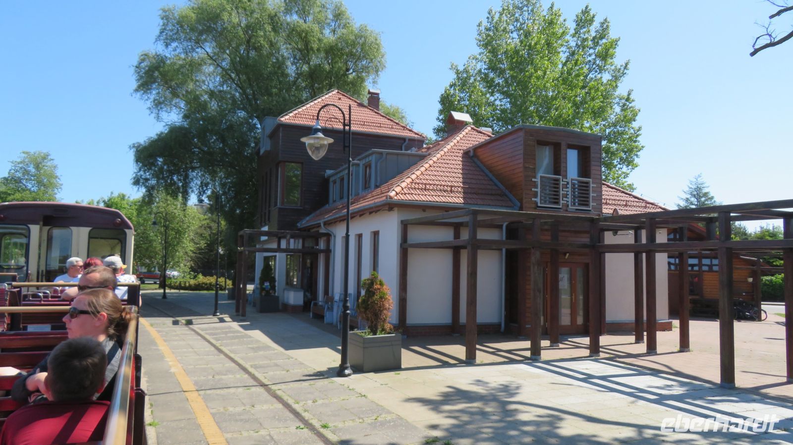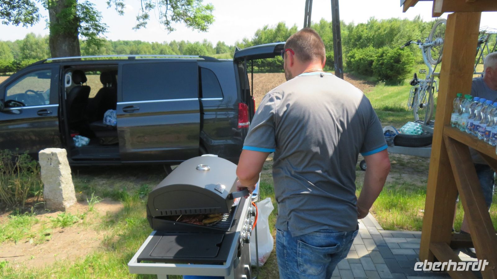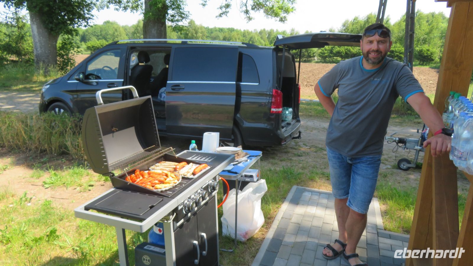 Mit den Transferbussen legten wir eine längere Strecke zurück, bevor unsere Radtour in Zlocieniec begann. Da dieser Tag in Polen ein Feiertag war, konnten wir in Zlocieniec einer kirchlichen Prozession beiwohnen. Auf einer ehemaligen Schmalspurbahnstrecke umrundeten wir die Pommersche Seenplatte, vorbei an heute privat genutzten Bahnhofsgebäuden. Am Badesee bei Skape machten wir eine Pause und wer wollte, konnte baden gehen. In der Nähe von Slowianki war unser Transferfahrer Robert schon dabei, ein Grillpicknick für uns vorzubereiten.
