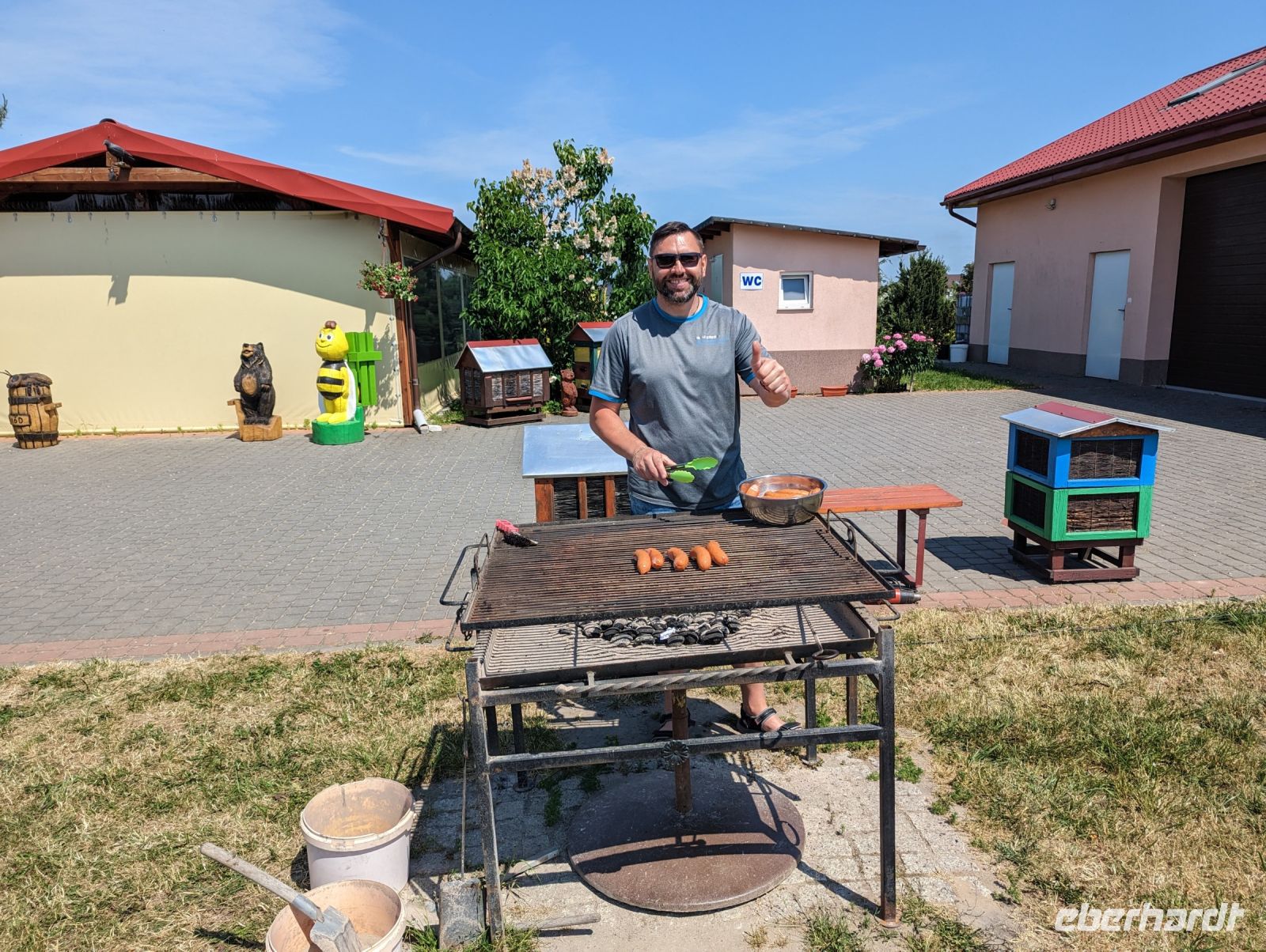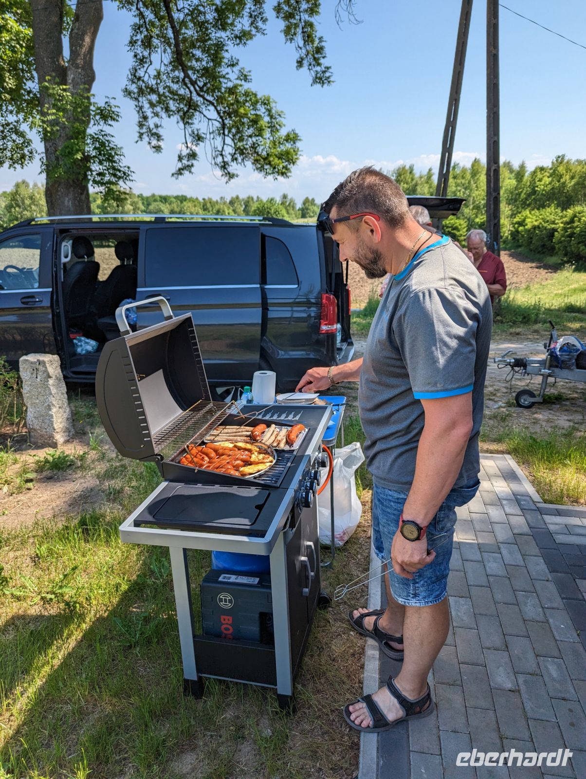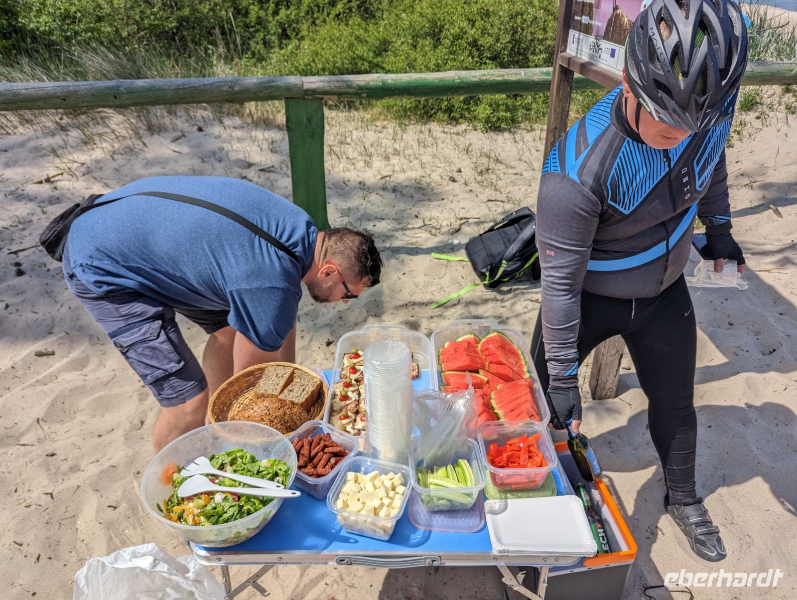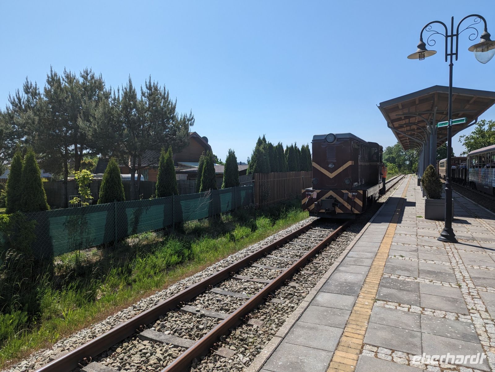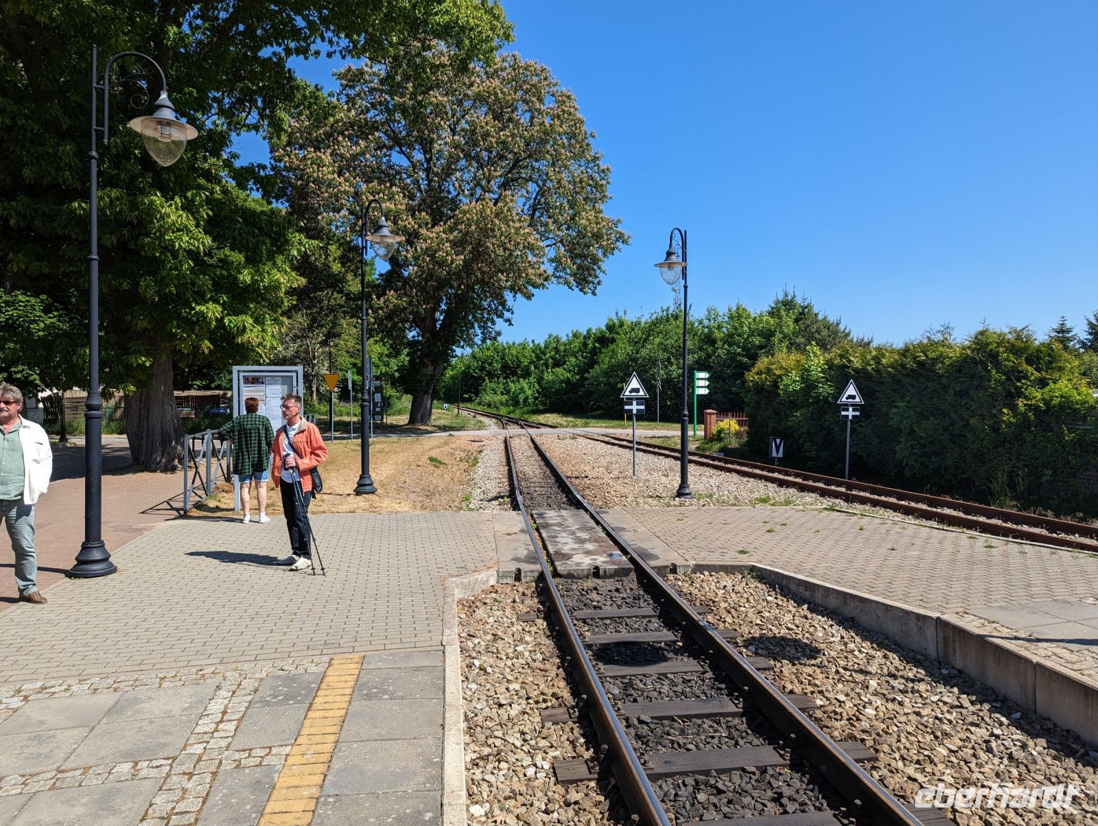 Mit den Transferbussen legten wir eine längere Strecke zurück, bevor unsere Radtour in Zlocieniec begann. Da dieser Tag in Polen ein Feiertag war, konnten wir in Zlocieniec einer kirchlichen Prozession beiwohnen. Auf einer ehemaligen Schmalspurbahnstrecke umrundeten wir die Pommersche Seenplatte, vorbei an heute privat genutzten Bahnhofsgebäuden. Am Badesee bei Skape machten wir eine Pause und wer wollte, konnte baden gehen. In der Nähe von Slowianki war unser Transferfahrer Robert schon dabei, ein Grillpicknick für uns vorzubereiten.