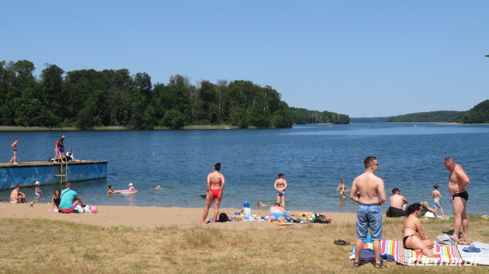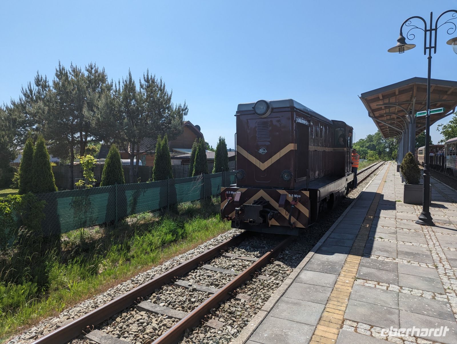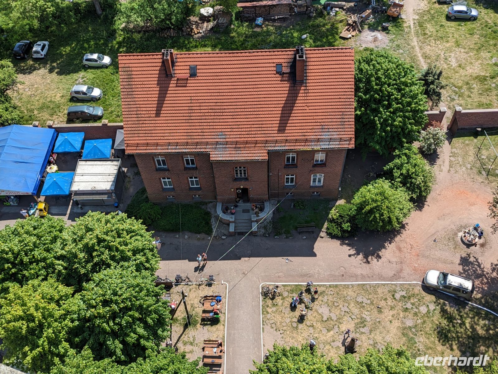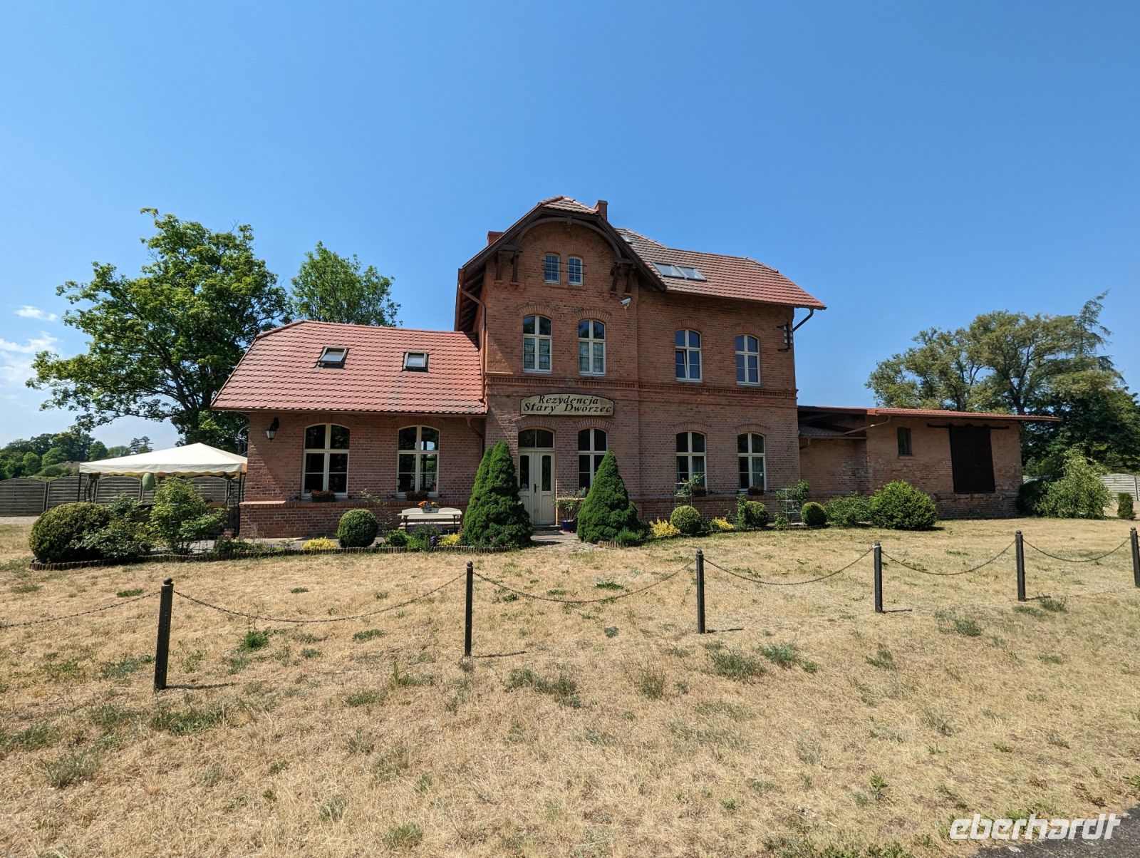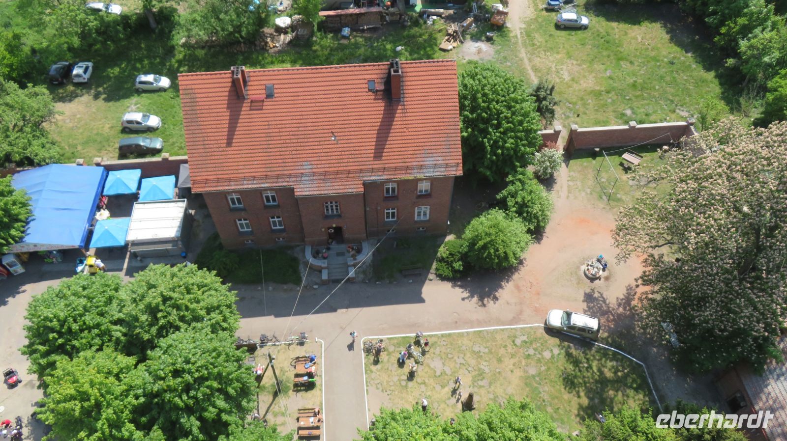Mit den Transferbussen legten wir eine längere Strecke zurück, bevor unsere Radtour in Zlocieniec begann. Da dieser Tag in Polen ein Feiertag war, konnten wir in Zlocieniec einer kirchlichen Prozession beiwohnen. Auf einer ehemaligen Schmalspurbahnstrecke umrundeten wir die Pommersche Seenplatte, vorbei an heute privat genutzten Bahnhofsgebäuden. Am Badesee bei Skape machten wir eine Pause und wer wollte, konnte baden gehen. In der Nähe von Slowianki war unser Transferfahrer Robert schon dabei, ein Grillpicknick für uns vorzubereiten.