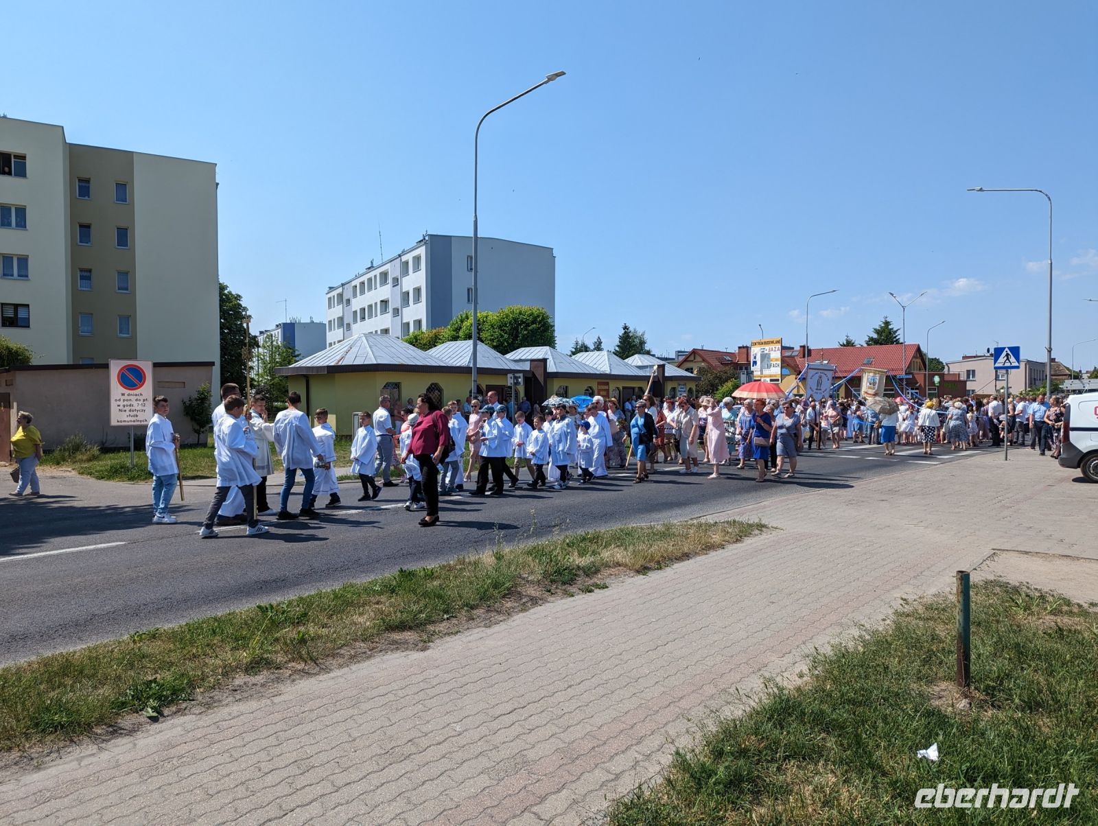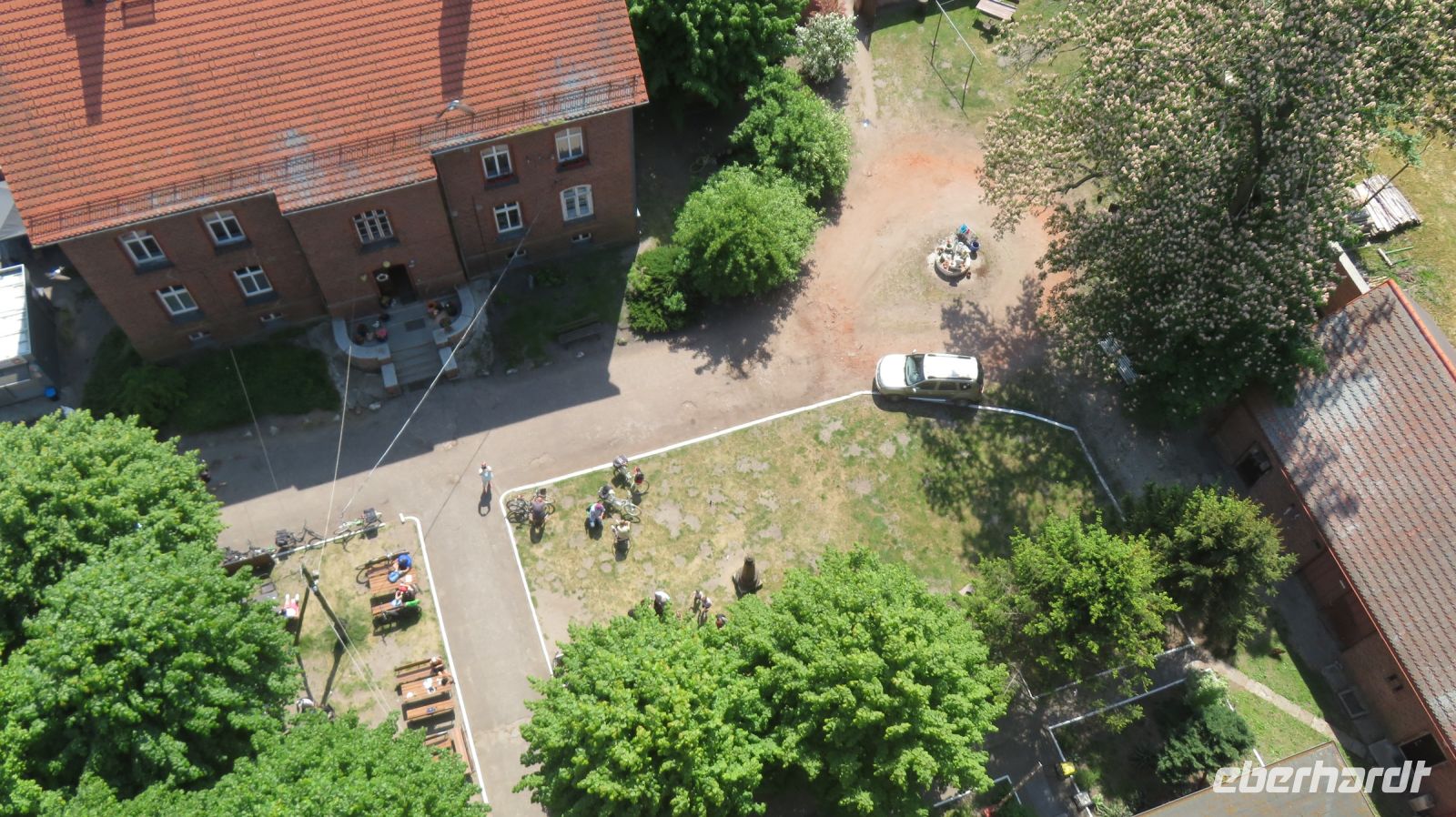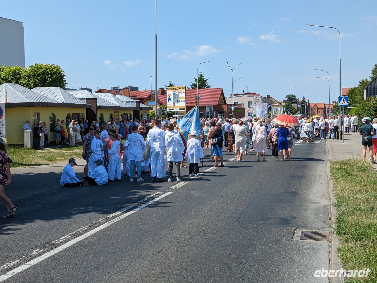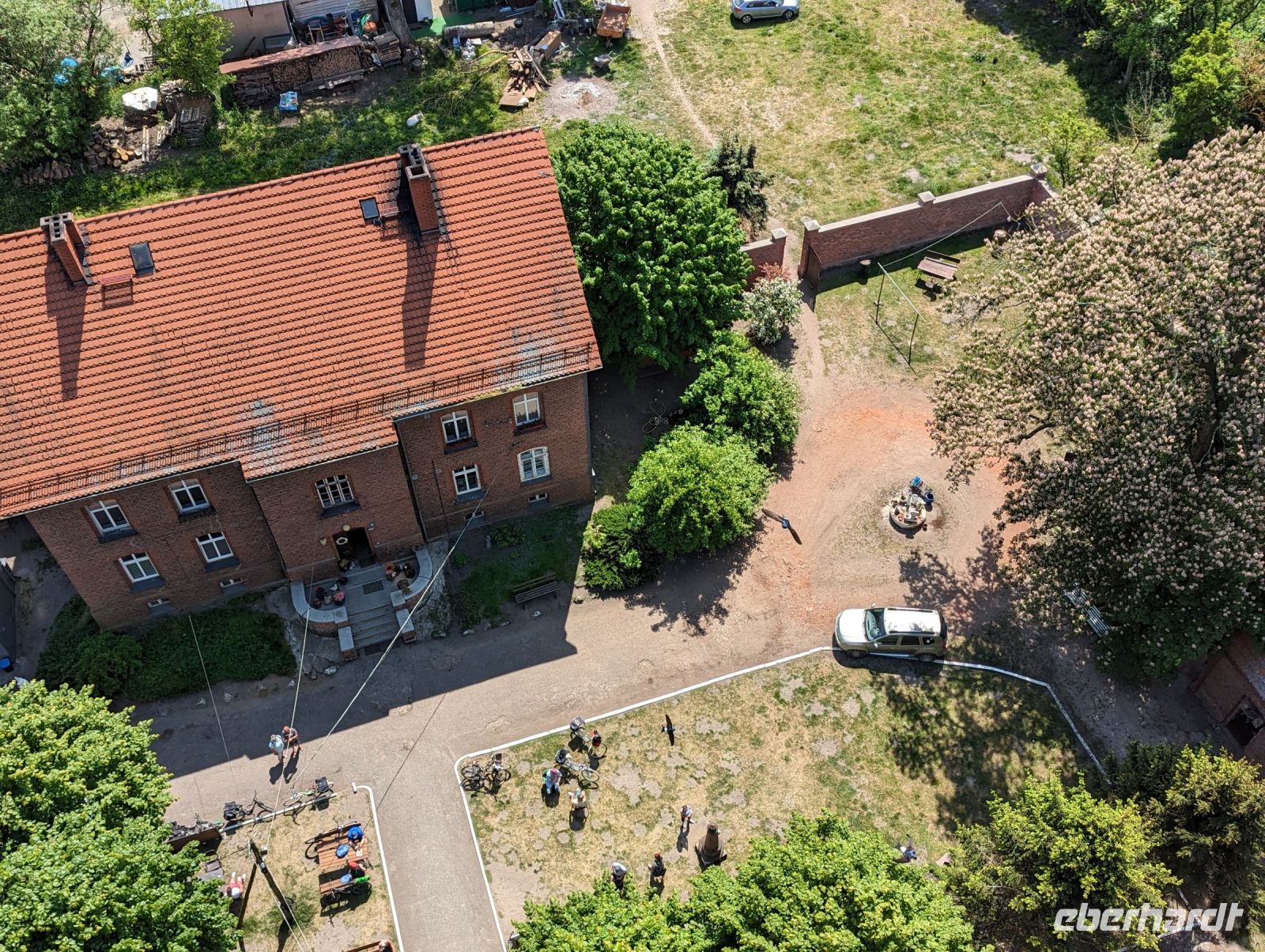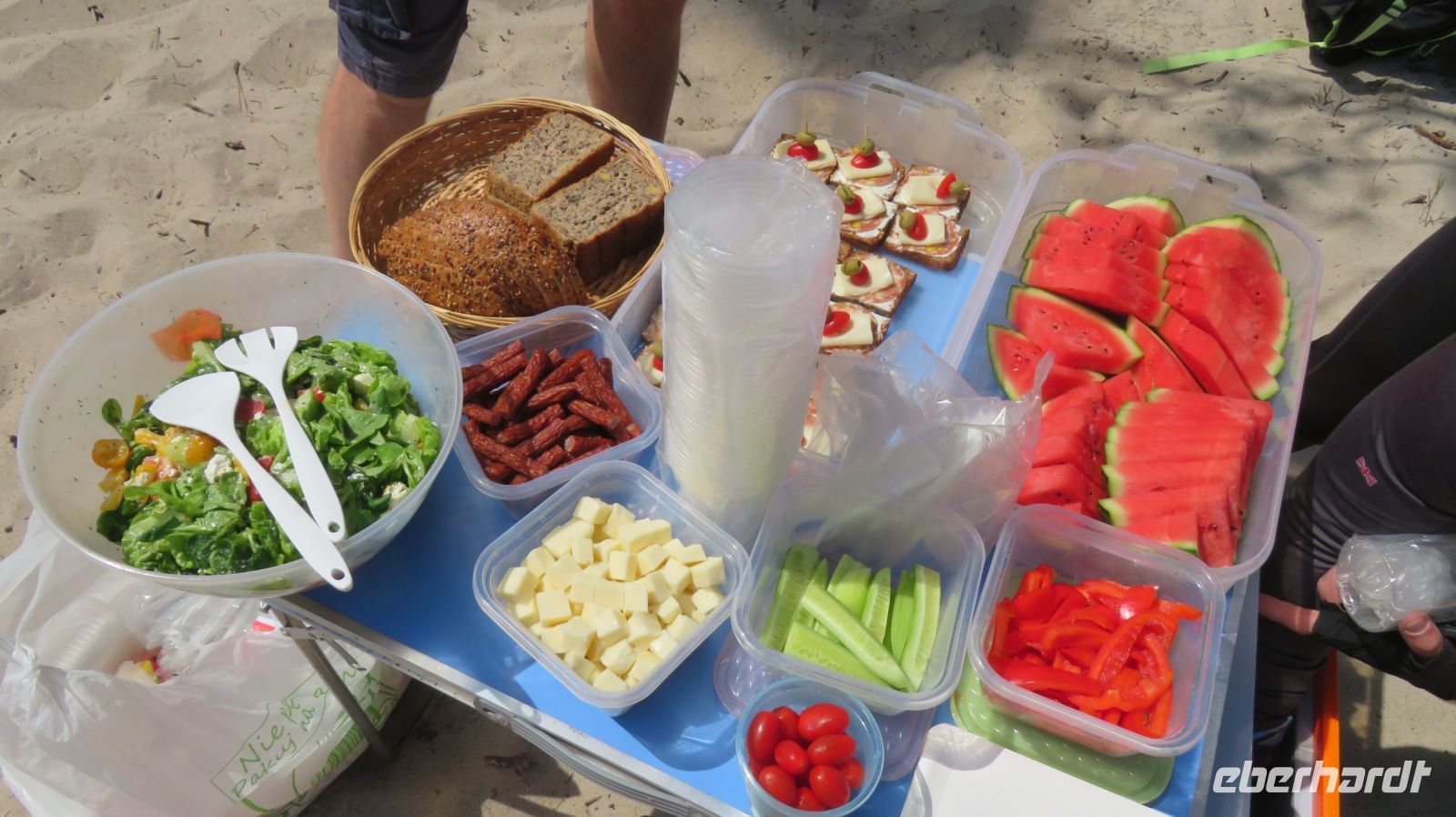 Mit den Transferbussen legten wir eine längere Strecke zurück, bevor unsere Radtour in Zlocieniec begann. Da dieser Tag in Polen ein Feiertag war, konnten wir in Zlocieniec einer kirchlichen Prozession beiwohnen. Auf einer ehemaligen Schmalspurbahnstrecke umrundeten wir die Pommersche Seenplatte, vorbei an heute privat genutzten Bahnhofsgebäuden. Am Badesee bei Skape machten wir eine Pause und wer wollte, konnte baden gehen. In der Nähe von Slowianki war unser Transferfahrer Robert schon dabei, ein Grillpicknick für uns vorzubereiten.