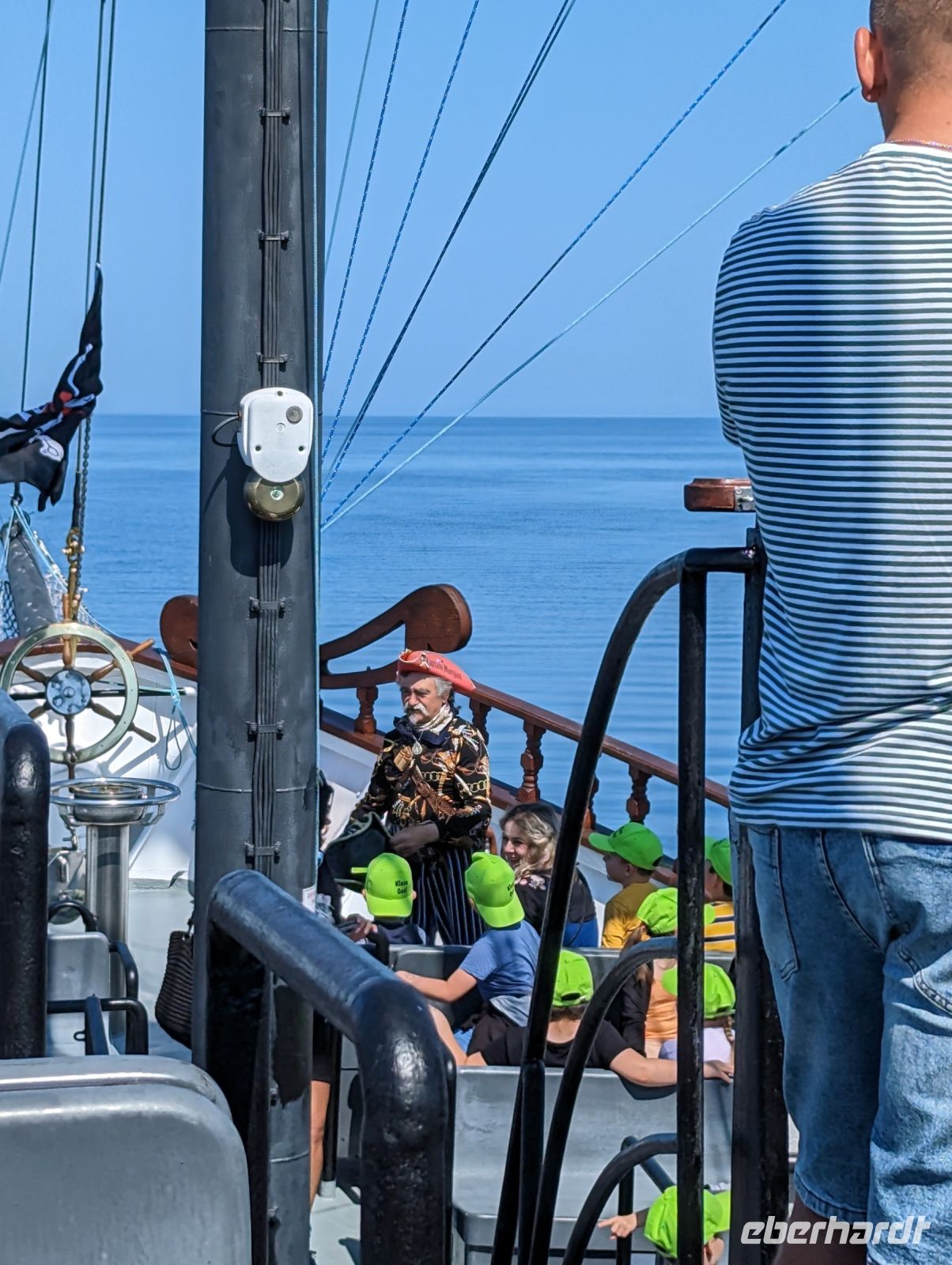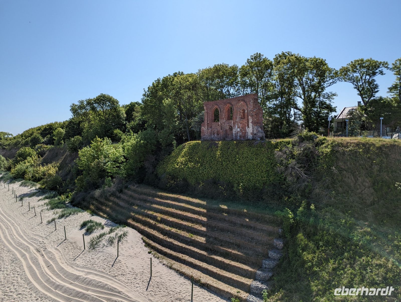 Mit den Transferbussen ging es bei strahlendem Sonnenschein vom Hotel nach Hoff. In Hoff verläuft der 15. Meridian, der die mitteleuropäische Zeit anzeigt. Hier besichtigten wir die letzten Kirchenmauern, die noch nicht vom Wasser der Ostsee weggespült wurden. Nach einer kurzen Freizeit besuchten wir das Museum, in dem uns die Geschichte des kleinen Ortes und der Kirche näher gebracht wurde. Zu Fuß gingen wir zur neuen Kirche, in der der alte Altar aus der zerstörten Kirche steht. Mit der Schmalspurbahn fuhren wir ein Stück, bevor es hieß: "Auf die Sattel". Die Fahrräder waren schon abgeladen, als wir am Bahnhof ankamen. Wir fuhren ein Stück an der Ostseeküste entlang, bis wir zu unserem Picknick kamen. Das Picknick war schon von unserem Busfahrer Robert, der uns begleitete, vorbereitet worden, so dass wir es uns alle schmecken lassen konnten.