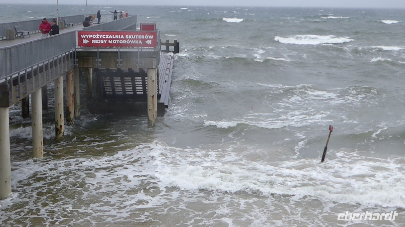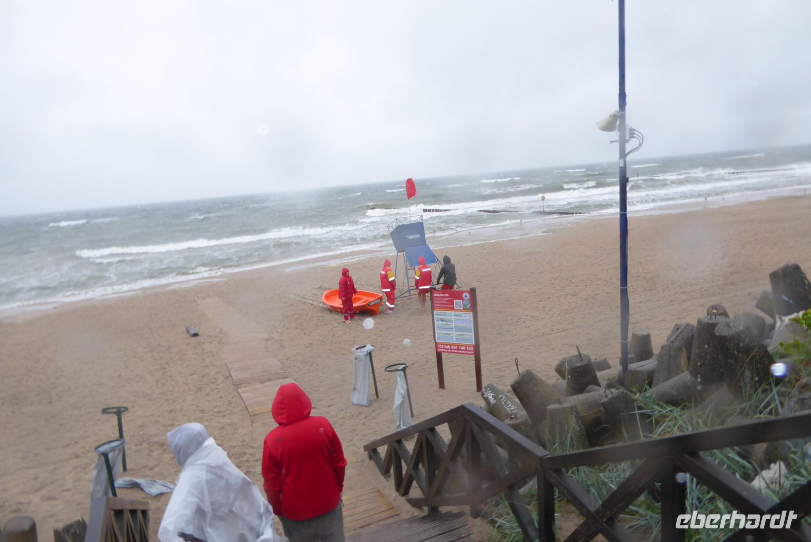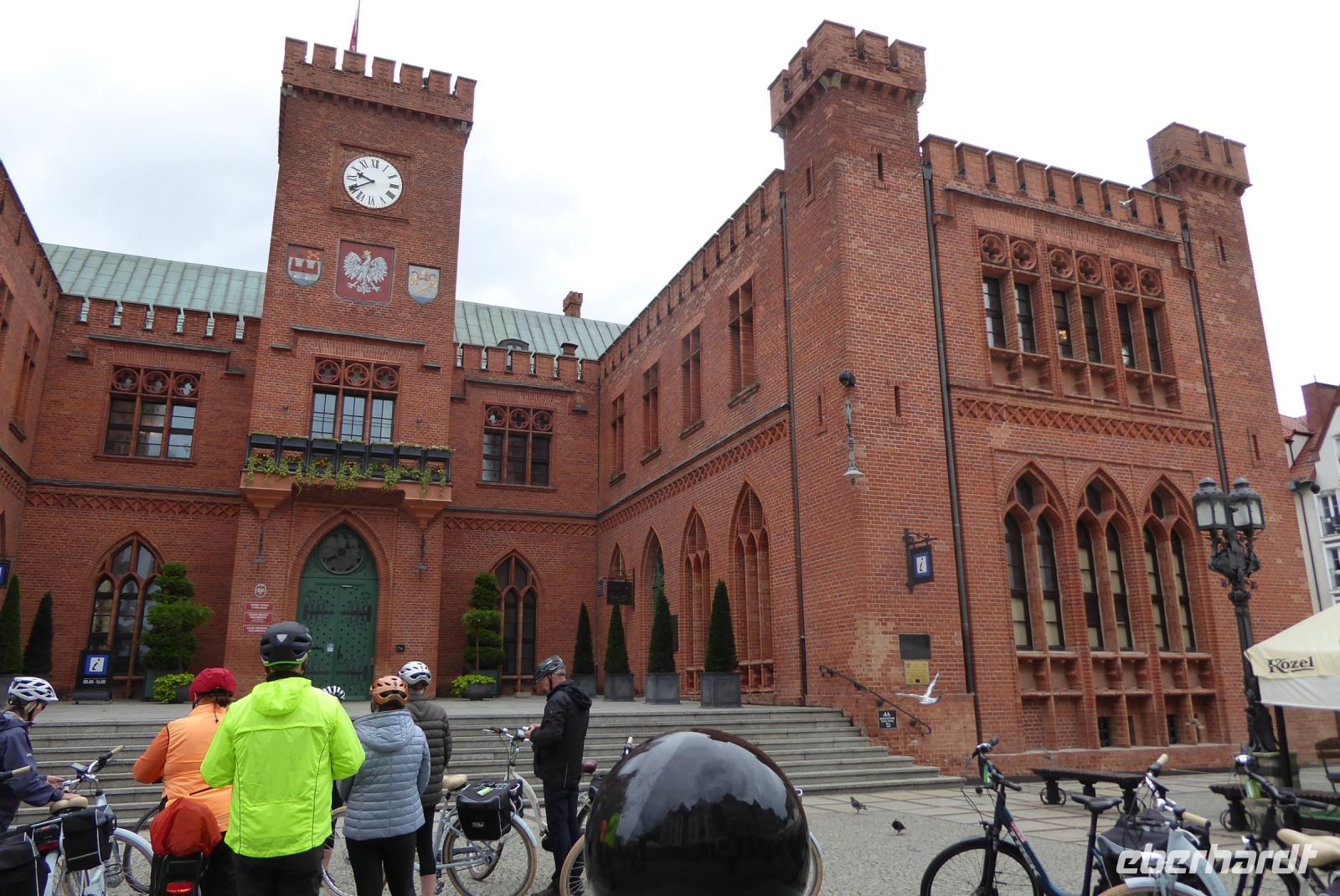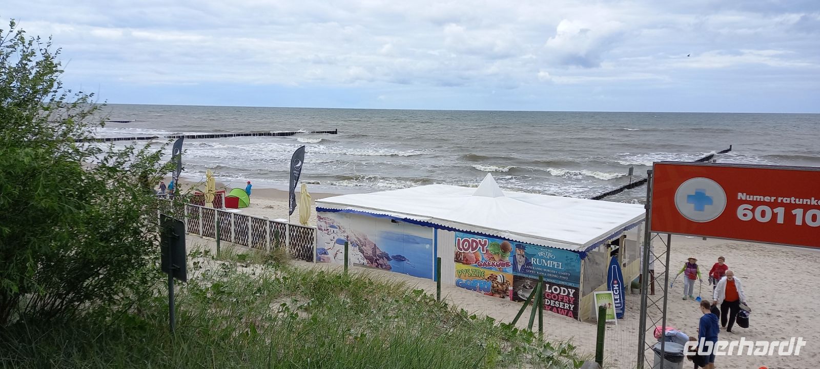 Dann sollten wir wieder einen Tribut an den Sturm "Hans" zahlen: Die geplante Schmalspurbahnfahrt zum Treffpunkt, wo die Räder auf uns warteten, musste ausfallen, da der Sturm am Tag zuvor Bäume über die Gleise "gelegt" hatte. (Wie gut, dass wir gestern nicht gefahren sind, war offensichtlich gefährlich). Wieder sprang Sylvester ein, holte uns mit den Bussen ab, soddass wir dann unsere erste Fahrradstrecke in Angriff nehmen konnten. Trocken radelten wir entlang der Ostseeküste bis Mrzezyno, besichtigten die neue Mole und gingen dann in ein Fischrestaurant, wo Sylvester ein Essen organisiert hatte, weil das Wetter für das geplante Picknick zu unsicher war. Richtige Entscheidung: beim Essen fing es an, heftig zu regnen. Wir konnten den ersten Schauer abwarten, und machten uns dann auf den Weg Richtung Kolberg. Hier wollte uns Klaudia noch einiges zeigen und erklären, aber es regnete so heftig, dass wir es vorzogen, direkt "nach Hause" zu radeln. - Es hat alles gepasst an dem Tag und war Regen genug, um noch gut gelaunt den Abend zu genießen.