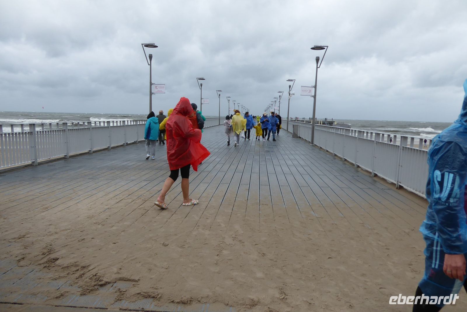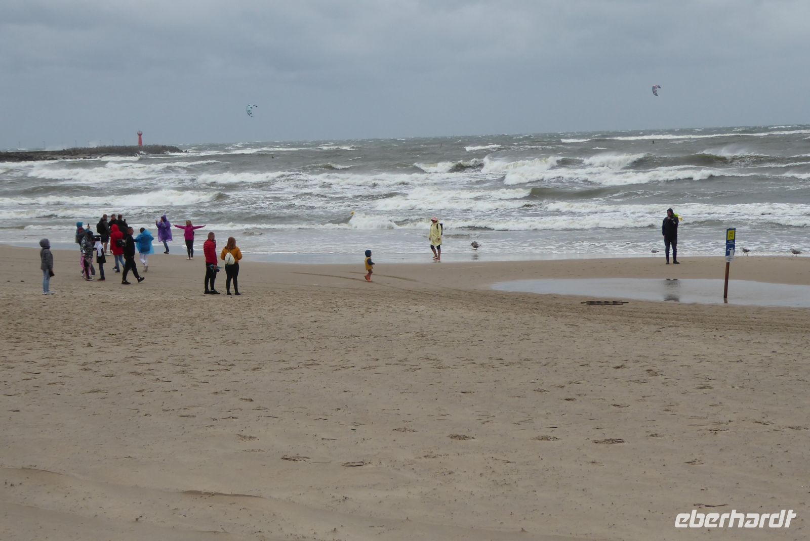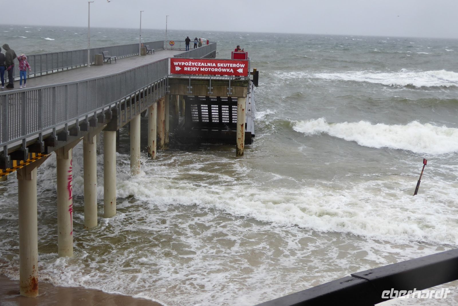 Dann sollten wir wieder einen Tribut an den Sturm "Hans" zahlen: Die geplante Schmalspurbahnfahrt zum Treffpunkt, wo die Räder auf uns warteten, musste ausfallen, da der Sturm am Tag zuvor Bäume über die Gleise "gelegt" hatte. (Wie gut, dass wir gestern nicht gefahren sind, war offensichtlich gefährlich). Wieder sprang Sylvester ein, holte uns mit den Bussen ab, soddass wir dann unsere erste Fahrradstrecke in Angriff nehmen konnten. Trocken radelten wir entlang der Ostseeküste bis Mrzezyno, besichtigten die neue Mole und gingen dann in ein Fischrestaurant, wo Sylvester ein Essen organisiert hatte, weil das Wetter für das geplante Picknick zu unsicher war. Richtige Entscheidung: beim Essen fing es an, heftig zu regnen. Wir konnten den ersten Schauer abwarten, und machten uns dann auf den Weg Richtung Kolberg. Hier wollte uns Klaudia noch einiges zeigen und erklären, aber es regnete so heftig, dass wir es vorzogen, direkt "nach Hause" zu radeln. - Es hat alles gepasst an dem Tag und war Regen genug, um noch gut gelaunt den Abend zu genießen.