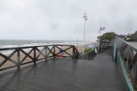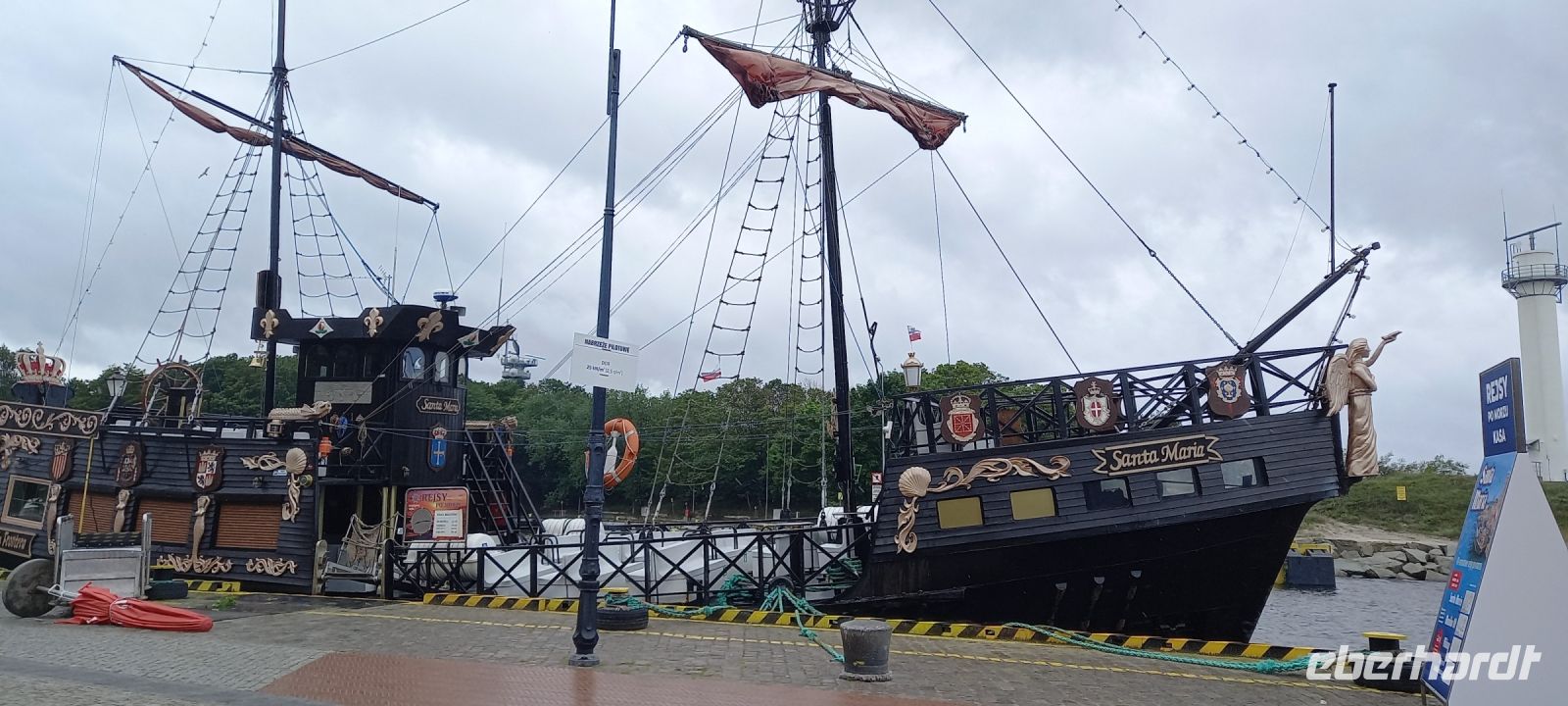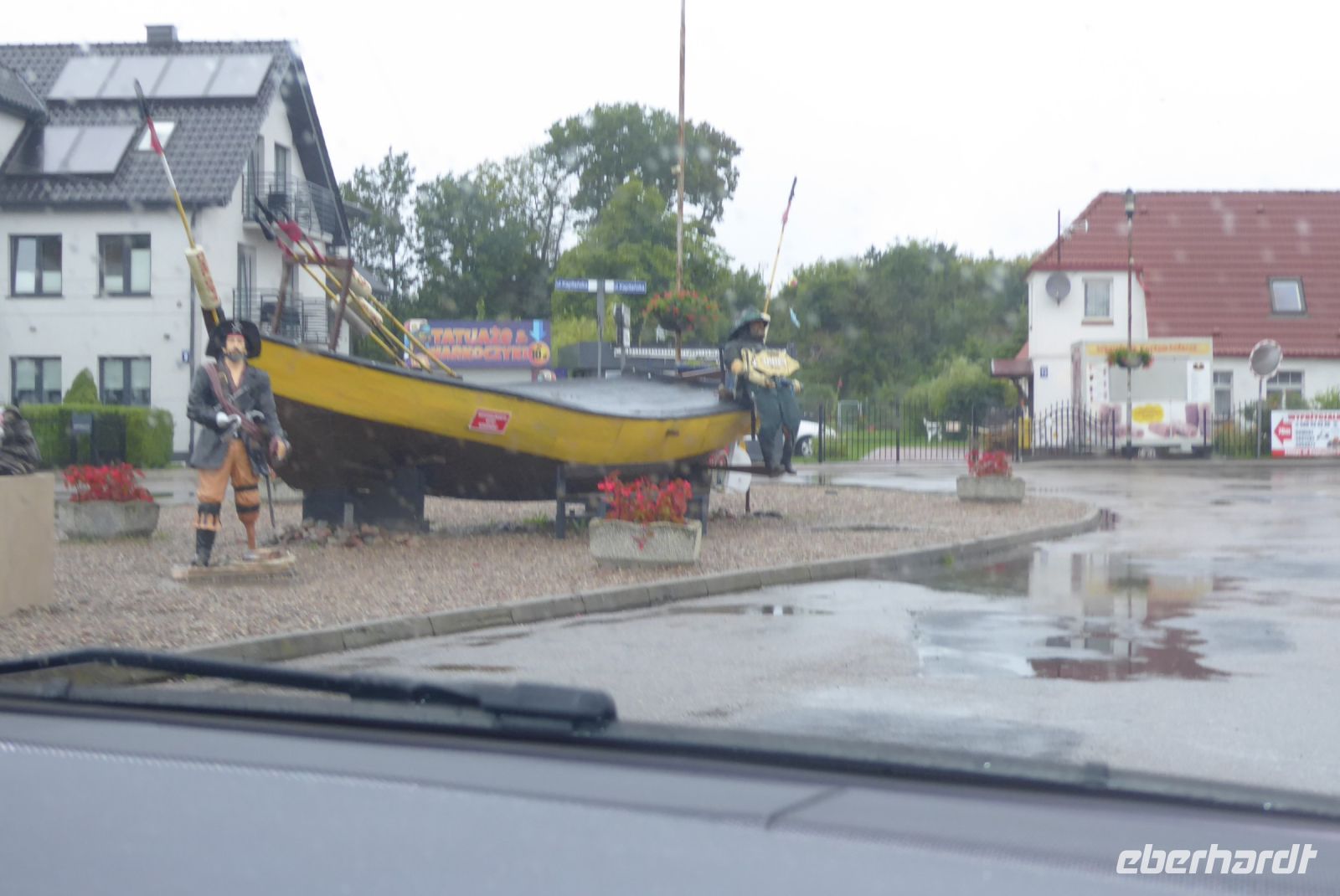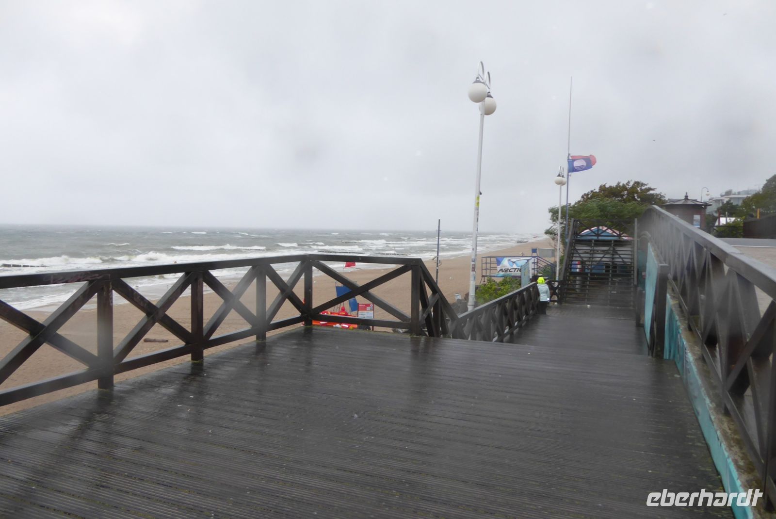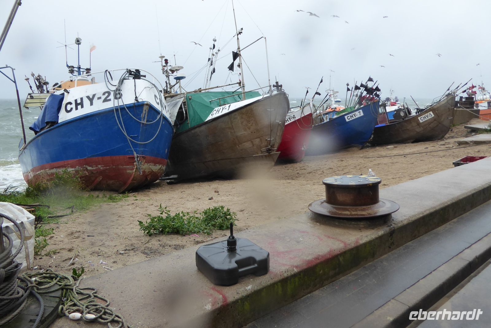 Dann sollten wir wieder einen Tribut an den Sturm "Hans" zahlen: Die geplante Schmalspurbahnfahrt zum Treffpunkt, wo die Räder auf uns warteten, musste ausfallen, da der Sturm am Tag zuvor Bäume über die Gleise "gelegt" hatte. (Wie gut, dass wir gestern nicht gefahren sind, war offensichtlich gefährlich). Wieder sprang Sylvester ein, holte uns mit den Bussen ab, soddass wir dann unsere erste Fahrradstrecke in Angriff nehmen konnten. Trocken radelten wir entlang der Ostseeküste bis Mrzezyno, besichtigten die neue Mole und gingen dann in ein Fischrestaurant, wo Sylvester ein Essen organisiert hatte, weil das Wetter für das geplante Picknick zu unsicher war. Richtige Entscheidung: beim Essen fing es an, heftig zu regnen. Wir konnten den ersten Schauer abwarten, und machten uns dann auf den Weg Richtung Kolberg. Hier wollte uns Klaudia noch einiges zeigen und erklären, aber es regnete so heftig, dass wir es vorzogen, direkt "nach Hause" zu radeln. - Es hat alles gepasst an dem Tag und war Regen genug, um noch gut gelaunt den Abend zu genießen.
