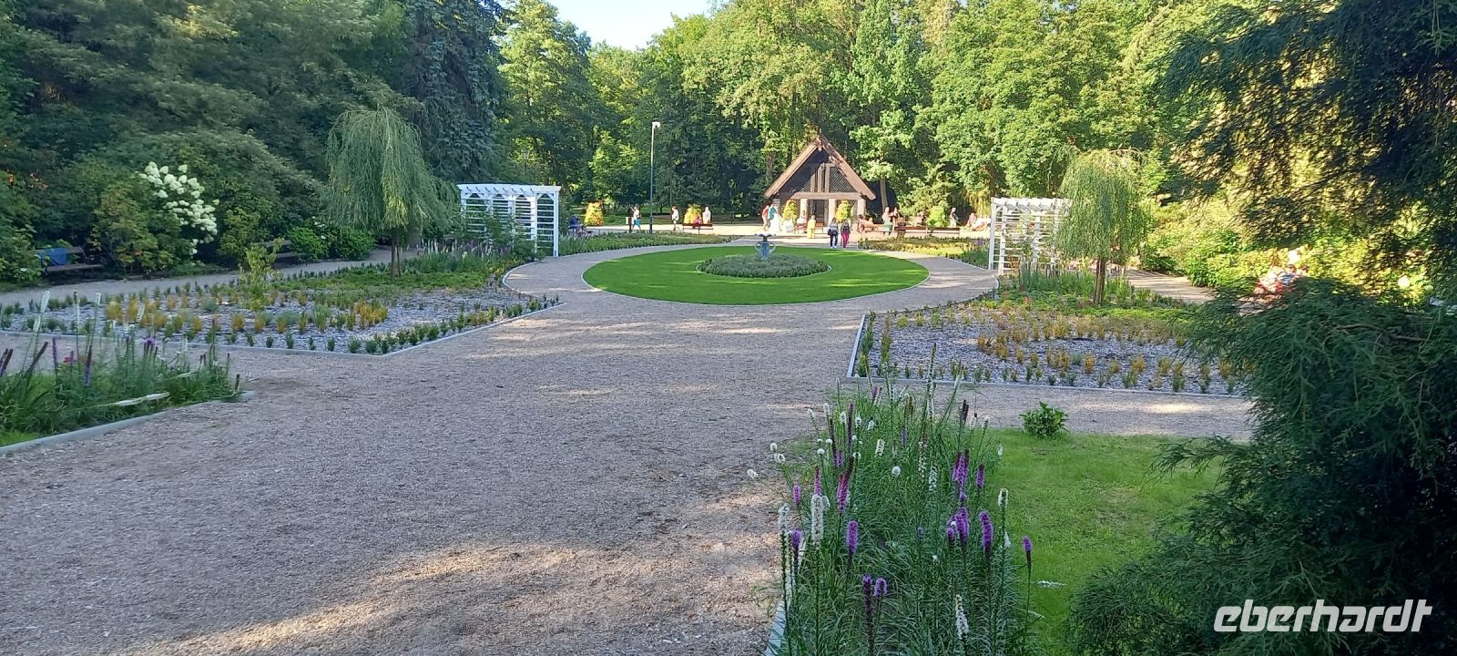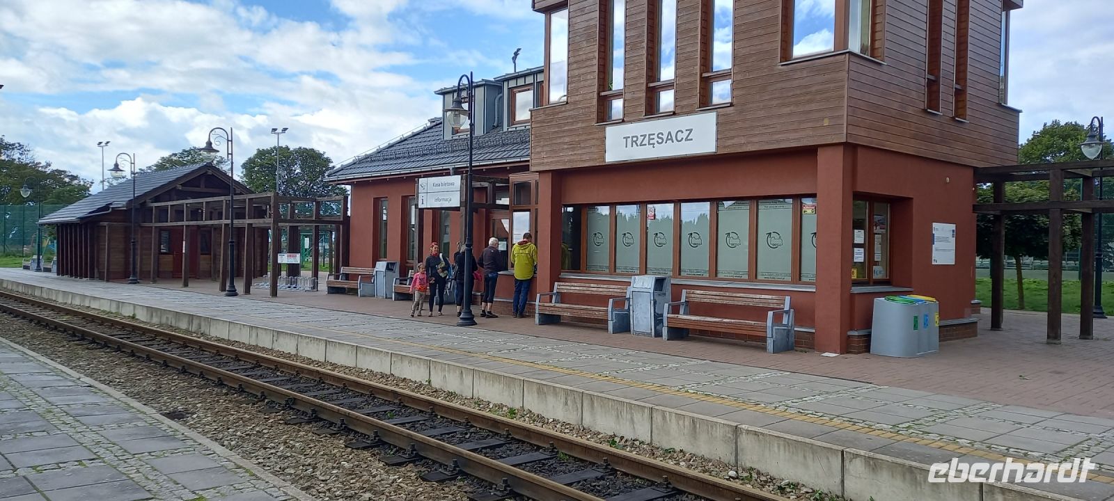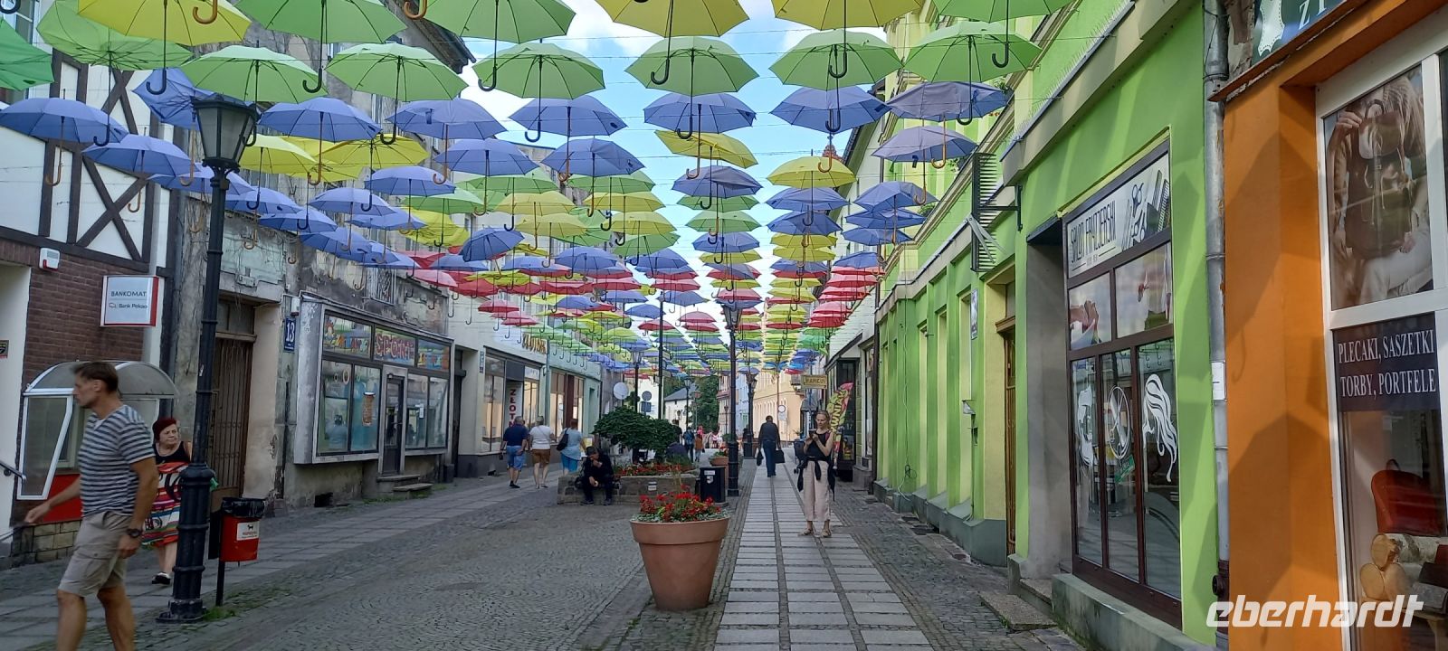 Wieder auf einer ehemaligen Schmalspurbahnstrecke querten wir die Pommersche Seenplatte, vorbei an ehemaligen Bahnhofsgebäuden, Äckern (u.a.Buchweizen) und Wiesen. Am Badesee bei Skape machten wir eine Pause und wer wollte, konnte baden gehen. In der Nähe von Slowianki wartete Sylverster und Assistent schon auf uns mit einem grandiosen Grillpicknick. Fleisch, Wurst, Käse vom Grill, Salat von Sylvesters Frau, Gurken, Brot, Bier, Wein, Wasser, Softdrinks - alles da! Da wollten die meisten Gäste gar nicht mehr weiterfahren. Aber die letzte Streck konnten wir bei Sonnenschein zurücklegen, da machte Radfahren noch mal richtig Spaß. So war es auch das richtige Wetter wür ein Eis in der bunt mit umgedrehten Regenschirmen geschmückten Fußgängerzone. Klaudia führte uns zum Abschluß noch durch den Kurpark mit den bunten Beeten und der Trinkhalle mit Heilwasser, ebenfalls gegen alles... Zwischenzeitlich waren die Räder auf den Hänger geladen und es ging zurück nach Kolberg. Am Fahrradverleih war es dann Zeit für den Abschied von Sylvester, Klaudia und dem ganzen Team - sie waren superb.