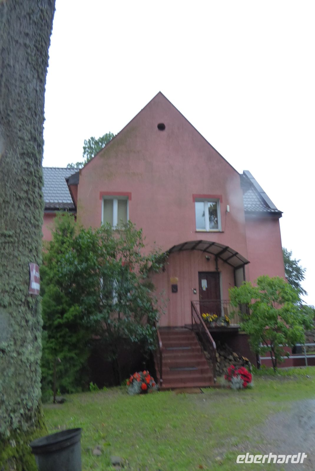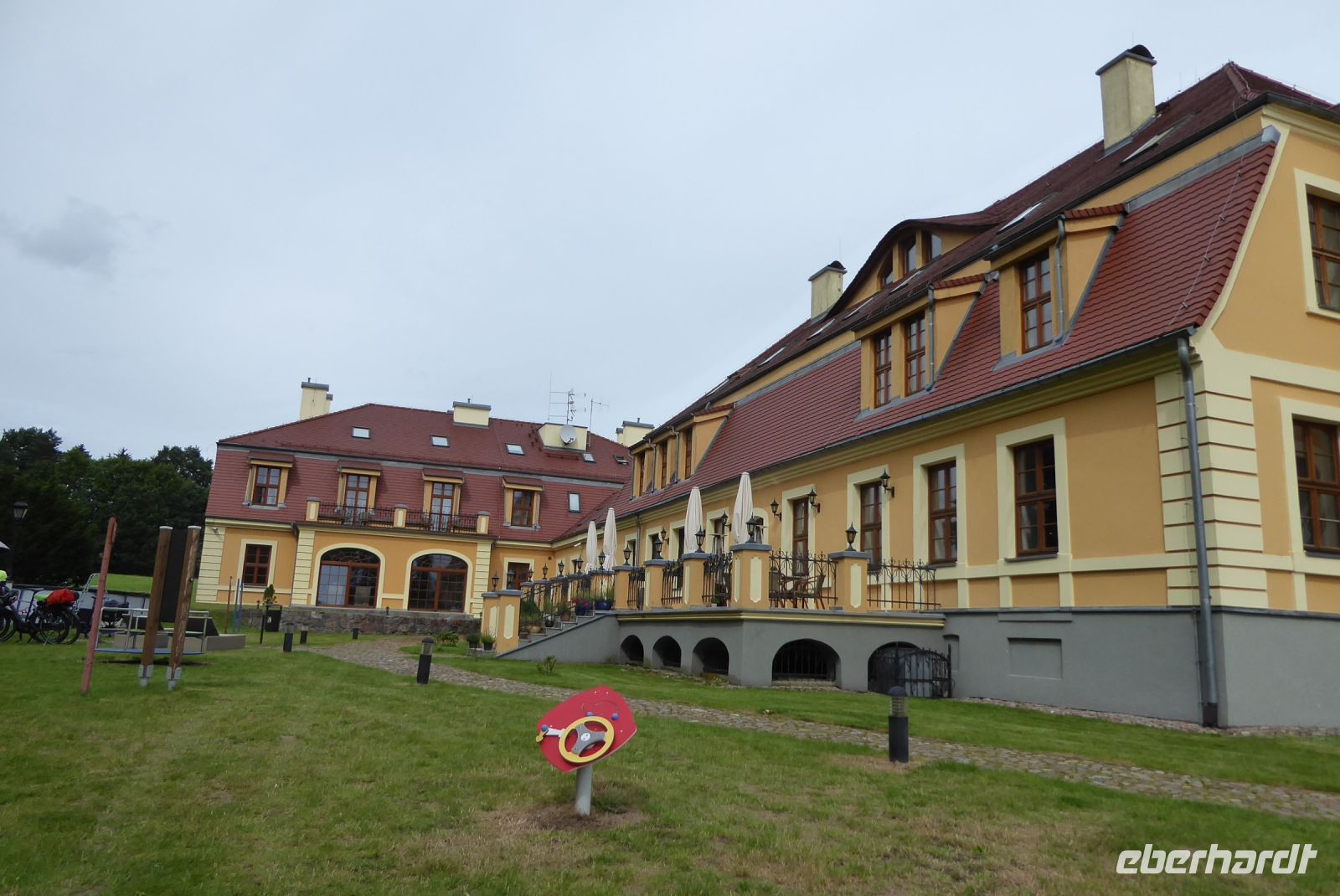 Wie bereits bei der Fahrrad-Übernahme befürchtet, so sah der erste 2. Reisetag auch aus: Strömender Regen, dazu helftiger Wind, zu stark, um sicher an der Küste entlang Fahrrad zu fahren. - Also stiegen wir alle in zwei Minibusse (Vitos) und fuhren die orte an, die eigentlich auf unserer heutigen Radtour vorgesehen waren. Statt Picknick gab es Kaffee und Kuchen in einem alten Gutshof (Dworek Osieki), der alleine schon begeisterte...