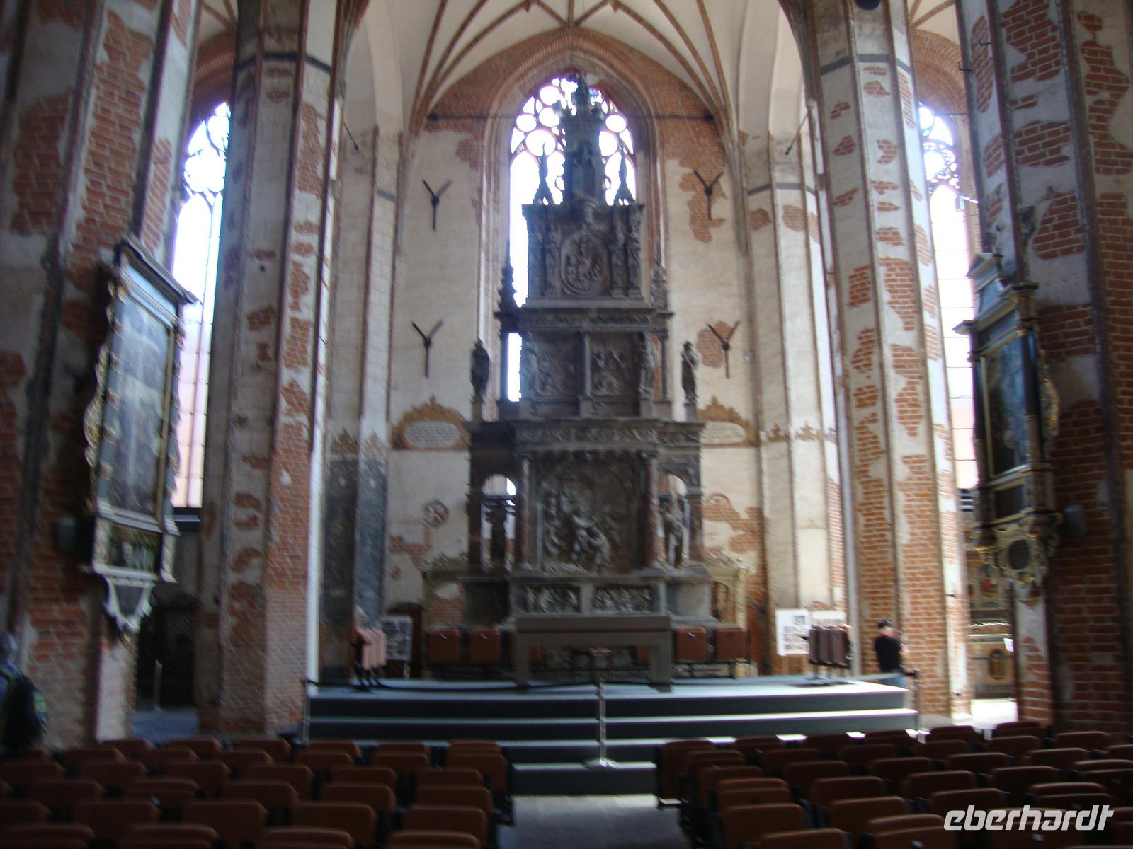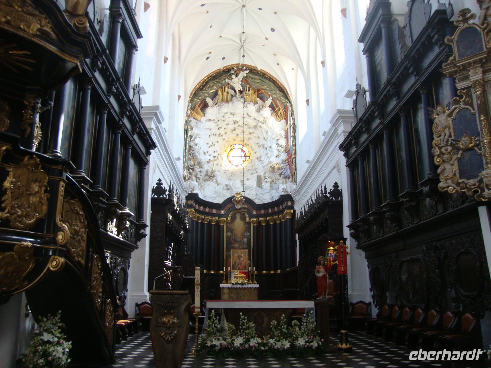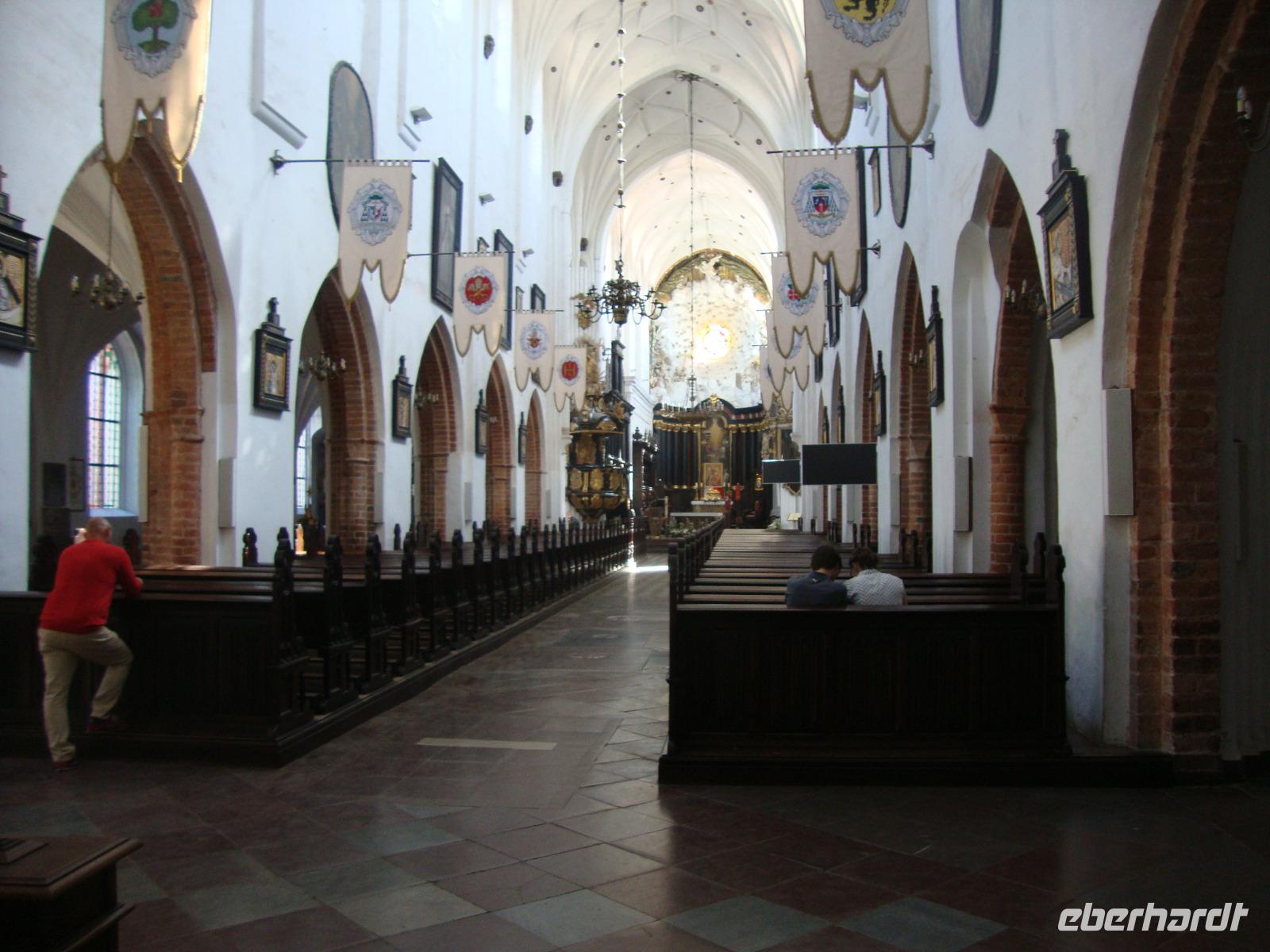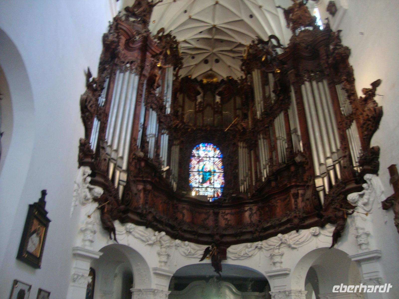 Nach dem ersten, abwechslungsreichen Frühstück, begann unser Tagesprogramm mit Piotr. Die Kathedrale im Stadtteil Oliwa (Oliva) war unser erstes Ziel. Sie entstand im 13 Jh. als Teil einer Zisterzienserabtei, zu der auch Kreuzgang und Klausurgebäude gehörten. zwei schlanke Backsteintürme mit spitzen barocken Dachhelmen überragen die Kirche. Die prächtige Orgel mit dem geschnitzten Rokokoprospekt wurde 1788 eingebaut. Bei dem wundervollen Orgelspiel erlebten wir, wie sich die Engelfiguren mit ihren Trompeten und Glocken bewegten. Während unserer Rückfahrt nach Danzig hielten wir gegenüber der Westerplatte. Eine hohe Stele mit Soldatenköpfen und Waffen erinnert daran ,das hier der Zweite Weltkrieg begann, mit heftiger gegenwehr der polnischen Soldaten. In der Altstadt von danzig waren wir dann zu Fuß unterwegs. Die Marienkirche gilt als die größte mittelalterliche Backsteinkirche Europas.Die Frauengasse wirkt wegen der Beschläge mit verzierten Geländern und Treppen sehr malerisch. Diese Terassenplätze vor den Häusern waren Privileg der Patrizier. Läden bieten Bernsteinschmuck mit Qualitätssiegel an. Das berühmteste Wahrzeichen Danzigs ist das an der Mottlau in der Mitte des 15.Jh. errichtete Krantor. Bei unserem Rundgang mit Piotr erlebten wir die pulsierende Altstadt hautnah. Am Nachmittag konnte jeder Reisegast Danzig auf eigene faust entdecken, denn bis zu unserem Hotel waren es nur wenige Gehminuten, bevor wir uns am Abend zum 3-Gang-Menü einfanden.