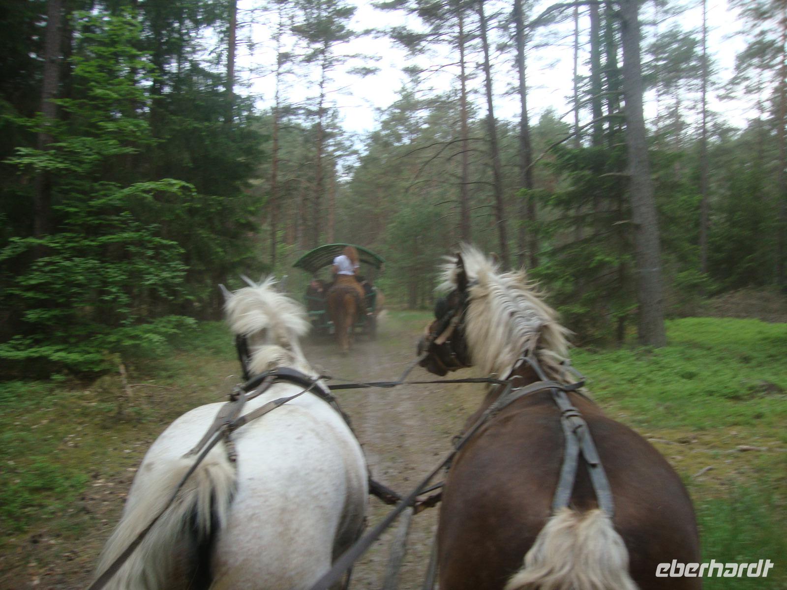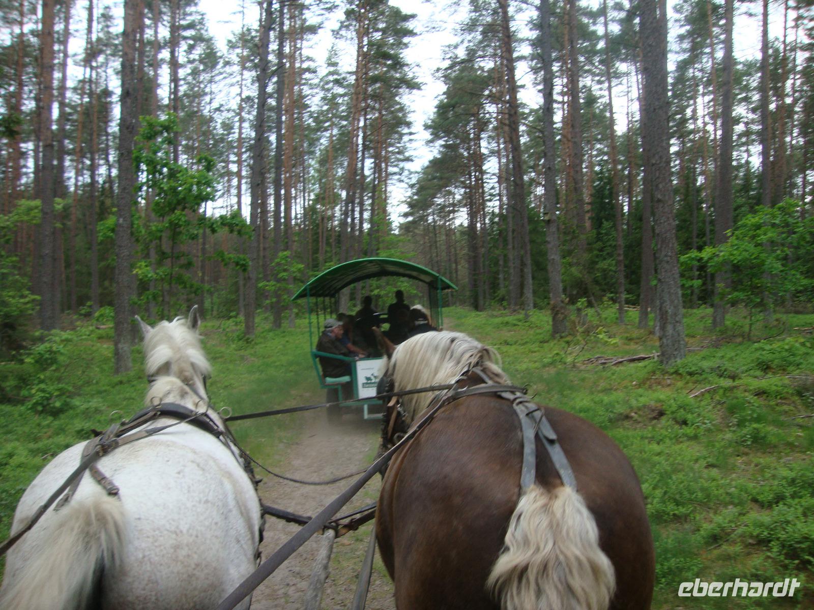 Nach einem guten und kräftigen Frühstück begaben wir uns zum ersten Ziel für den heutigen Tag, die Wolfsschanze. Ein Komplex aus 200 Gebäuden und Bunkern für 2000 Personen wurde im Zusammenhang mit dem Angriff der Nazis auf die Sowjetunion 1940 - 1944 errichtet. Die Überbleibsel dieser gewaltigen Anlage lösen doch ein beklemmendes Gefühl aus. Der Legende nach entstand die erste Wallfahrtskirche um eine Linde, an der eine wundertätige Marienfigur hing. Die heutige Basilika ist von 1730 und einer der prunkvollsten spätbarocken Bauten in Polen. Ein wahrer Kontrast zu dem vorher besichtigten. Die hohe Doppelturmfassade schmückt eine Darstellung der Muttergottes an der Linde. Ein wirklich beeindruckendes sakrales Bauwerk, indem wir auch ein Orgelspiel erlebten. Am Nachmittag waren wir bei "Christel", zu Kaffee und ostpreußischem Kuchen eingeladen. Sie beherbergt auch Feriengäste und hat eine sehr schöne Freizeitanlage mit viel Initiative und Mitwirken der gesamten Familie geschaffen. Bei ihr kann man auch das Ostpreußenmuseum besuchen. Einige Anekdoten und lustige Geschichten erzählte Sie uns. Am Abend waren wir zu Gast bei "Eulalia", in der Nähe von Peitschendorf (Piecki). Sie empfing uns hoch zu Pferde und zwei Kutschen standen zur Fahrt durch die Wälder Masurens mit unseren Gästen bereit. Auf ihrem Hof erlebten wir eine masurische Bauernhochzeit, gespielt von unseren Gästen, Familie Bader. Bei Musik und Tanz und gutem Essen und Trinken klang dieser schöne Abend aus.