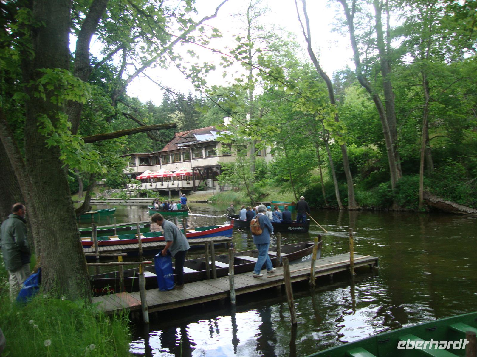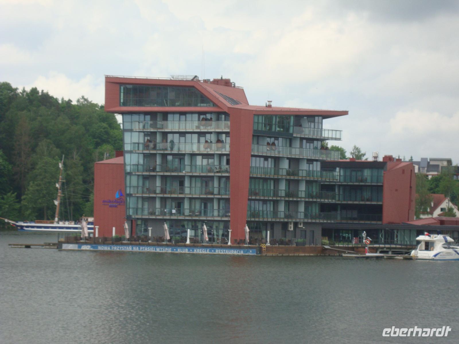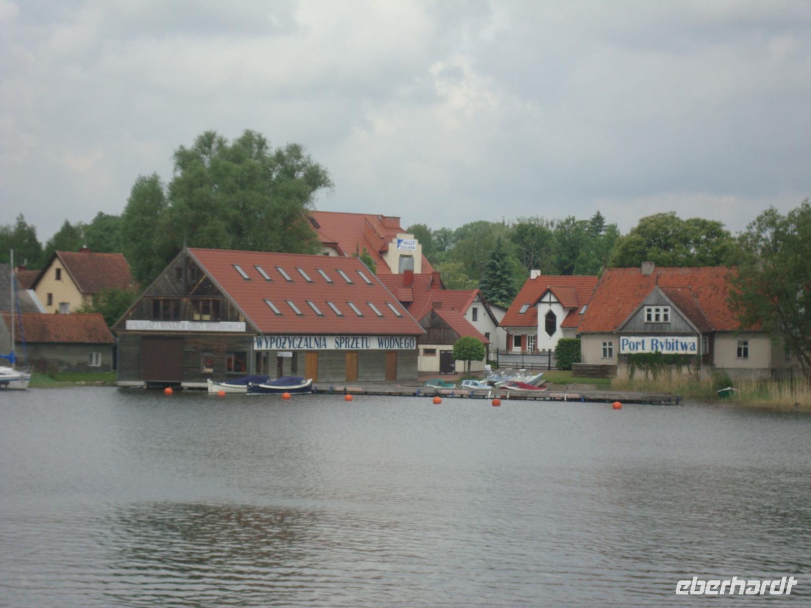 Das Fischerdorf Nikolaikaiken (Mikolajki) ist heute ein beliebter Ferienort am Spirdingsee. Er ist der größte See Polens und wird auch Masurisches Meer genannt. Im Biosphärenreservat Luknainer See leben 175 Vogelarten, darunter 1300 Höckerschwäne und damit wohl die größte Schwanenkolonie Europas. Bei einer Schifffahrt auf dem See lernten wir die stille, masurische Landschaft vom Wasser aus kennen. Zum Mittag waren wir in Krutinnen (Krutyn) und kehrten dort in dem schönen Restaurant "Mazurska" ein. Es gab eine große Auswahl verschiedenster Gerichte und auch Fisch. In dem Ort lassen sich Urlauber in flachen Booten den schönsten Abschnitten der Krutinna (Krutyna) hinaufstaken, das durften wir uns auch nicht entgehen lassen. Leider fing es an zu regnen, aber das tat unserer guten Stimmung keinen Abbruch. Leider waren in der Storchenfarm alle Störche ausgeflogen. Zur Rückfahrt in unser Hotel "ToTu" stiegen viele Gäste im Zentrum von Sensburg aus, um den Fußweg am See zu gehen.