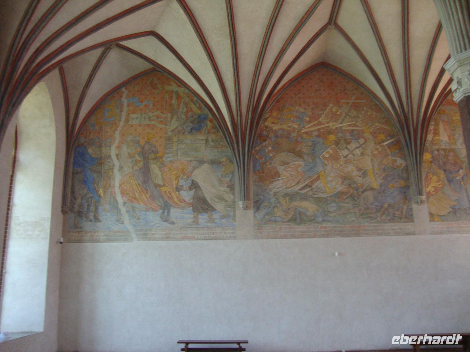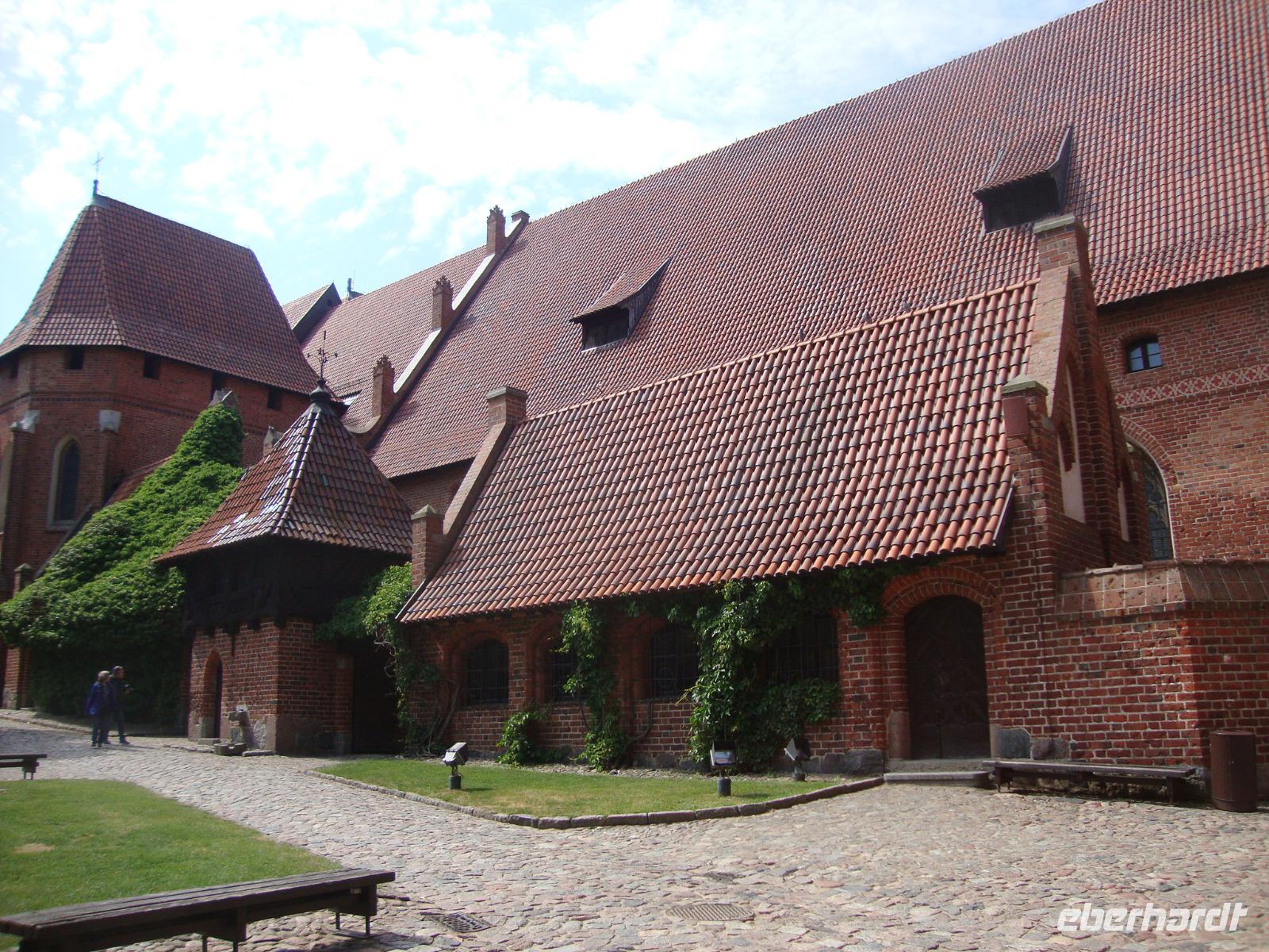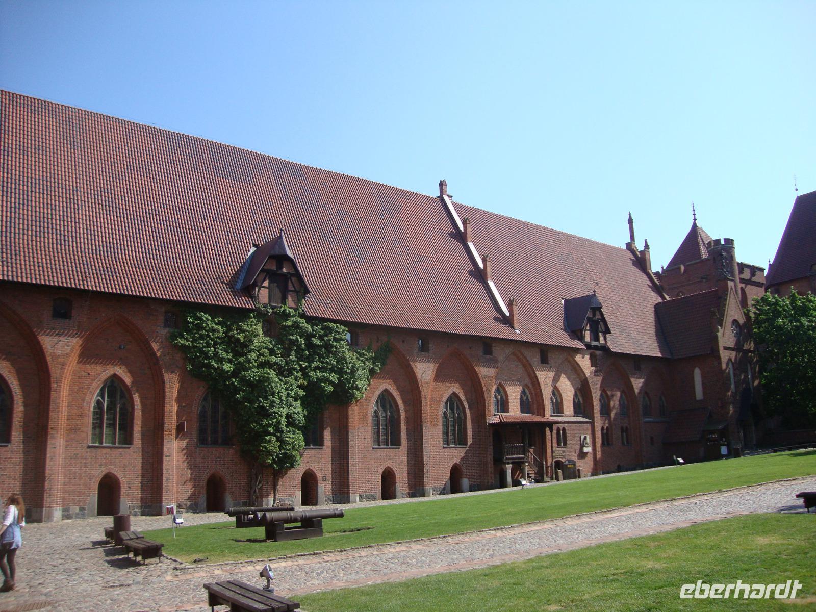 Heute fuhren wir zurück nach Danzig, in unser Hotel "Number one" welches wir schon kennen gelernt hatten. Auf dem Weg dorthin besuchten wir die Marienburg. Die Marienburg, das größte Backsteinbauwerk Europas, wurde 1270 - 1300 vom deutschen Orden am Nogatufer errichtet. 10 Jahre später verlegte der Hochmeister den Sitz seines Ordens von Venedig in die Marienburg und lies sie zum Schloß ausbauen. Mitte des 15 Jh. fiel sie an den polnischen König. Bedeutenster Bau des Mittelschlosse ist der als Wohnturm gestaltete Hochmeisterpalast. insgesamt eine gewaltige Anlage, die niemals erobert wurde. Bei einer fach-und sachkundigen Führung, durch unsere nette Gästebtreuerin, sahen wir uns die gesamte Burg an. Rund drei Stunden waren wir in Marienburg unterwegs am Ufer der Notag hielten wir zu einem kurzen Fotostop. Als wir an unserem Hotel in Danzig ankamen, war es wieder ein Problem den Bus abzustellen. Aber mit viel Geduld und Mühe schaffte es unser Chauffeur, Bernd Ihle. Zum gemeinsamen Abendessen hatten ich zwei lange Tafeln aufstellen lassen, damit wir uns ganz zwanglos über die schönen Tage in Danzig und den Masuren unterhalten konnten. So fand eine erlebnisreiche Woche ihren schönen Abschluss.