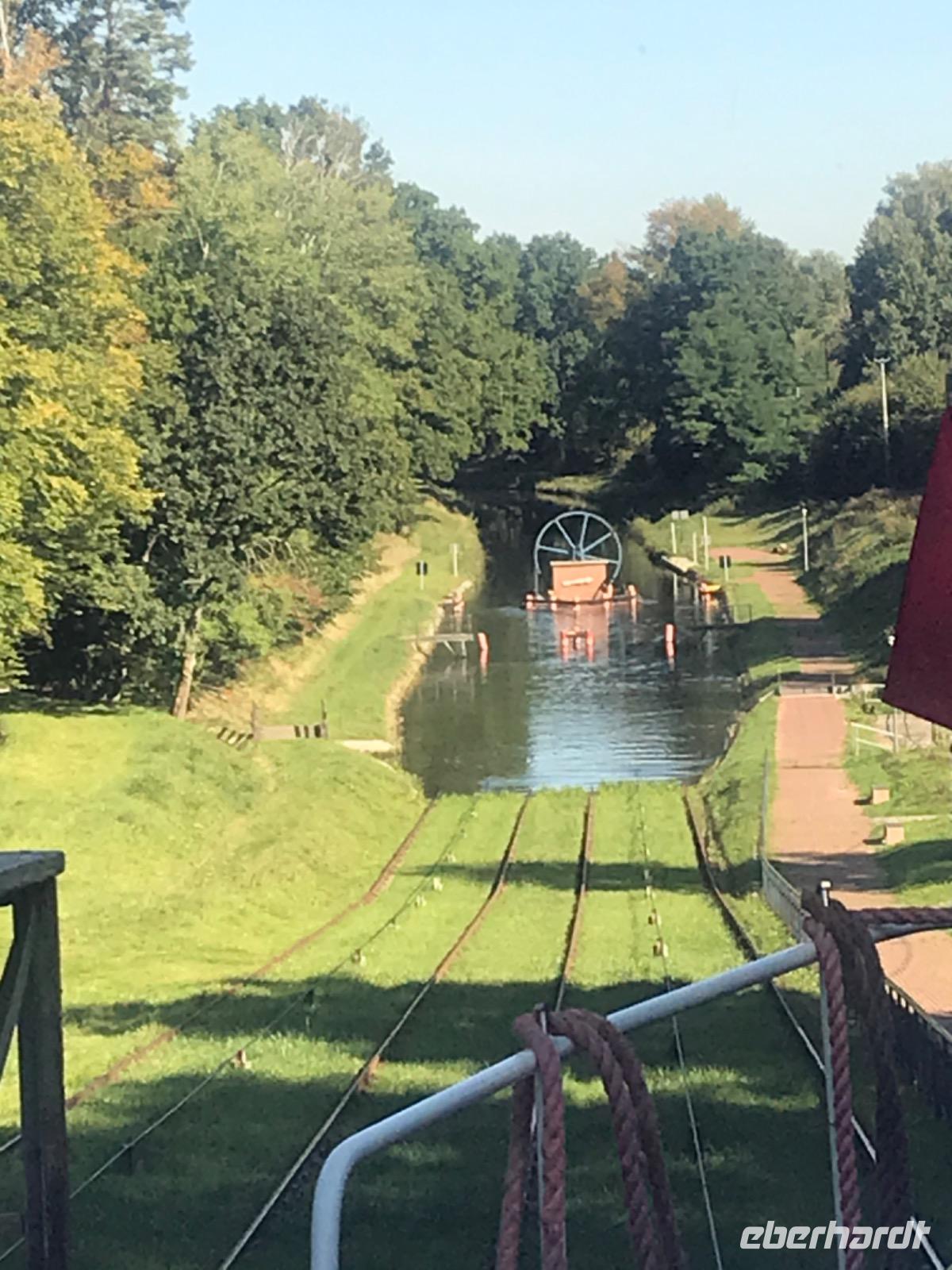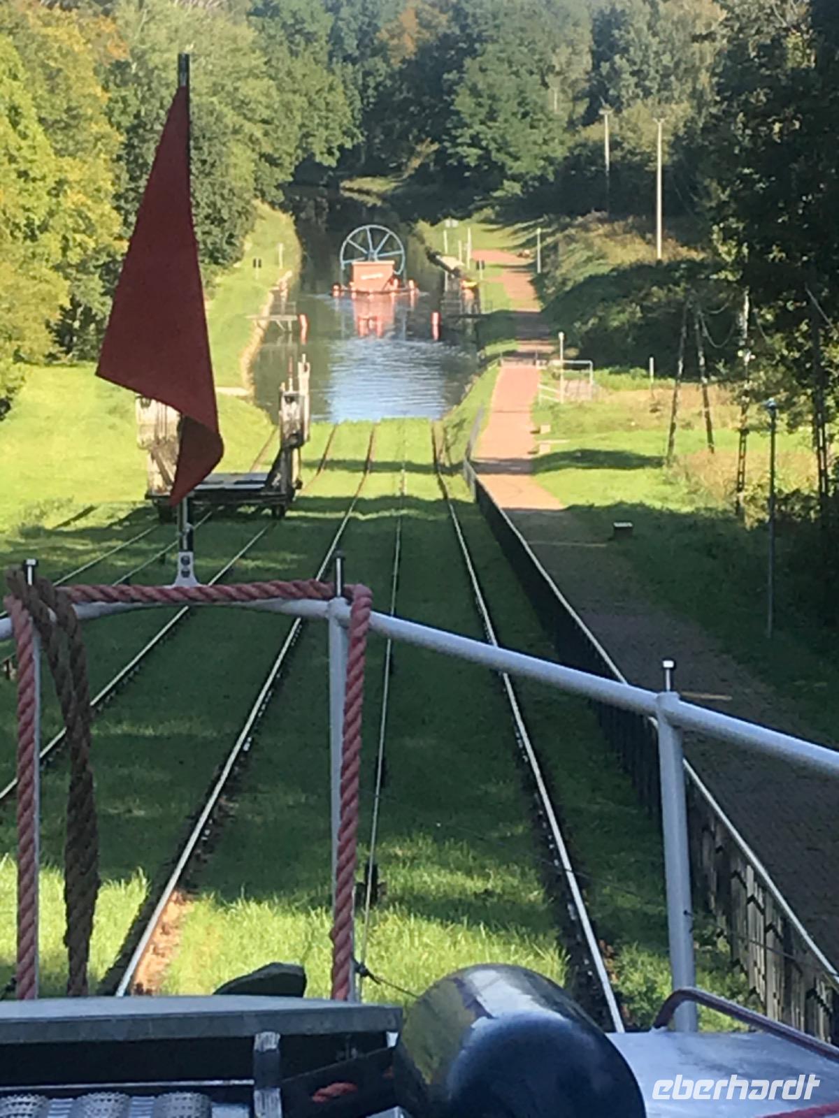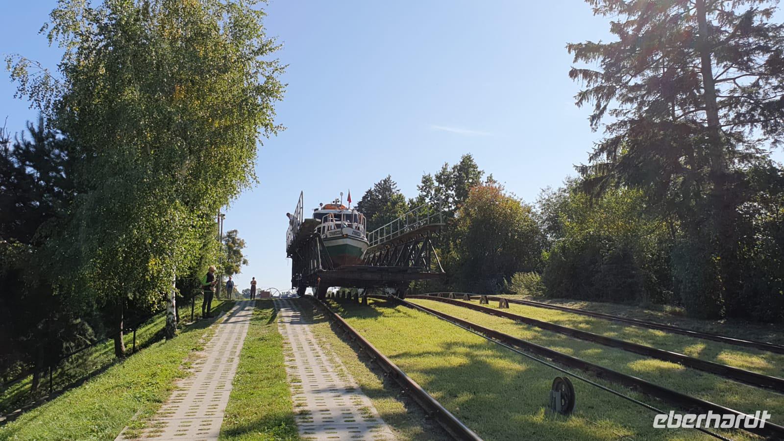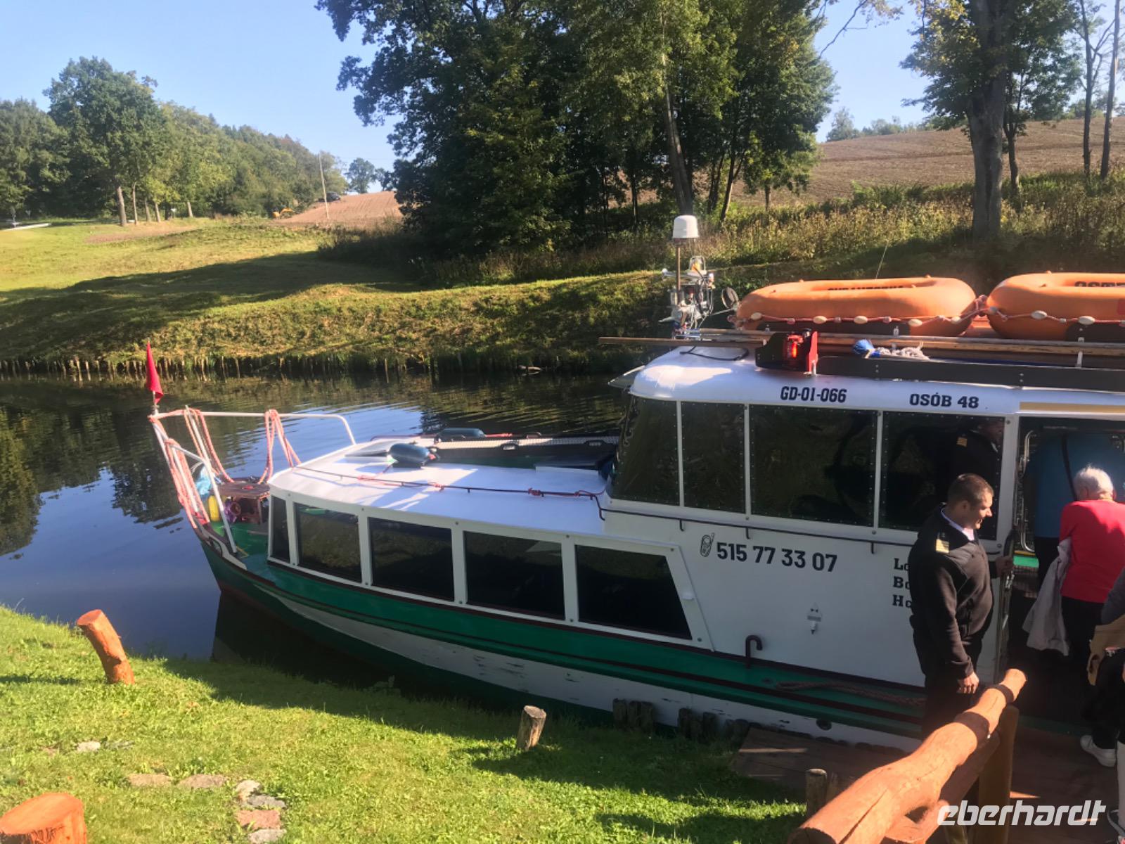 Wir freuten uns alle auf die Weiterfahrt. Die Masuren rufen und es werden heute für uns 250 km. Über Elbing, dem Wohnort von Jazek, der uns die ganze Reise begleitete und uns mit ganz viel Informationen versorgte, geht es nach Osterode(Ostroda) zum Oberlandkanal. Dies ist eine 130 km lange Schiffsverbindung, die Mitte des vorvorigen Jahrhunderts erbaut wurde um u.a. Osterode mit Elbing zu verbinden. Er diente überwiegend dem Transport von Holz und Getreide. Man verzichtete auf die vielen notwendig gewesenen teuren und zeitraubenden Schleusen und überwand den Höhenunterschied mittels fünf Rollberge. Diese sind mit wassergetriebenen Standseilbahnen ausgerüstet und überwinden insgesamt 99 Meter. Nach Fertigsetellung erreichte man lediglich eine Auslastung von 50%, da inzwischen andere Transportmittel (vor allem Eisenbahn) sich weiterentwickelt hatten. Vor etwa 40 Jahren übernahm die Stadt Osterode den Betrieb und entwickelt es zu einer sehr interessanten Attraktion.