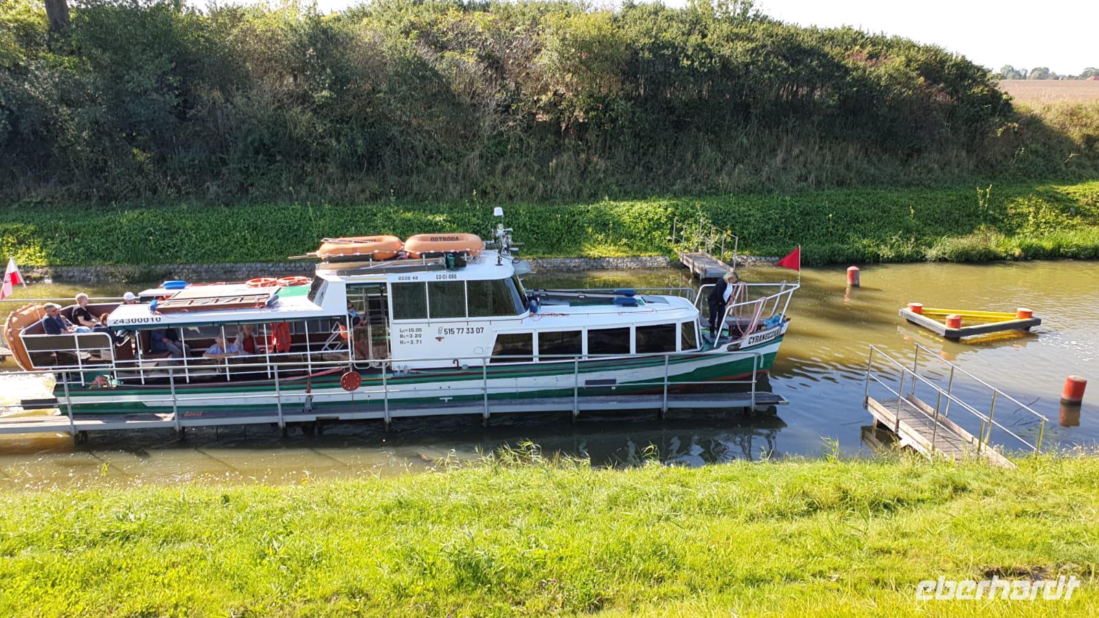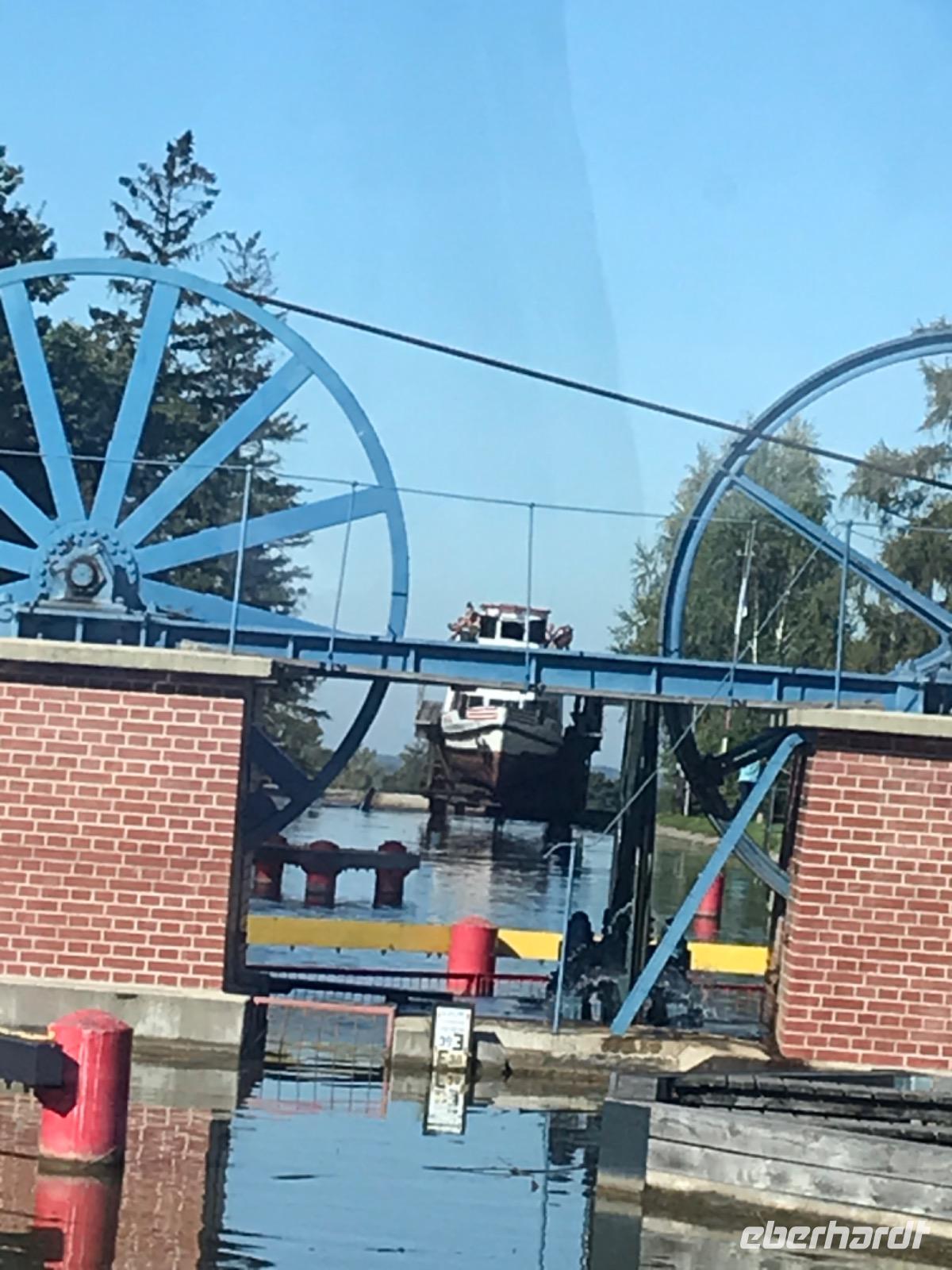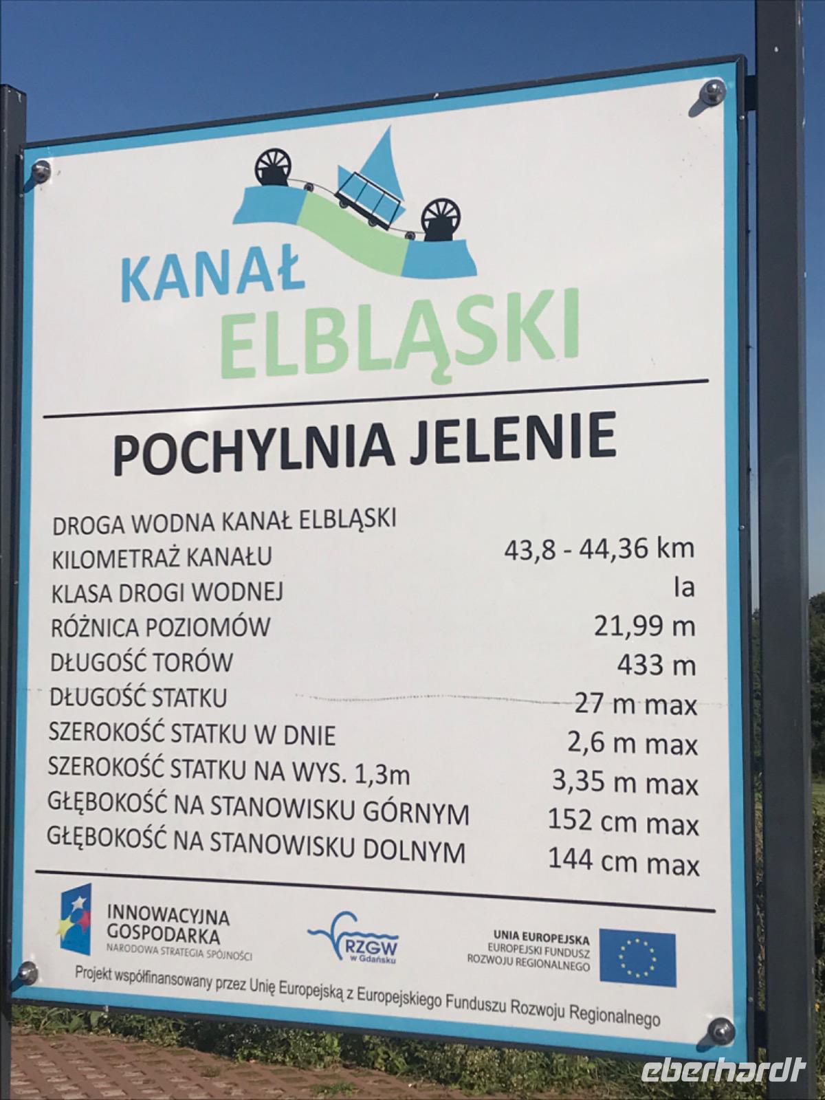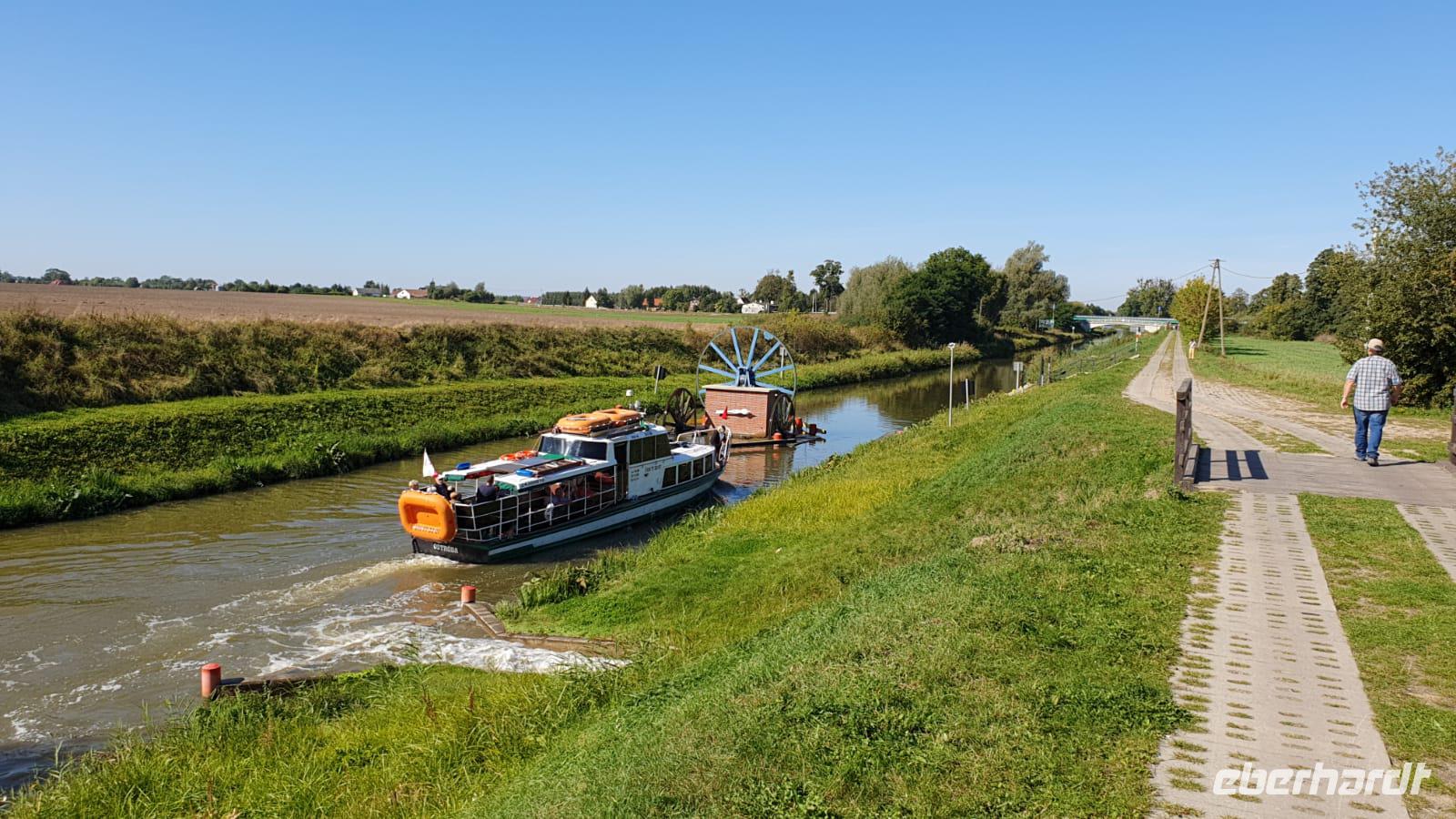 Wir freuten uns alle auf die Weiterfahrt. Die Masuren rufen und es werden heute für uns 250 km. Über Elbing, dem Wohnort von Jazek, der uns die ganze Reise begleitete und uns mit ganz viel Informationen versorgte, geht es nach Osterode(Ostroda) zum Oberlandkanal. Dies ist eine 130 km lange Schiffsverbindung, die Mitte des vorvorigen Jahrhunderts erbaut wurde um u.a. Osterode mit Elbing zu verbinden. Er diente überwiegend dem Transport von Holz und Getreide. Man verzichtete auf die vielen notwendig gewesenen teuren und zeitraubenden Schleusen und überwand den Höhenunterschied mittels fünf Rollberge. Diese sind mit wassergetriebenen Standseilbahnen ausgerüstet und überwinden insgesamt 99 Meter. Nach Fertigsetellung erreichte man lediglich eine Auslastung von 50%, da inzwischen andere Transportmittel (vor allem Eisenbahn) sich weiterentwickelt hatten. Vor etwa 40 Jahren übernahm die Stadt Osterode den Betrieb und entwickelt es zu einer sehr interessanten Attraktion.