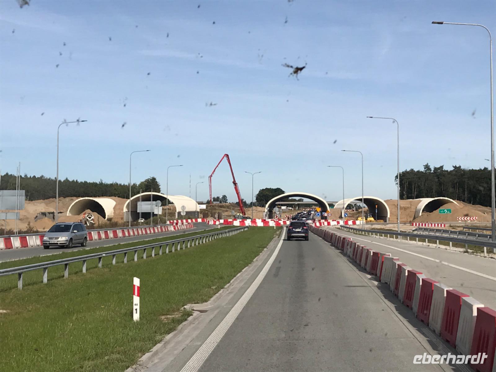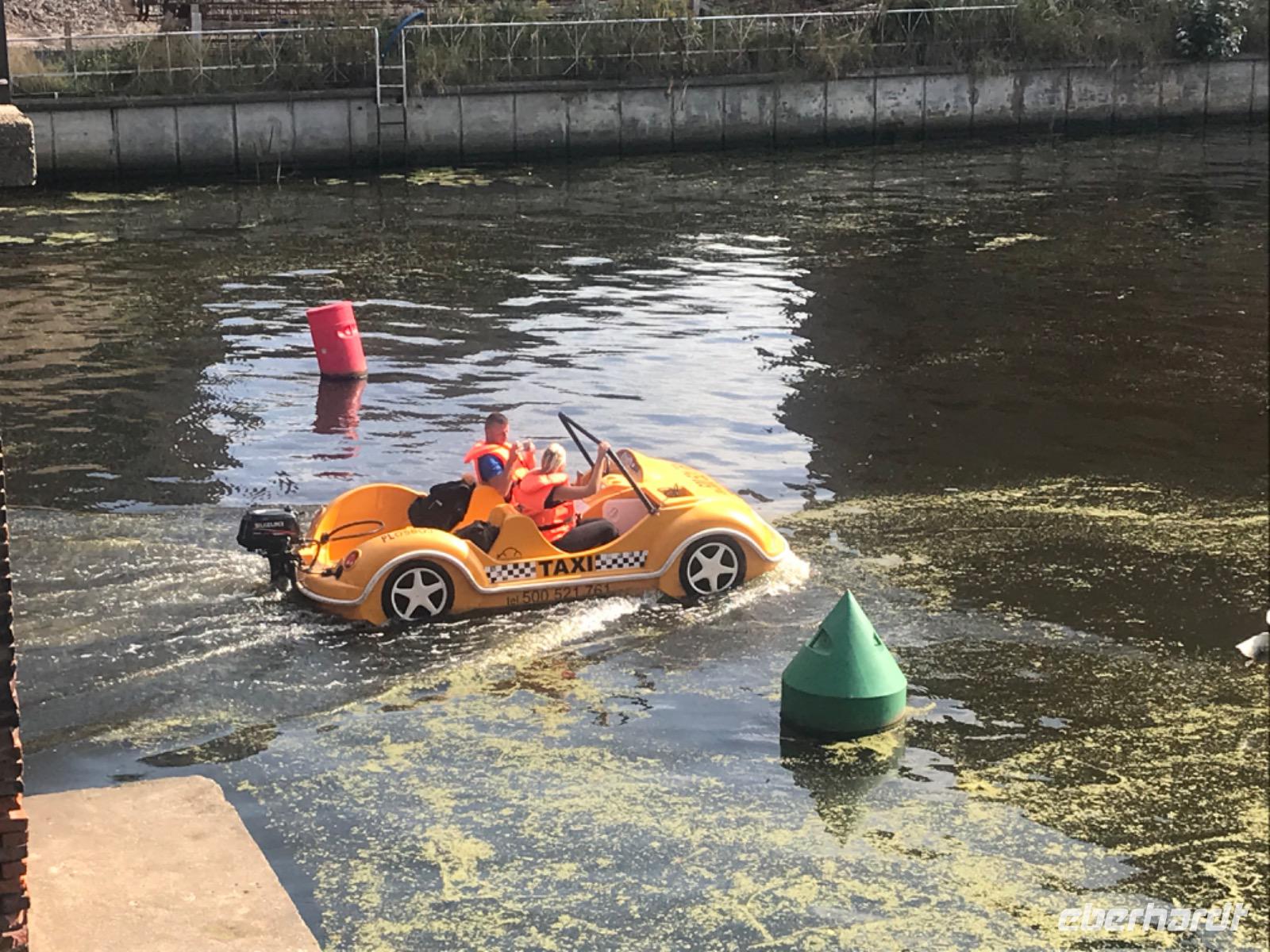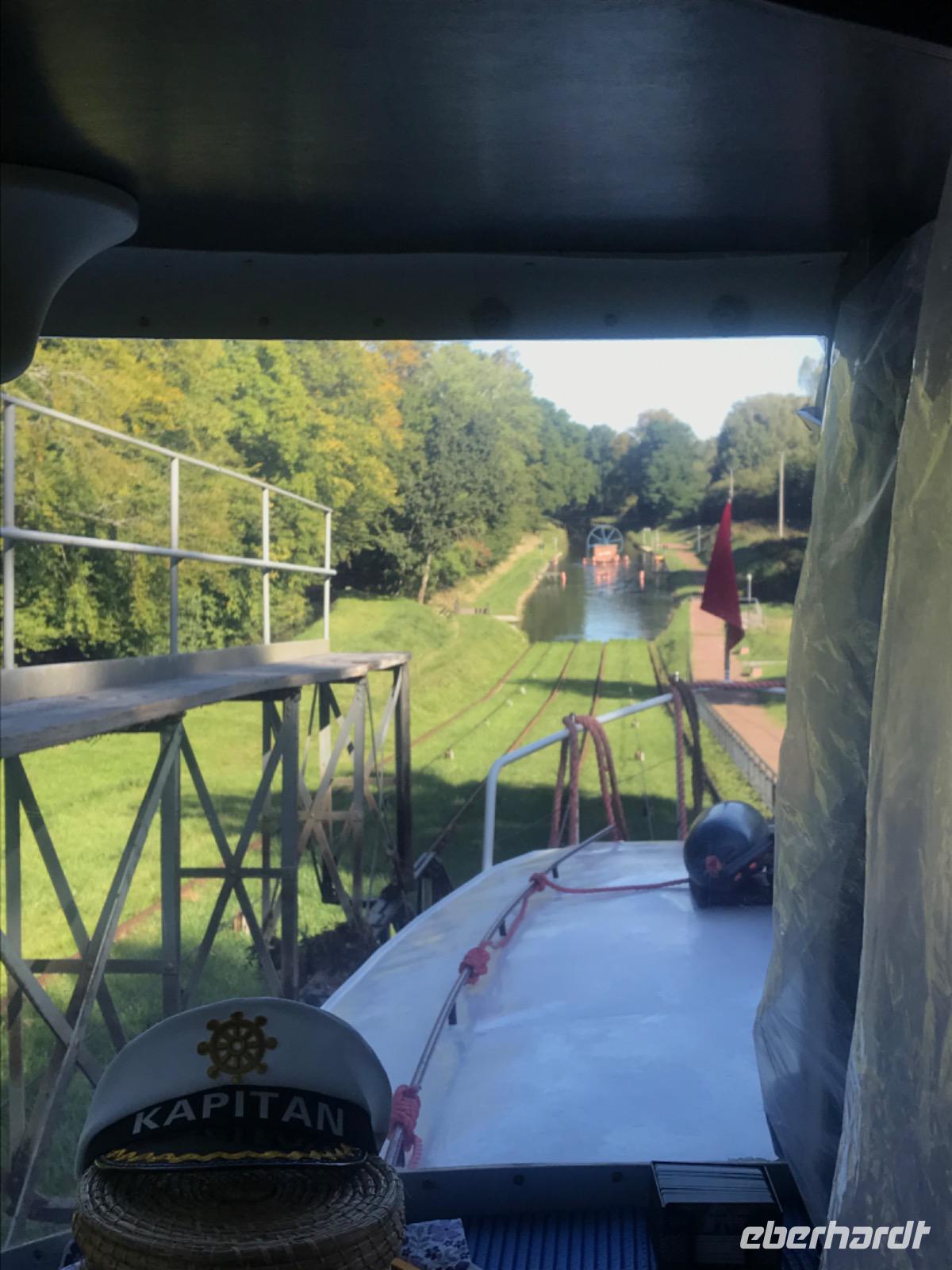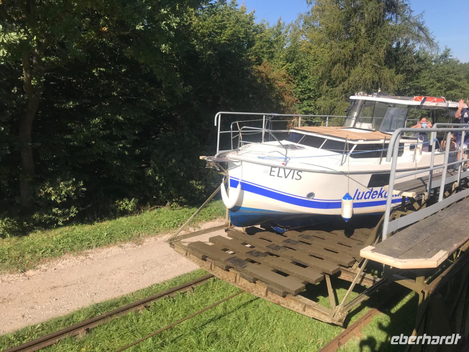 Wir freuten uns alle auf die Weiterfahrt. Die Masuren rufen und es werden heute für uns 250 km. Über Elbing, dem Wohnort von Jazek, der uns die ganze Reise begleitete und uns mit ganz viel Informationen versorgte, geht es nach Osterode(Ostroda) zum Oberlandkanal. Dies ist eine 130 km lange Schiffsverbindung, die Mitte des vorvorigen Jahrhunderts erbaut wurde um u.a. Osterode mit Elbing zu verbinden. Er diente überwiegend dem Transport von Holz und Getreide. Man verzichtete auf die vielen notwendig gewesenen teuren und zeitraubenden Schleusen und überwand den Höhenunterschied mittels fünf Rollberge. Diese sind mit wassergetriebenen Standseilbahnen ausgerüstet und überwinden insgesamt 99 Meter. Nach Fertigsetellung erreichte man lediglich eine Auslastung von 50%, da inzwischen andere Transportmittel (vor allem Eisenbahn) sich weiterentwickelt hatten. Vor etwa 40 Jahren übernahm die Stadt Osterode den Betrieb und entwickelt es zu einer sehr interessanten Attraktion.