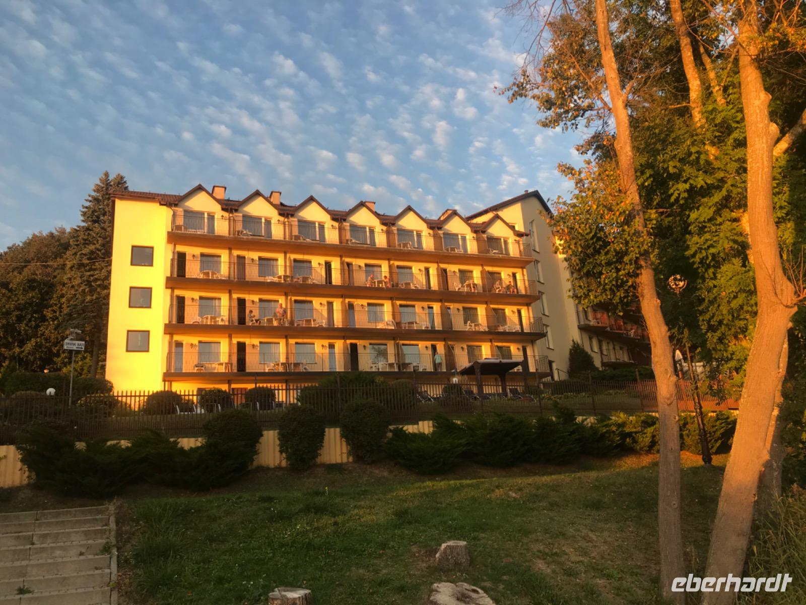 Auf der Heimfahrt verweilten wir noch kurz in dem schöne Örtchen Nikolaiken(Mikolajki-3.800 Einwohner). In Sensburg stiegen einige der Gäste etwas vor dem Hotel aus. Sie erwartete ein schöner einstündiger Spaziergang am See entlang zum Hotel. Der Reisebegleiter musste dann noch mit dem Busfahrer lecker polnische Würste nachkaufen, die viele frische Luft hatte dem Appettit der Gäste gut getan. Am Abend kam es noch zu einer anderen schönen Begegnung. Ein weiterer Eberhardtreisebus war im Nachbarhotel eingetroffen.
