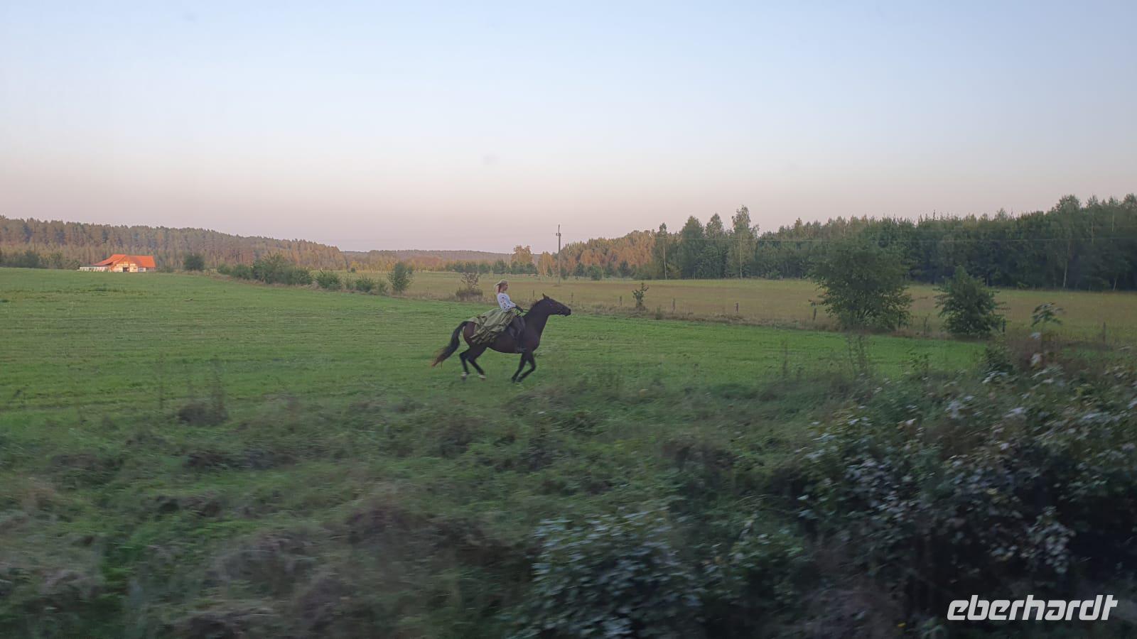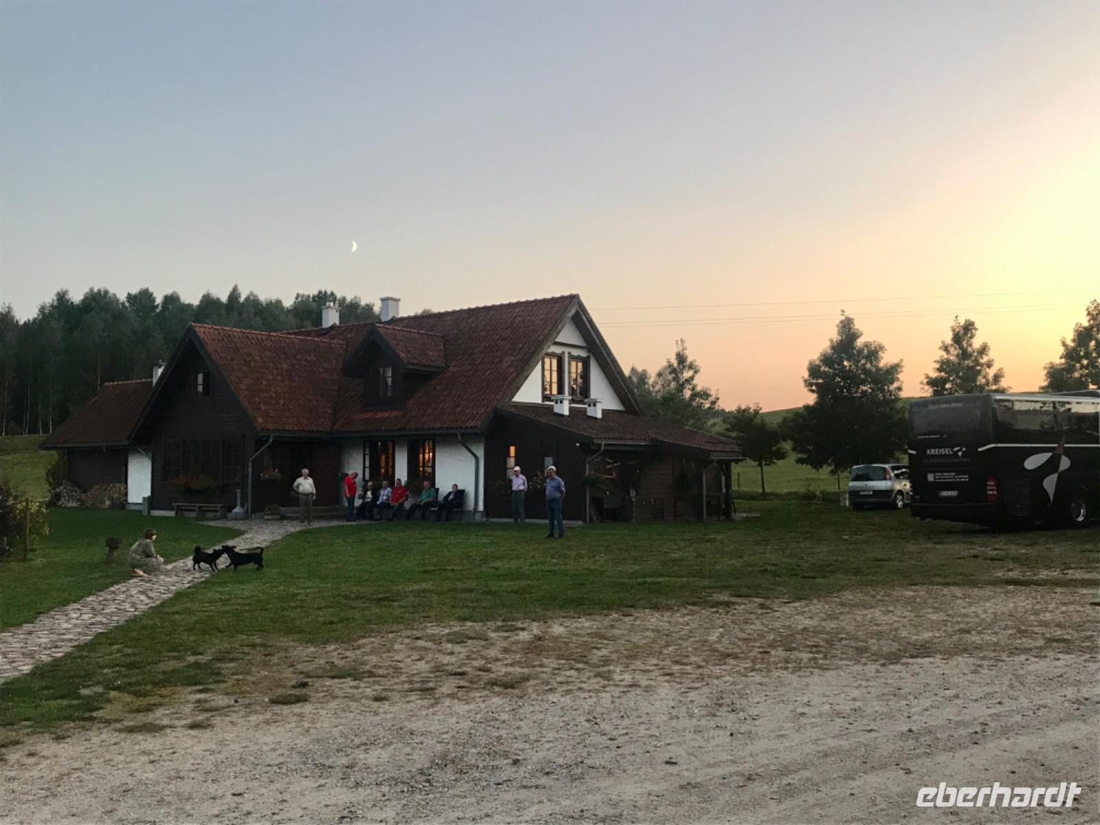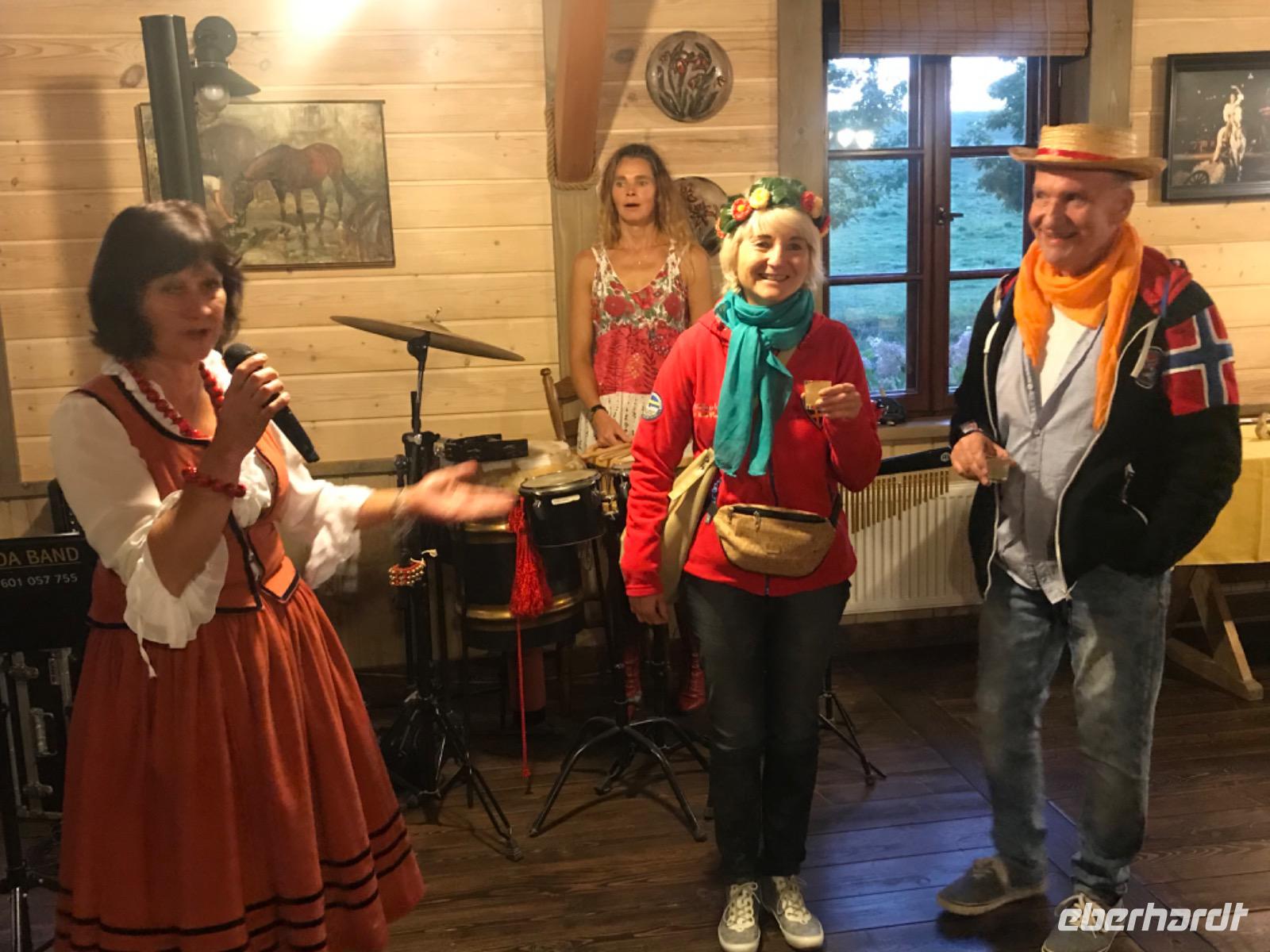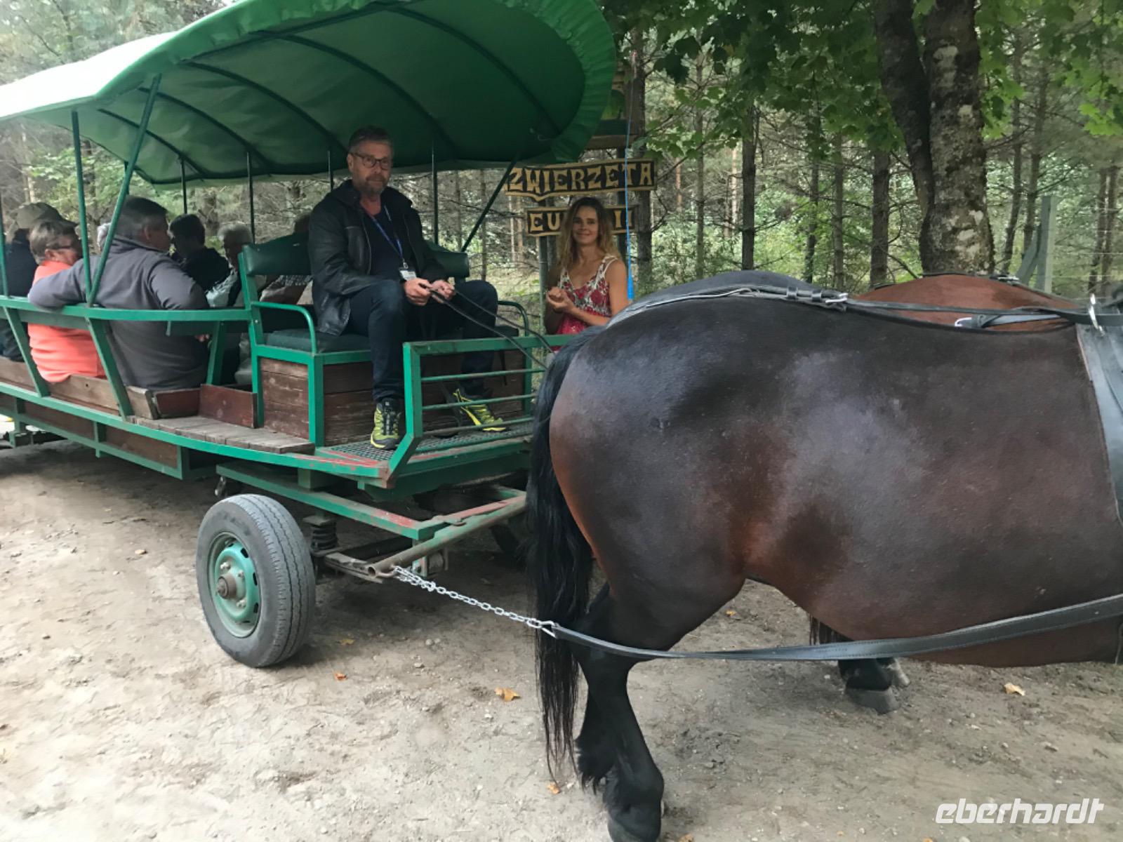 Dann erwarte uns der emotionale Höhepunkt der Reise. Wir besuchten den Gnadenhof von Eulalia. Empfangen wurden wir von ihrer Tochter. Auf ihrem Wallach begleitete sie die letzten Meter des Busses und führte mit ihrem Pferd gemeinsam einige Kunststück vor. Von der Chefin begrüßt ging es auf zwei Planenwagen durch den Wald. Wir hätten während der Fahrt keine Blumen, aber Pilze in Mengen ernten können. Auf dem 1998 gegründeten Hof angekommen, wurden wir von der Mannschaft und einer Reisegruppe aus dem Erzgebirge begrüßt. Ziel des Hofes war es ursprünglich Pferde vor dem Schlächter zu bewahren. Heute sind nicht nur Pferde auf dem Hof vorhanden und man hat sich zunehmend dem Tourismus verschrieben, auch um eine finanzielle Grundlage für den eigentlichen Zweck des Hofes zu schaffen. Masurische Bauernhochzeit sollte gefeiert werden und es wurde ein Paar aus unseren Reihen ausgewählt, was nach 41 Jahren eben schnell noch einmal heiraten durften. Lustige Spiele, Tanz, Polonaise und gutes Essen lies die Zeit wie im Fluge vergehen und 21:00 Uhr mussten wir dann leider aufbrechen.