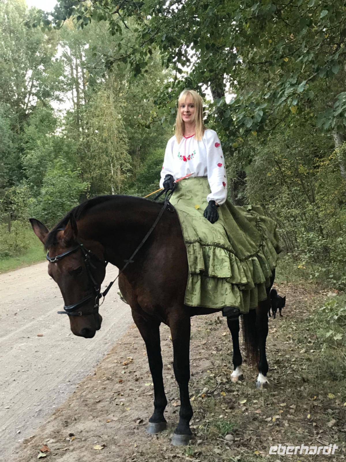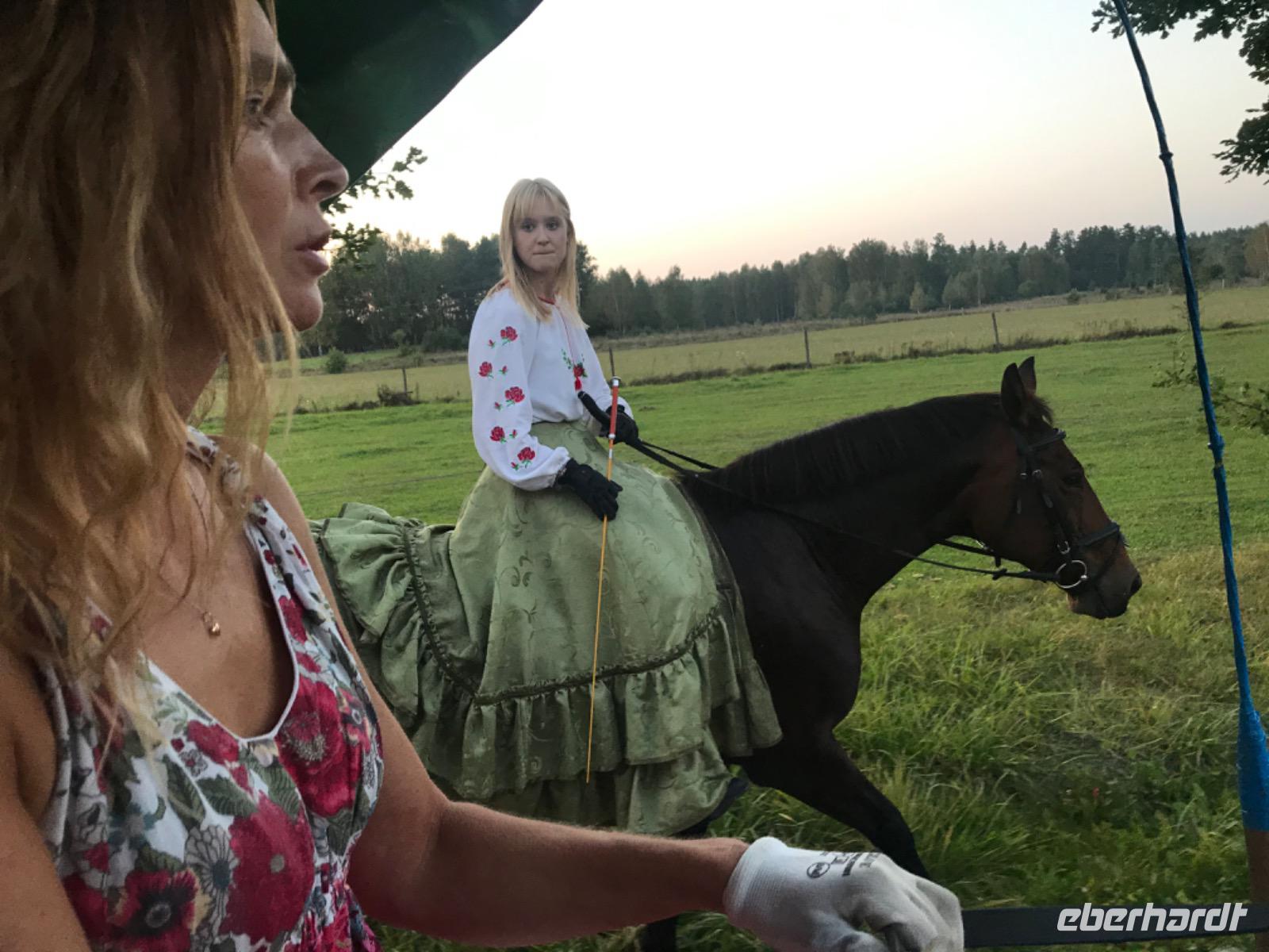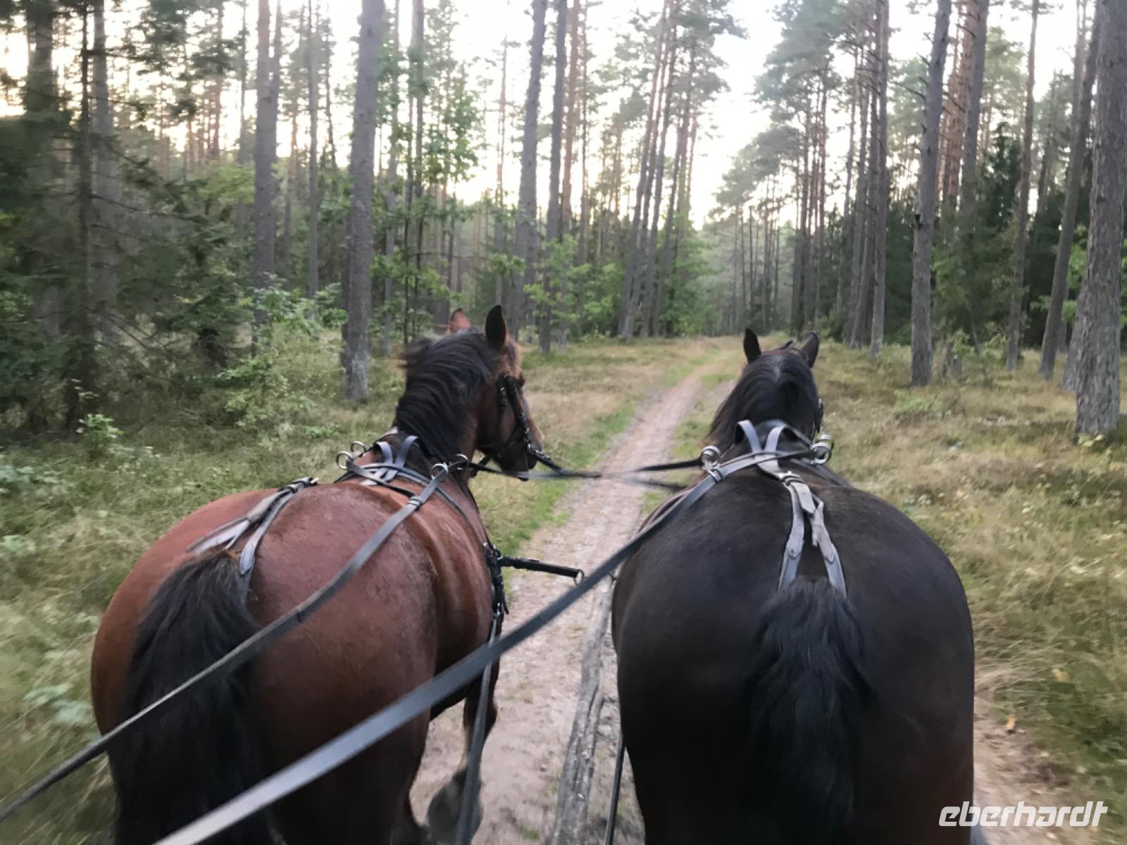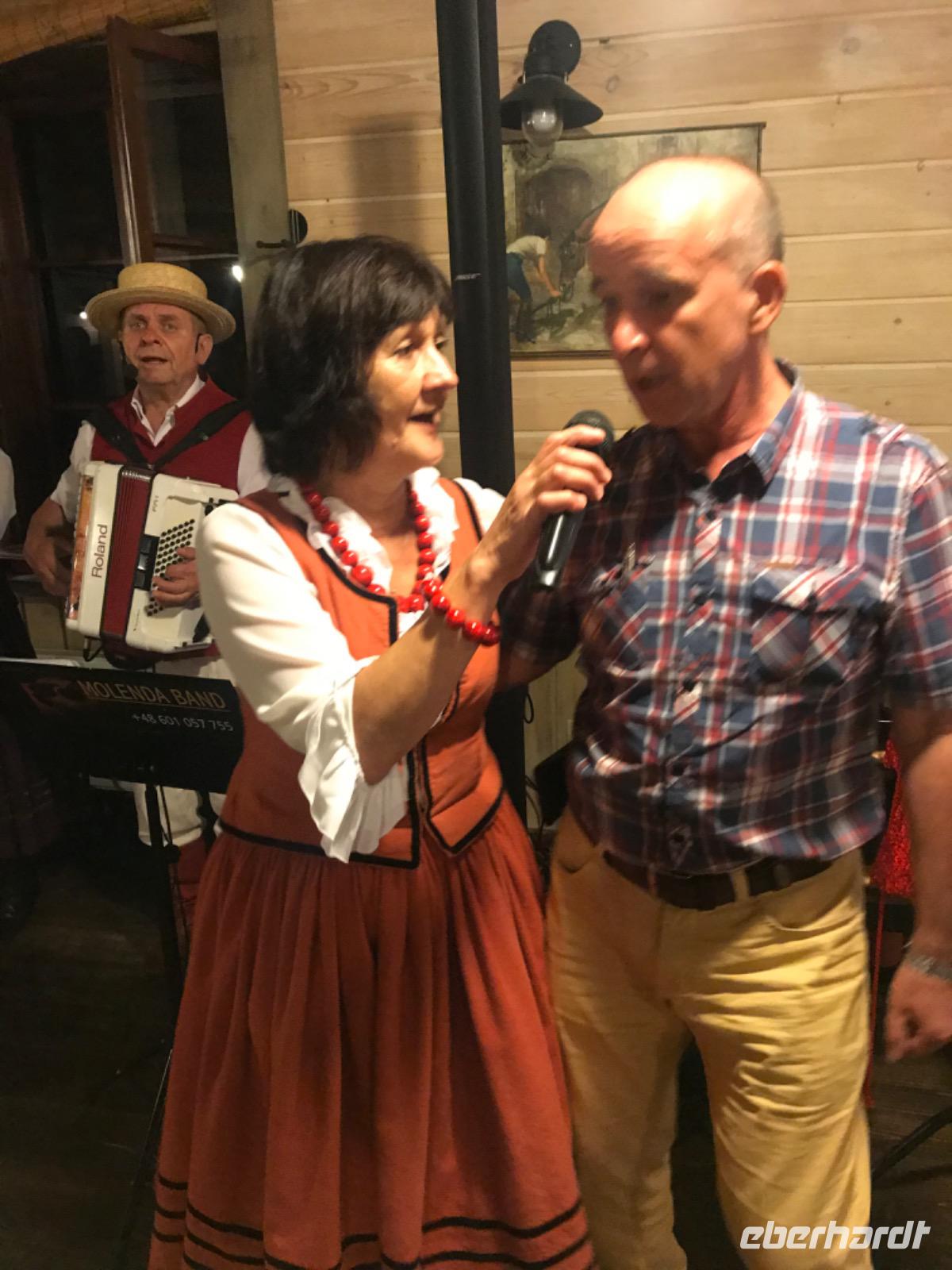 Dann erwarte uns der emotionale Höhepunkt der Reise. Wir besuchten den Gnadenhof von Eulalia. Empfangen wurden wir von ihrer Tochter. Auf ihrem Wallach begleitete sie die letzten Meter des Busses und führte mit ihrem Pferd gemeinsam einige Kunststück vor. Von der Chefin begrüßt ging es auf zwei Planenwagen durch den Wald. Wir hätten während der Fahrt keine Blumen, aber Pilze in Mengen ernten können. Auf dem 1998 gegründeten Hof angekommen, wurden wir von der Mannschaft und einer Reisegruppe aus dem Erzgebirge begrüßt. Ziel des Hofes war es ursprünglich Pferde vor dem Schlächter zu bewahren. Heute sind nicht nur Pferde auf dem Hof vorhanden und man hat sich zunehmend dem Tourismus verschrieben, auch um eine finanzielle Grundlage für den eigentlichen Zweck des Hofes zu schaffen. Masurische Bauernhochzeit sollte gefeiert werden und es wurde ein Paar aus unseren Reihen ausgewählt, was nach 41 Jahren eben schnell noch einmal heiraten durften. Lustige Spiele, Tanz, Polonaise und gutes Essen lies die Zeit wie im Fluge vergehen und 21:00 Uhr mussten wir dann leider aufbrechen.